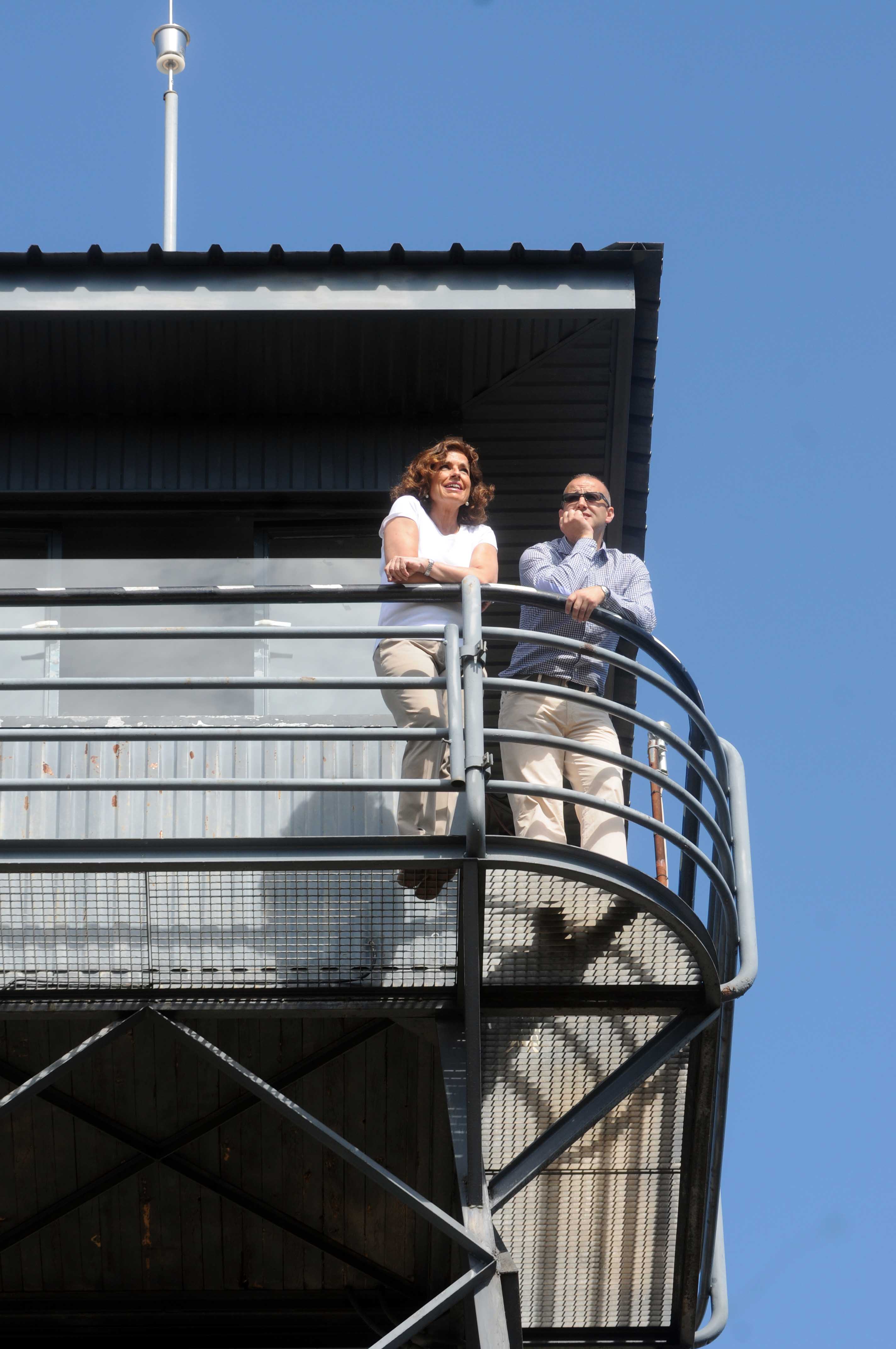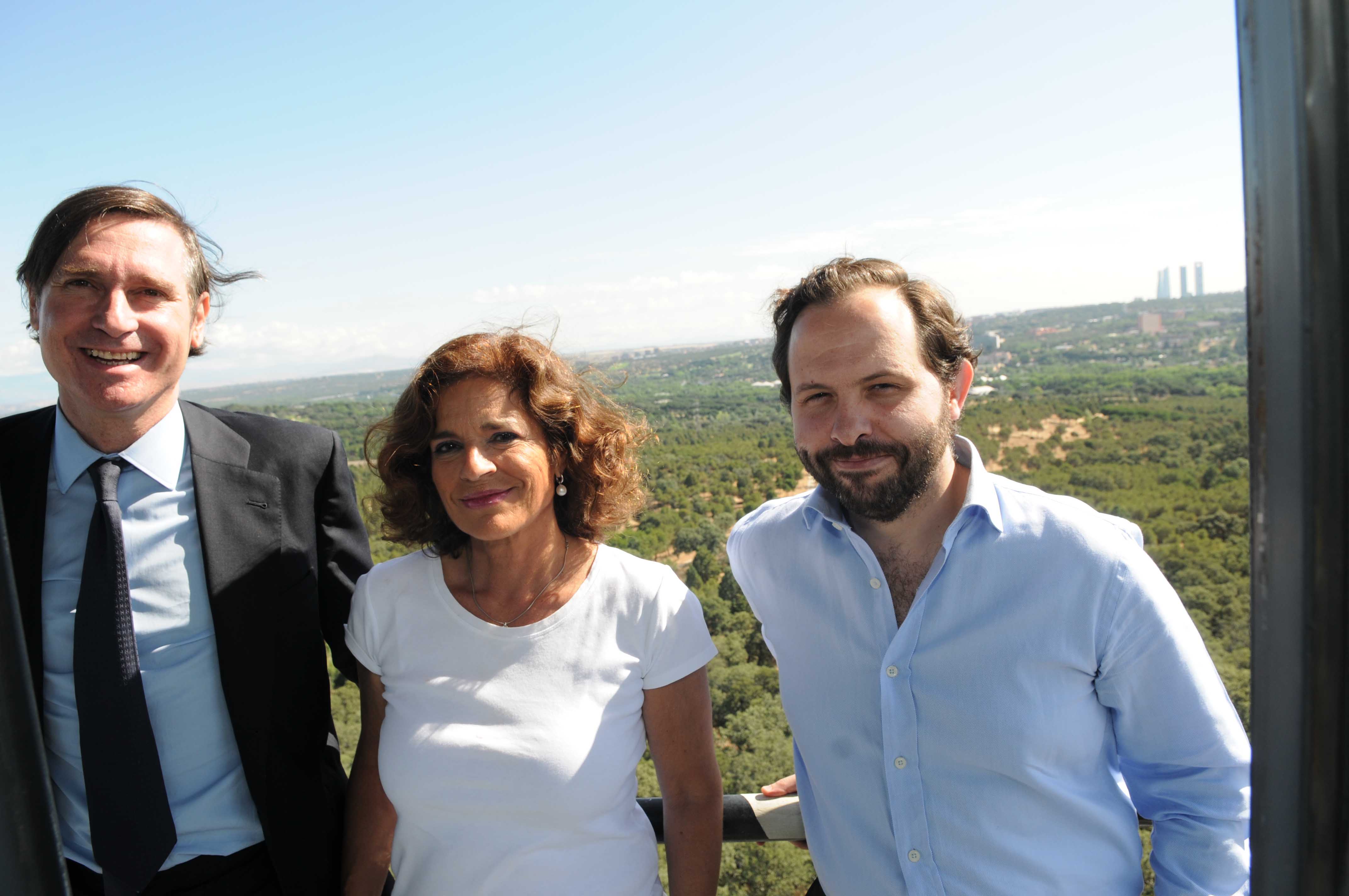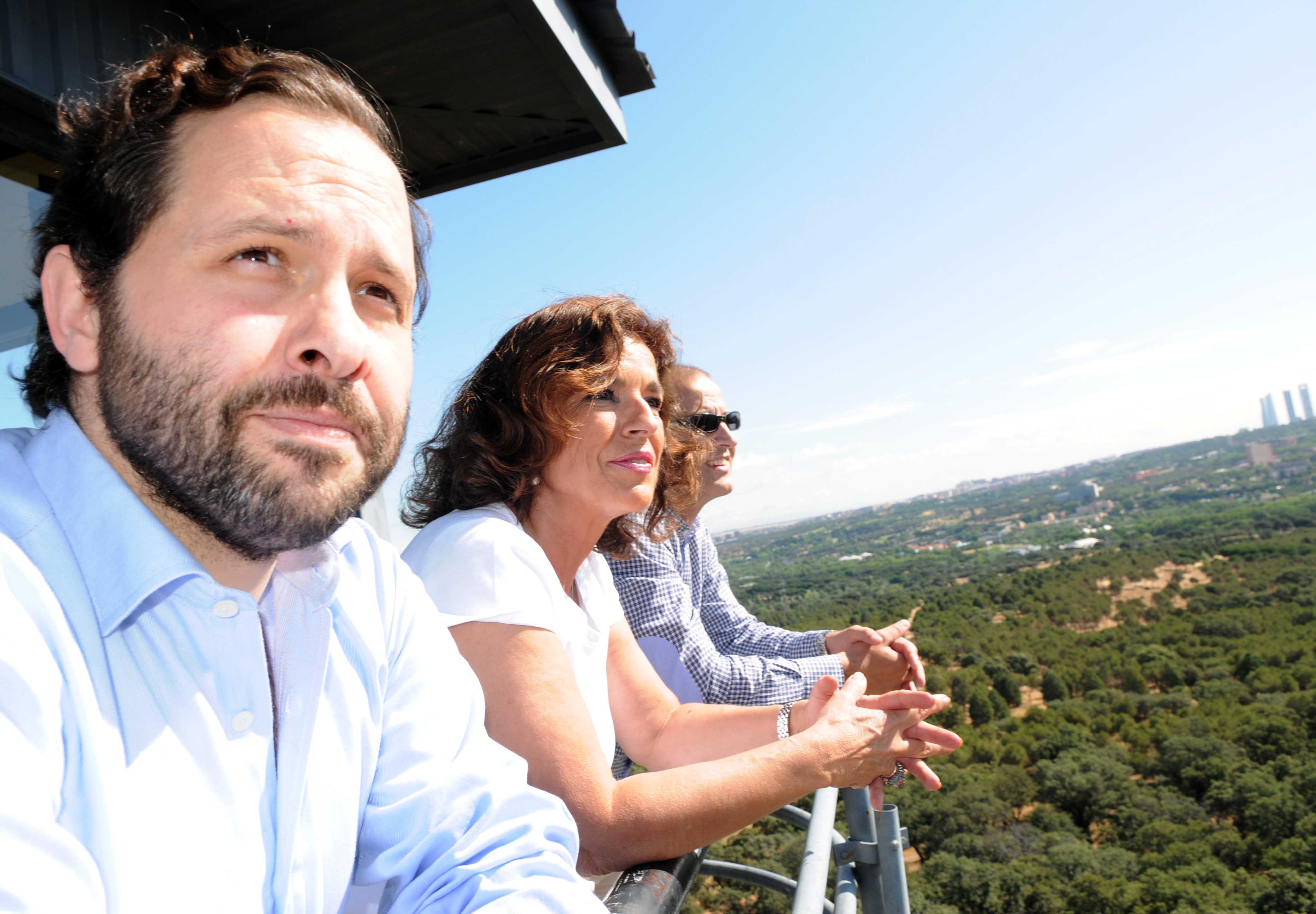 La alcaldesa de Madrid, Ana Botella, y el delegado de Medio Ambiente, Diego Sanjuanbenito, observan la Casa de Campo desde una de las torres de vigilancia de incendios de este parque forestal