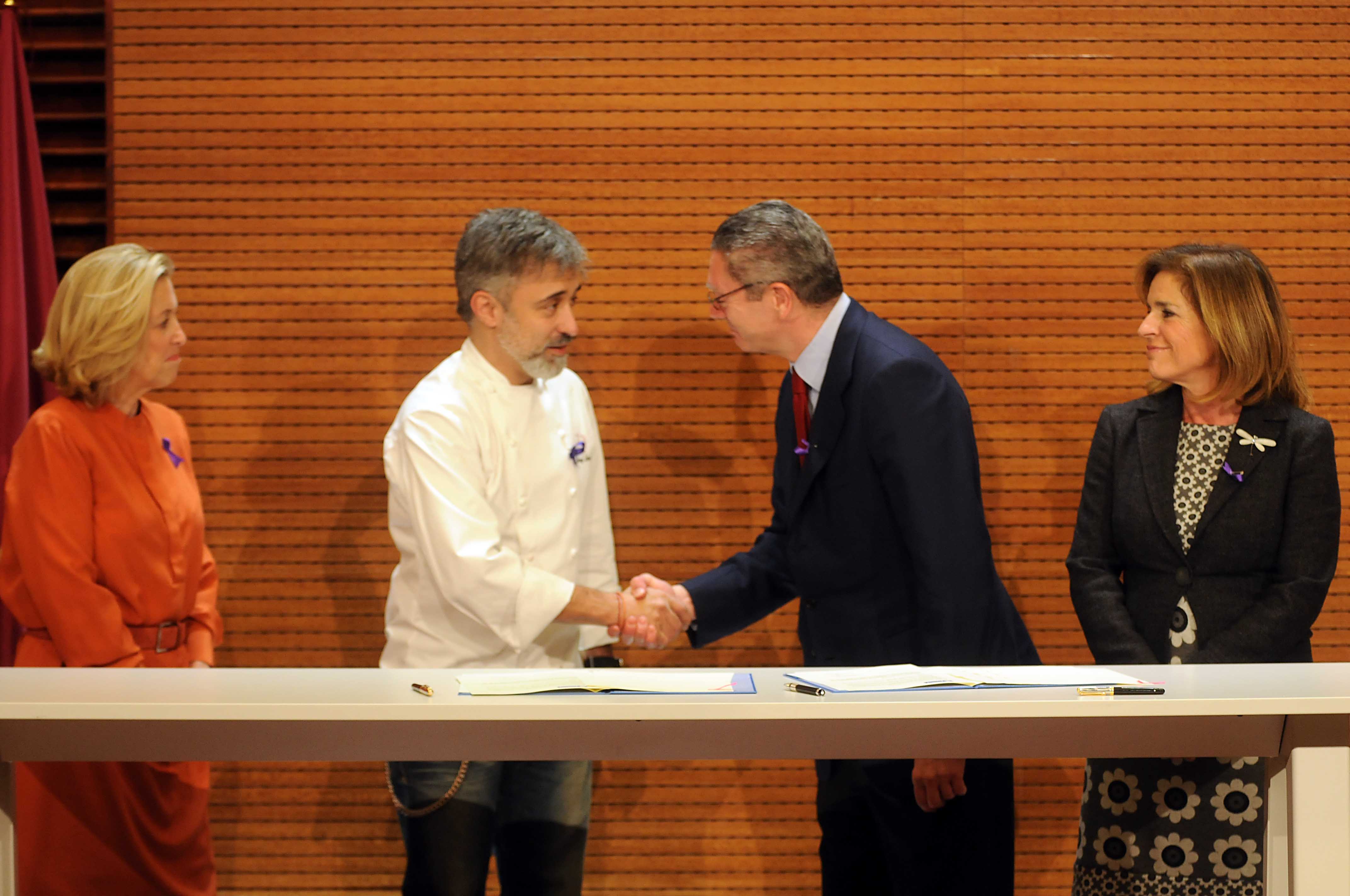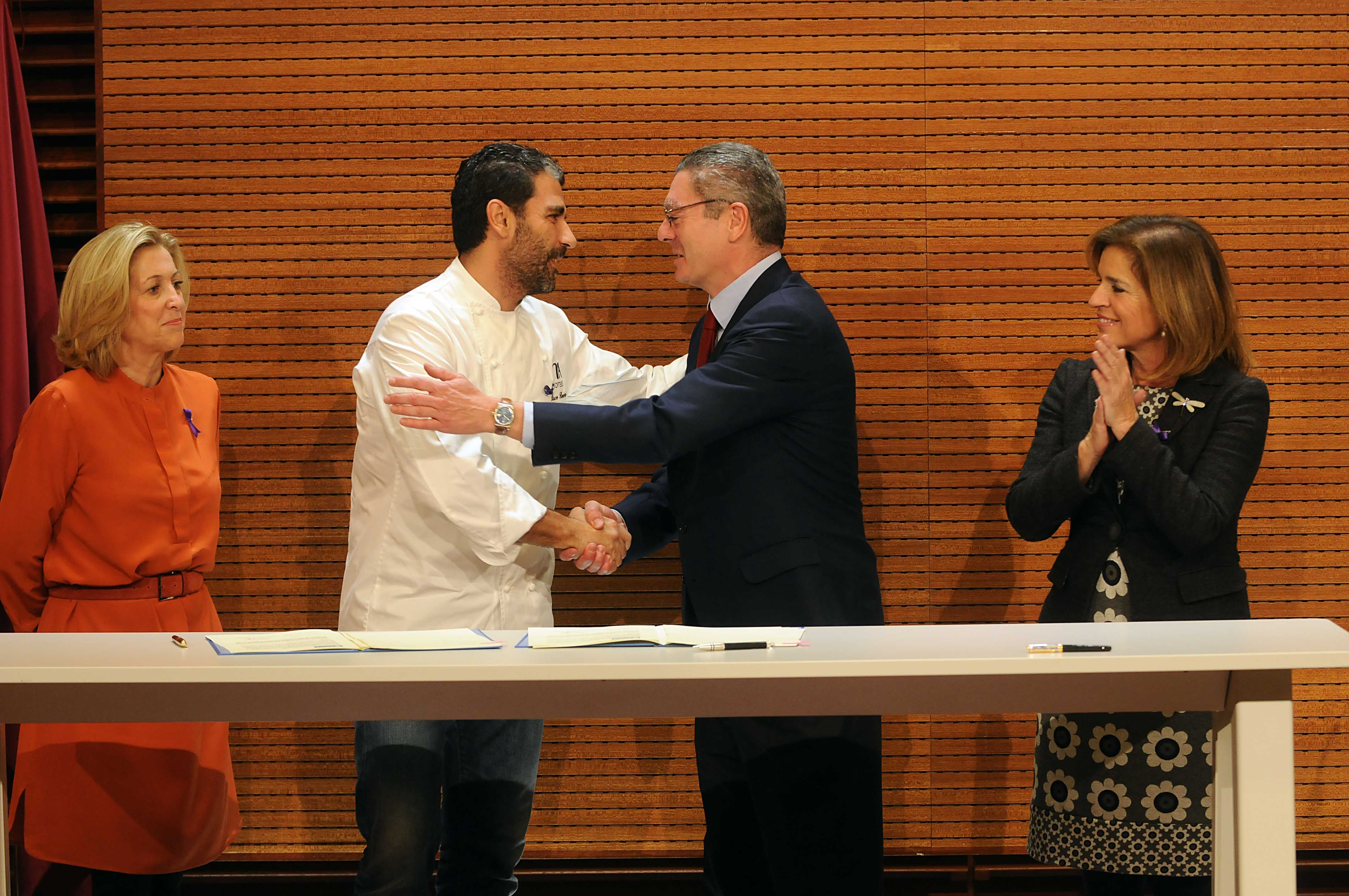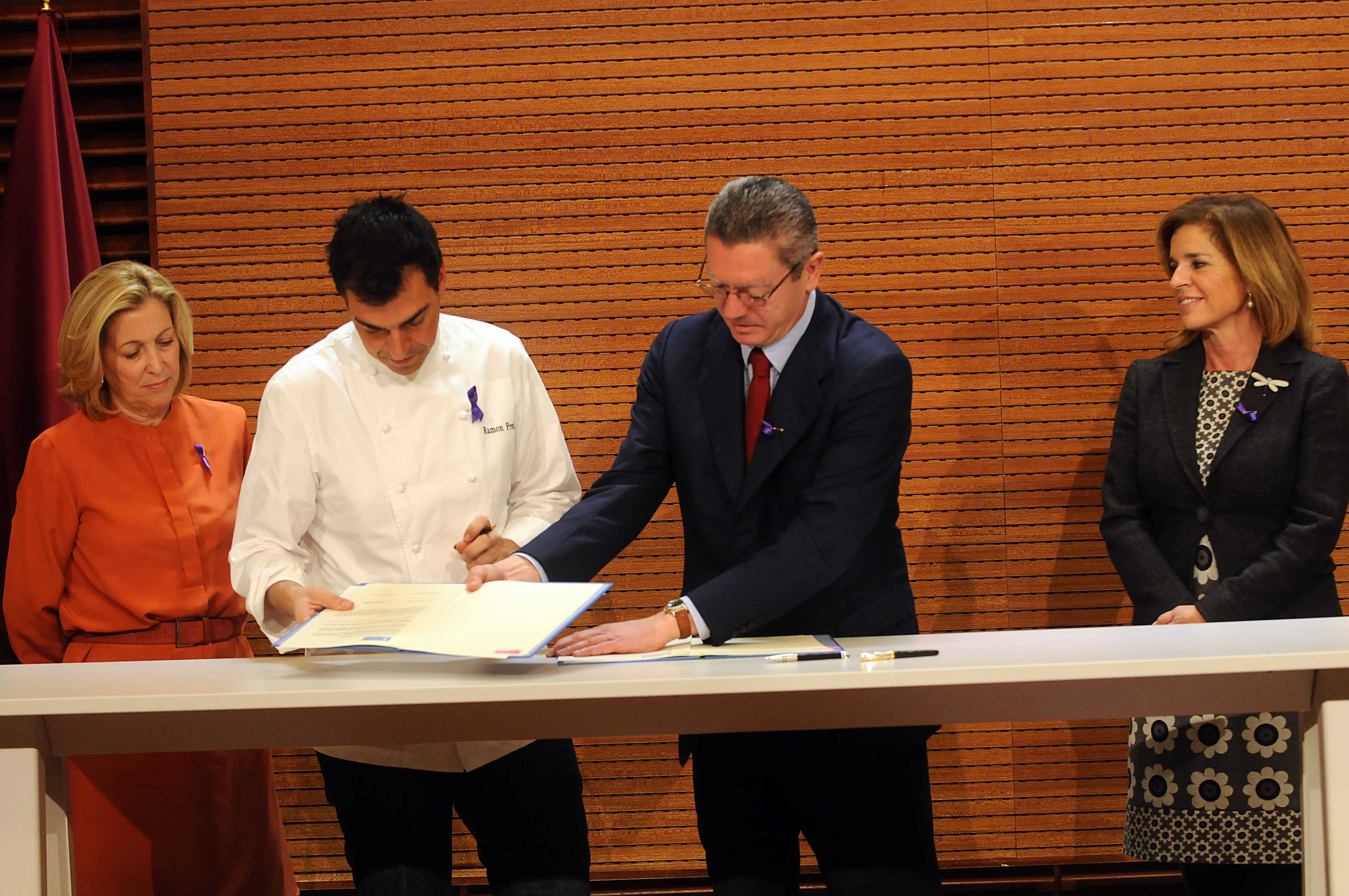 Los seis restaurantes madrileños con dos estrellas Michelín -Santceloni, de Oscar Velasco; la Terraza del Casino, de Paco Roncero; Sergi Arola Gastro; Ramón Freixa Madrid; Diverxo, de David Muñoz, y el Club Allard, de Diego Guerrero- han asumido el compromiso de preparar la cena de Nochebuena para las 89 mujeres que pasarán este día tan especial en los diferentes Centros de Alojamiento Protegido del Ayuntamiento de Madrid. Esta iniciativa se ha plasmado en un protocolo de colaboración firmado hoy por el alcalde, Alberto Ruiz-Gallardón, la delegada de Familia y Servicios Sociales, Concepción Dancausa, y los seis chefs Michelin.