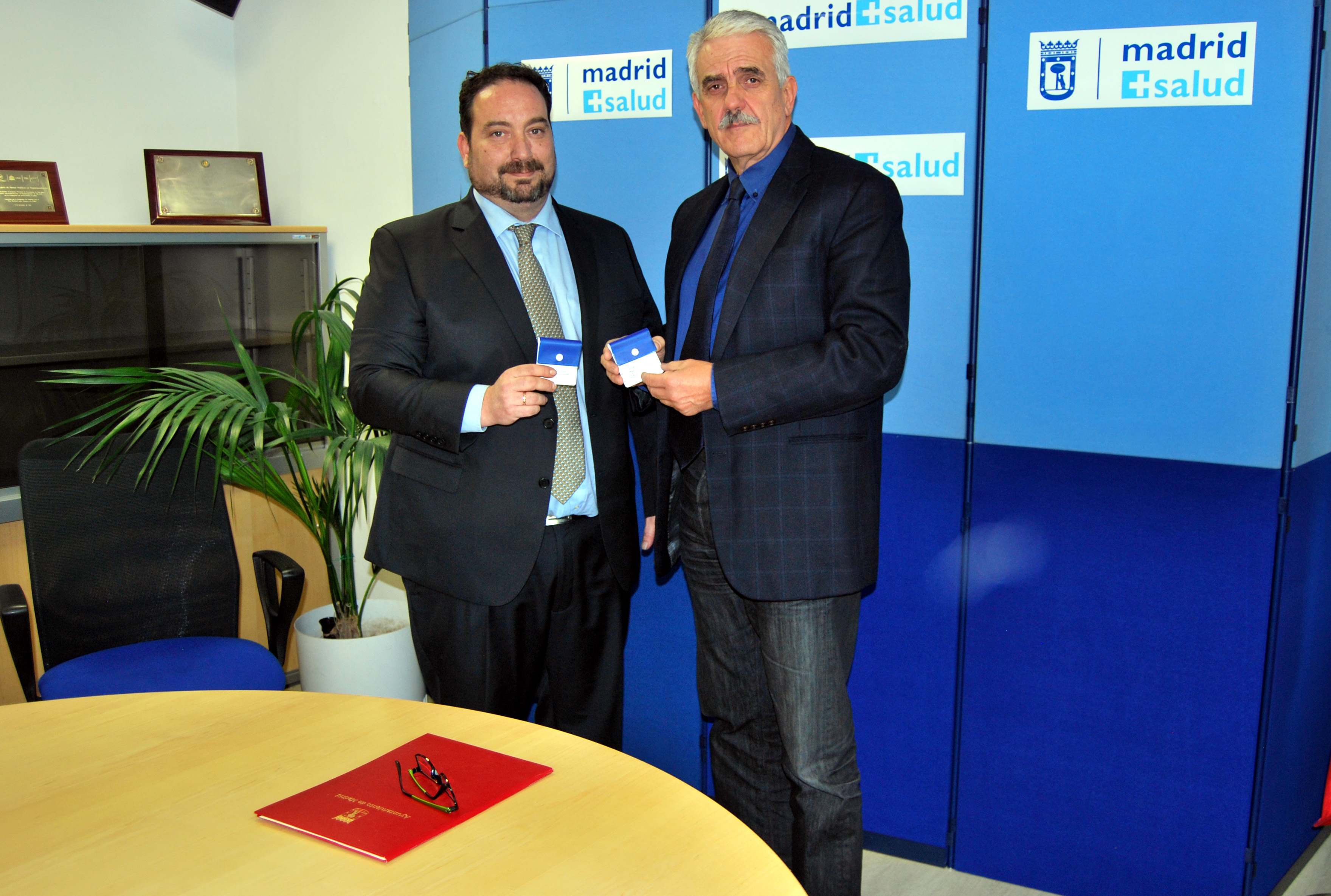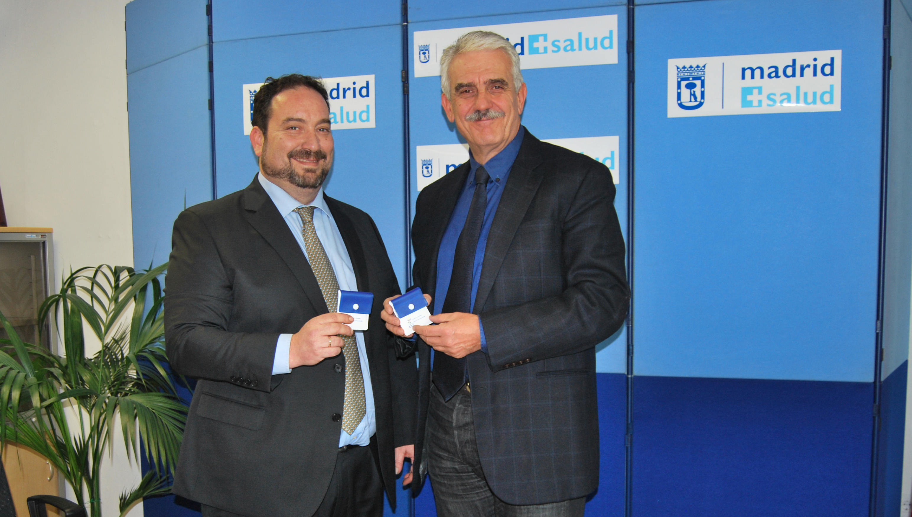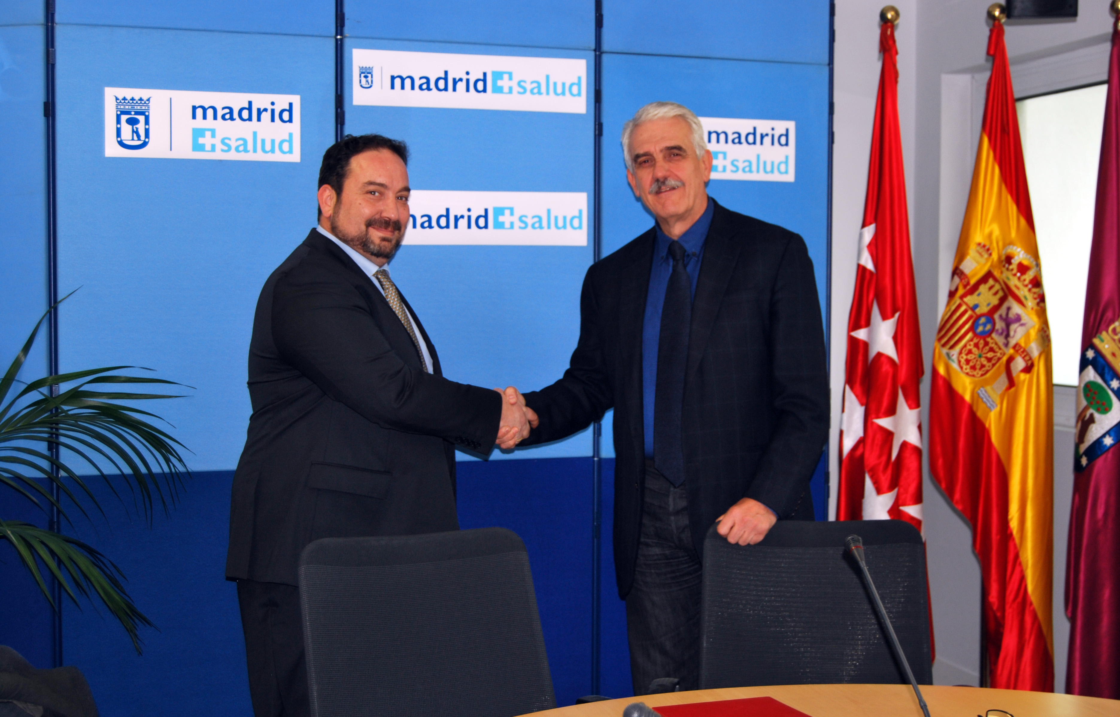 El gerente del Organismo Autónomo Madrid Salud, Antonio Prieto (a la derecha) y el presidente de la Asociación de Vendedores Profesionales de Prensa, Javier Larrea, tras la firma del convenio entre ambas entidades, en la sede de Madrid Salud.