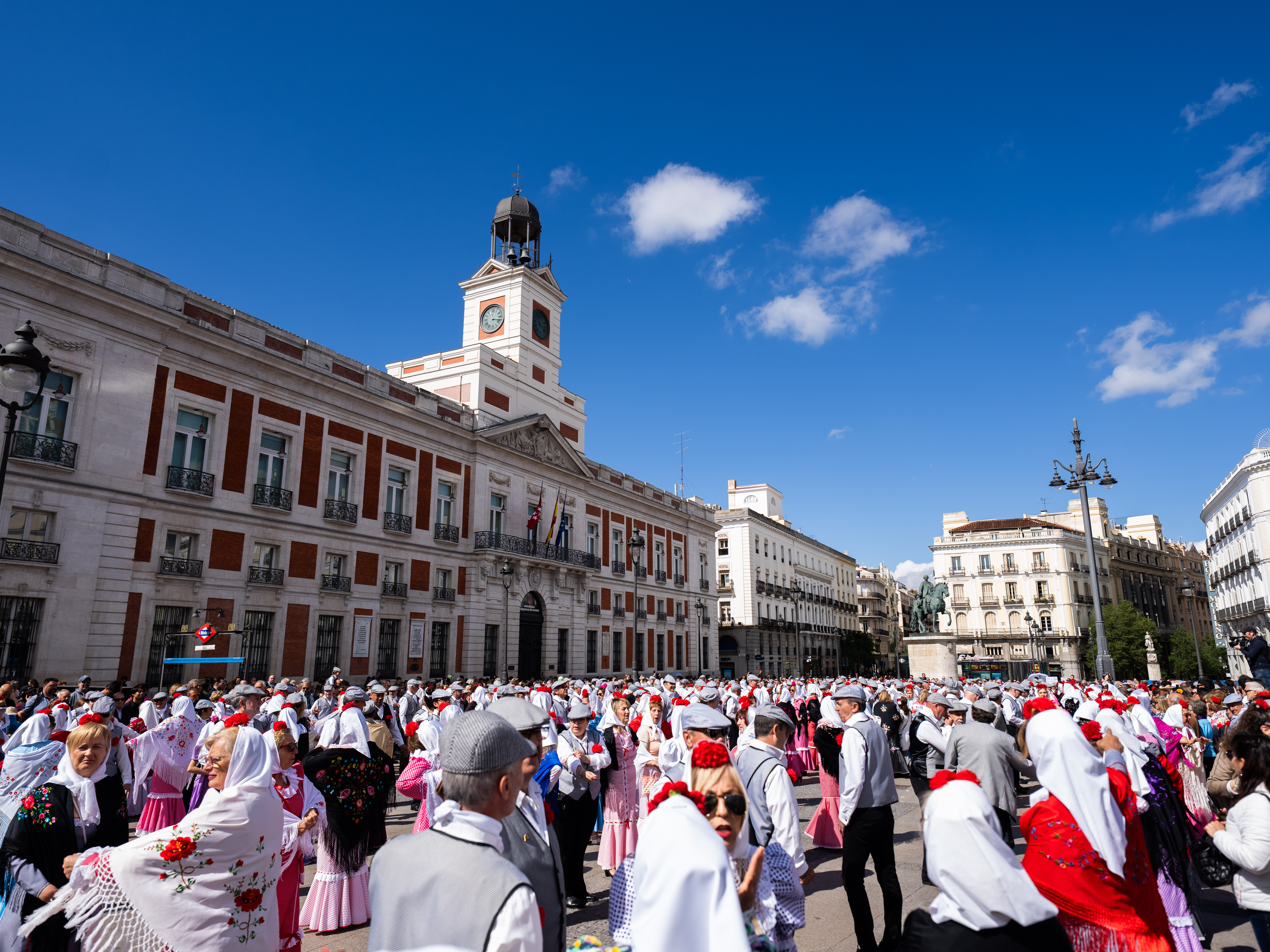 Organizado por la Academia de Bailes de Salón Date un Respiro con la colaboración de la Banda de Música de Moratalaz, el pasacalles ha partido de la Puerta del Sol hasta la plaza de Oriente, llenando las calles de tradición, color y ritmo, con más de 450 chulapos y chulapas. Participantes de todas las edades, ataviados con los trajes típicos, han bailado al son de chotis, pasodoble, java y swing en un ambiente festivo y participativo que ha animado a madrileños y visitantes a unirse a la celebración.
