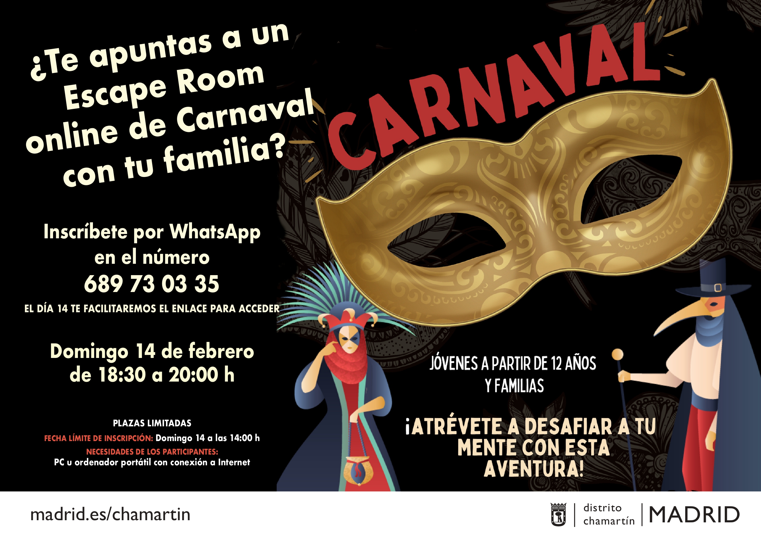 El domingo 14, de 18:30 h a 20:00 h, se celebrará el escape room online de carnaval, una aventura en la que los participantes tendrán que resolver una serie de enigmas guiados por un maestro de juego. Es una iniciativa destinada a público juvenil a partir de 12 años y familias. El número de participantes es limitado. Para inscribirse es necesario contactar a través del número de WhastsApp 689 730 335. El día 14 se facilitará el enlace para comenzar a jugar. Para ello es preciso contar con un PC u ordenador portátil con conexión a internet.