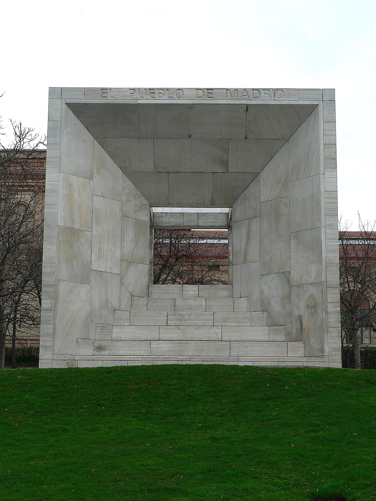 El monumento fue resultado del proyecto presentado por el arquitecto Miguel Ángel Ruíz Larrea, consistente en un cubo de piedra caliza abocinado isótropo, minimalista y evocador de una idea de apertura y racionalidad. La decisión del proyecto ganador corrió a cargo de un jurado de calidad, compuesto por los escultores Eduardo Chillida, Pablo Serrano y Lucio Muñoz y por los arquitectos Francisco Javier Sainz de Oiza y Julián Gallego. /