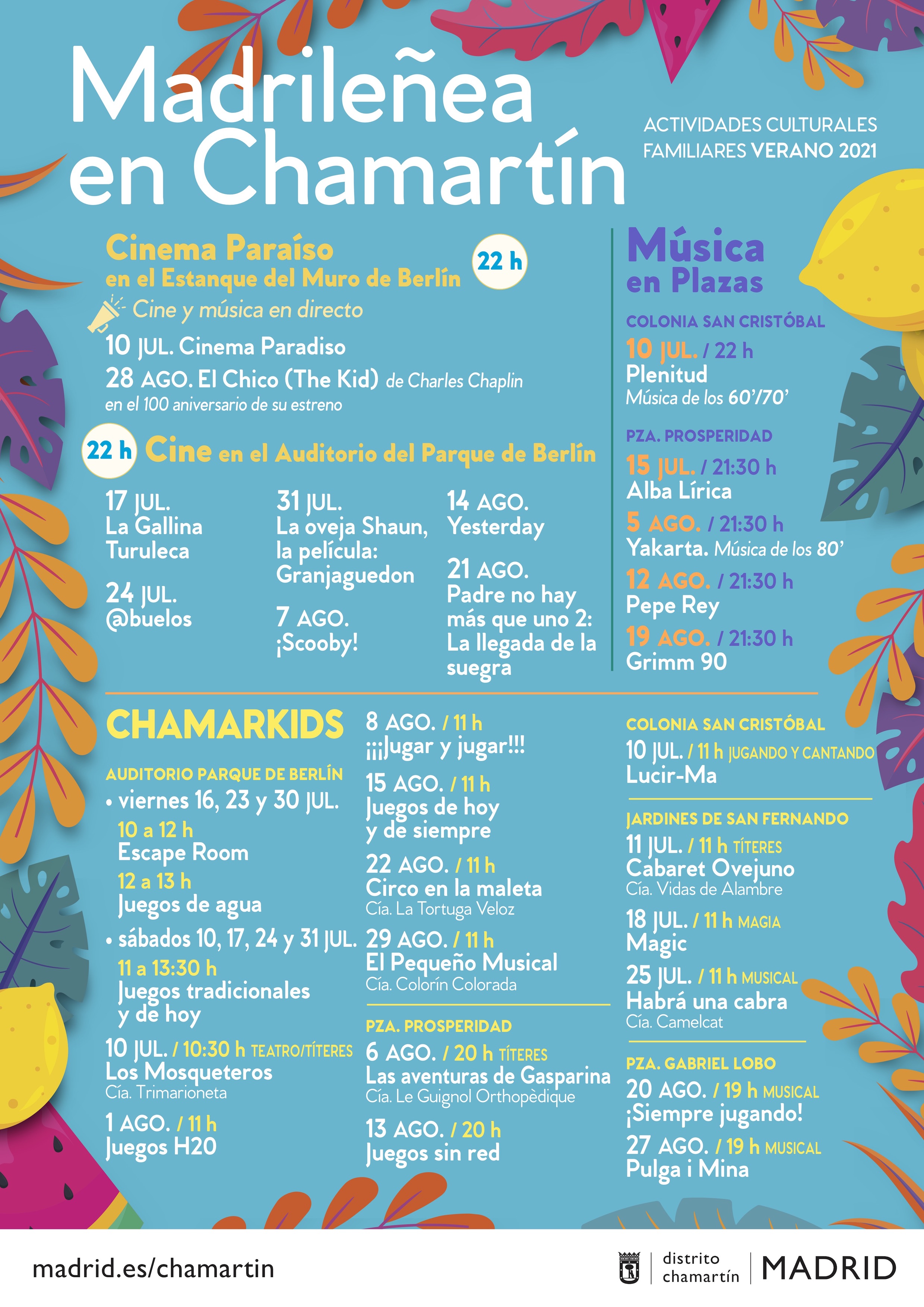 El público infantil tendrá una cita todos los sábados de julio y domingos de agosto con ChamarKids, una serie de actividades diseñadas en diferentes puntos del distrito en la que se mezclan, en inglés, juegos tradicionales con los de hoy para fomentar el bilingüismo desde edades tempranas. En concreto, los viernes 16, 23 y 30 de julio con escape room y juegos de agua y los sábados de julio y los domingos de agosto con juegos tradicionales en el parque de Berlín.