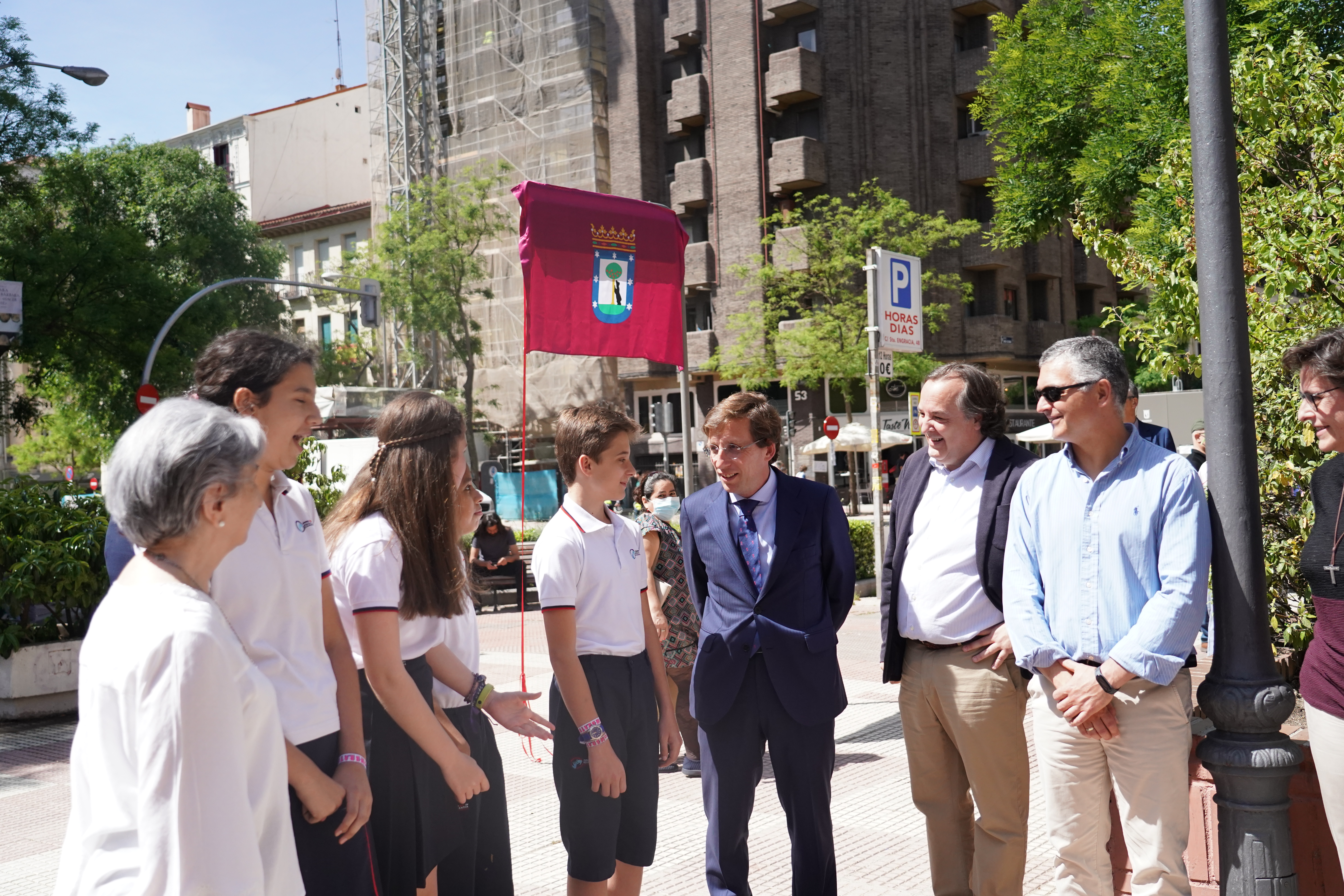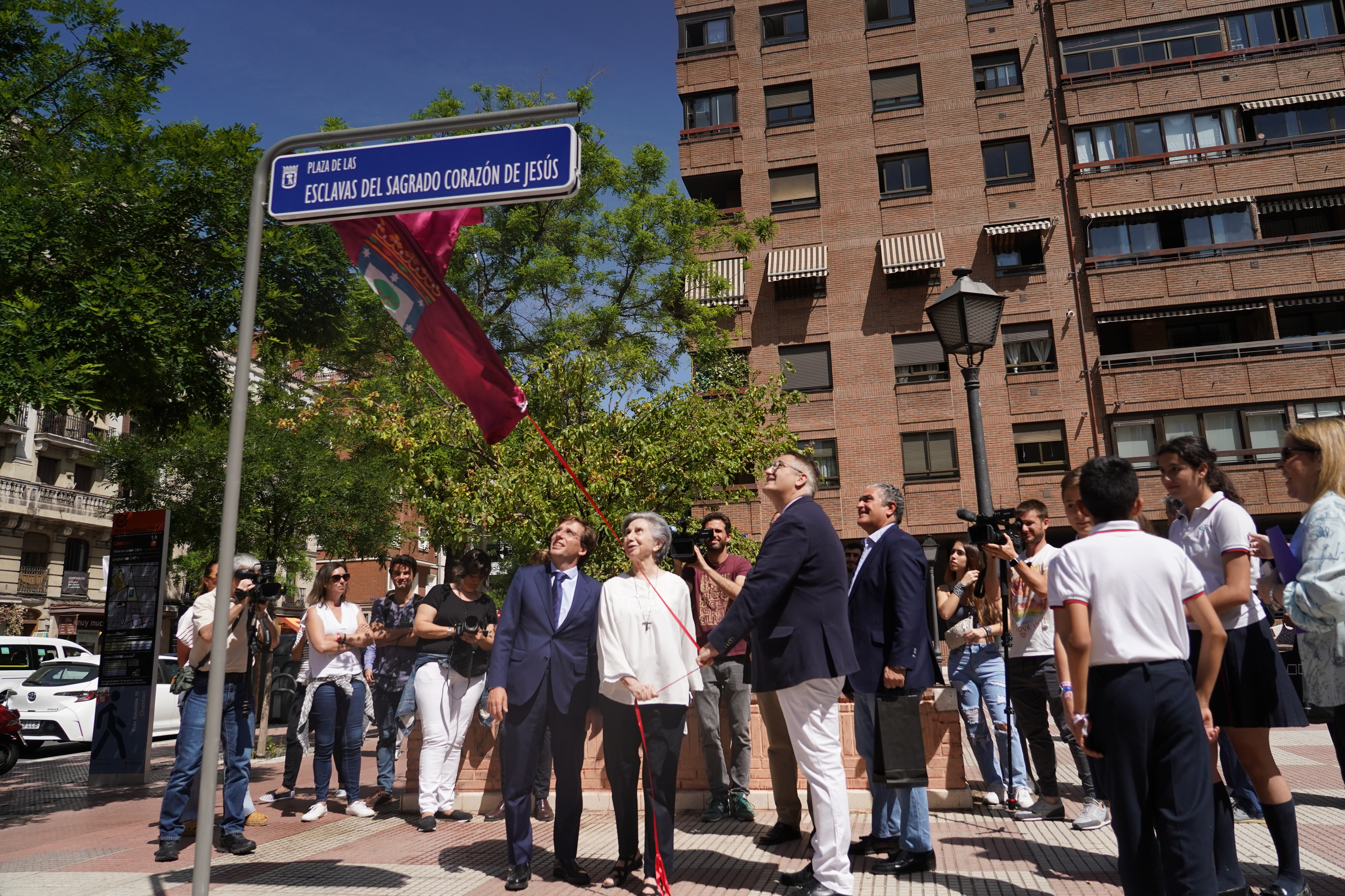 El distrito de Chamberí cuenta desde hoy con una nueva plaza, la de las Esclavas del Sagrado Corazón de Jesús, un espacio de cerca de 2.000 m2 que hasta ahora no tenía denominación y en el que se sitúa el colegio del mismo nombre. El alcalde de Madrid, José Luis Martínez-Almeida, acompañado del concejal del distrito, Javier Ramírez, ha participado este mediodía en su inauguración y ha agradecido al colegio “la aportación social y educativa” que ha realizado a la ciudad de Madrid durante más de un siglo, “en el que han pasado por sus aulas más de 100.000 estudiantes”. El acto, durante el que se ha descubierto una placa con el nuevo nombre de la plaza, ha contado con la presencia de la superiora general de la orden religiosa, la hermana Rosario Fernández-Villarán; el director del colegio, Alfonso Saz, así como escolares y vecinos de la zona.
