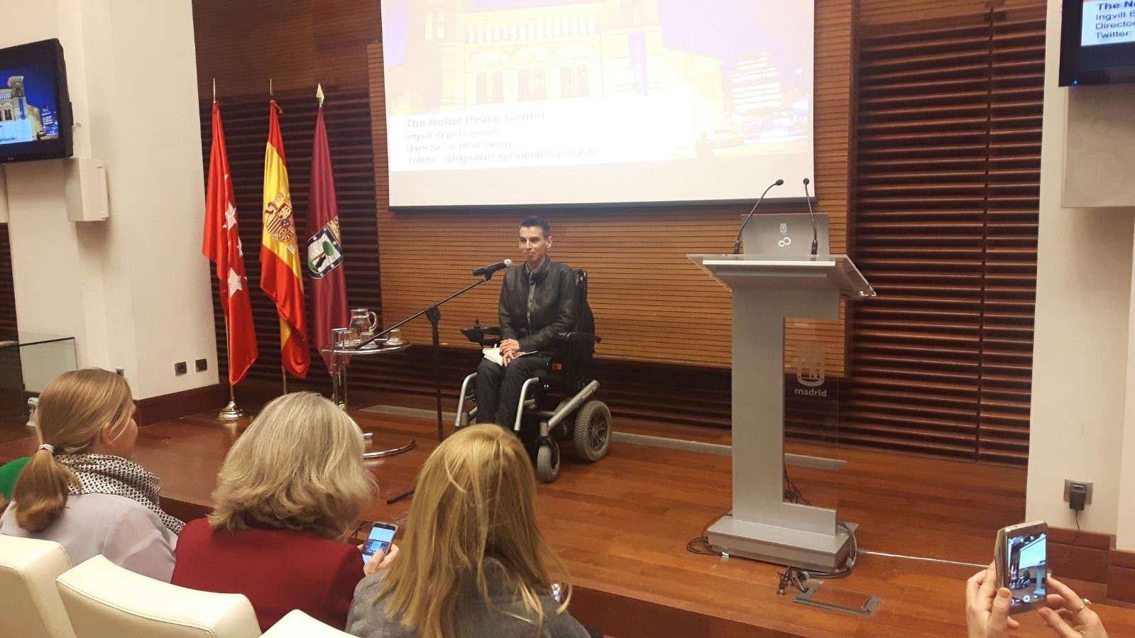 La Directora de Comunicación del Centro Nobel de la Paz, Ingvill Bryn Rambol, ha pronunciado esta tarde una conferencia en el Salón de Actos del Palacio de Cibeles bajo el título ‘Mujeres y el Premio Nobel de la Paz’. El Delegado del Área de Gobierno de Participación Ciudadana, Transparencia y Gobierno Abierto, Pablo Soto, ha sido el encargado de dar la bienvenida institucional a la delegación noruega que acompaña a Bryn Rambol, así como al resto de invitados entre los que se encontraban representantes de las embajadas Francesa, Checa, y Kenia, entre otras personalidades.
