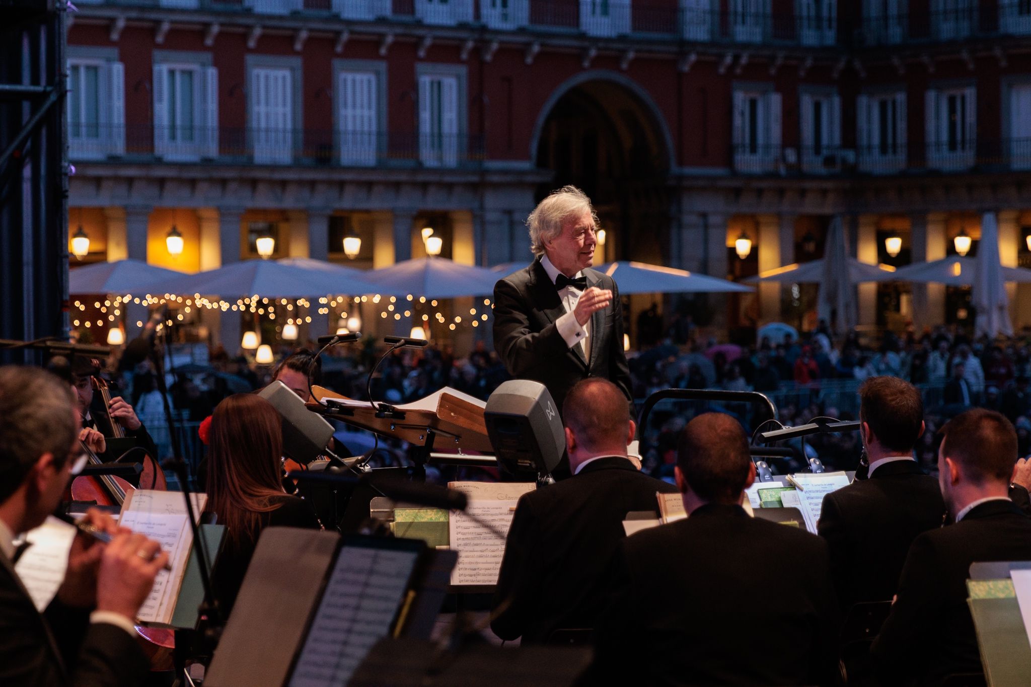 La plaza Mayor acogió anoche el tradicional concierto de las Fiestas de San Isidro ofrecido por la Banda Sinfónica Municipal de Madrid, dentro de la programación organizada por el Área de Cultura, Turismo y Deporte. Cientos de personas se dieron cita para disfrutar de esta propuesta musical, ya consolidada como uno de los momentos más emblemáticos y esperados de las celebraciones en honor al patrón de la ciudad.
