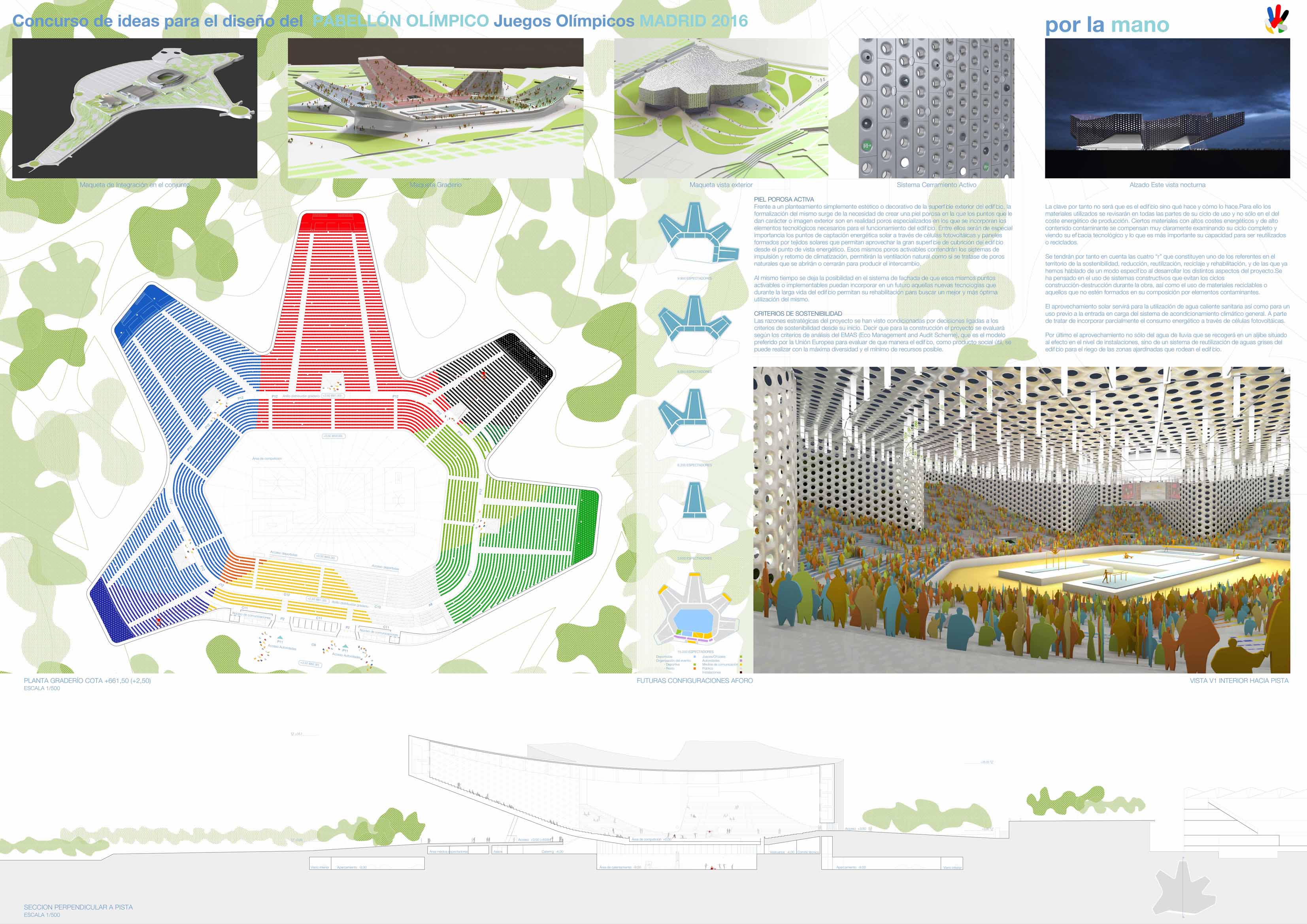 Otra de las instalaciones del Corazón de los Juegos, es una infraestructura que formará parte del legado olímpico como equipamiento deportivo multiusos. Titulada Por la mano, un recinto que puede albergar distintas escalas de espectáculo. No sólo ofrece la posibilidad de usar el recinto completo para 15.000 espectadores, sino que podrá tener otras configuraciones con 8.000. 7.500, 5.000 o incluso simultanear eventos de menos capacidad.