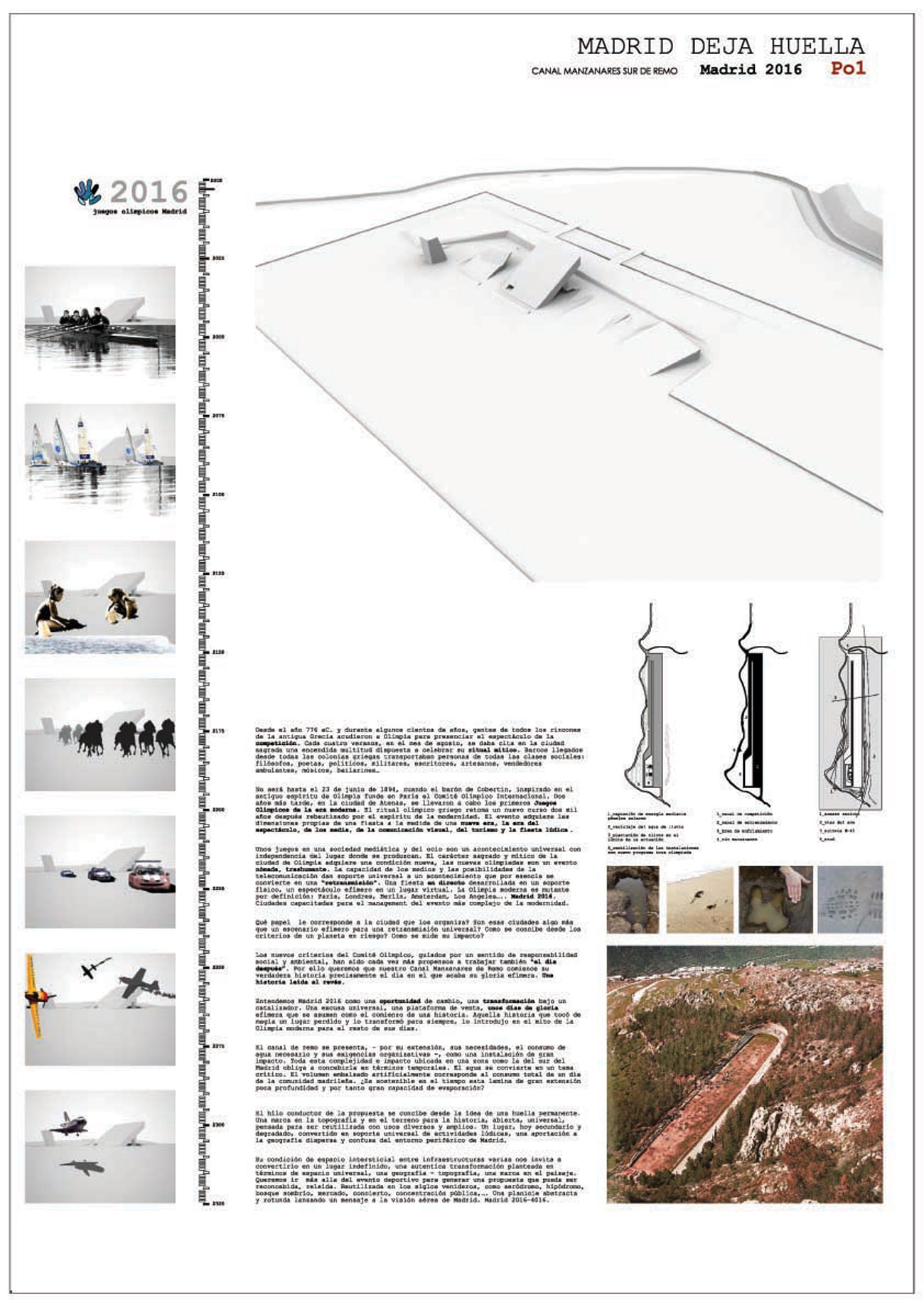 Se titula “Madrid deja huella”. Es el cuarto proyecto seleccionado hoy: el Centro de Remo, situado en el Pulmón de los Juegos, en la zona del río Manzanares, entre los términos municipales de Madrid y Getafe. Con un aforo para 15.000 espectadores, constituirá como ha subrayado Ruiz-Gallardón, “un valioso legado para la práctica y disfrute de deportes y actividades acuáticas de competición y recreo en un río completamente recuperado y puesto a disposición de los ciudadanos”. Sus autores coinciden plenamente con el alcalde al definir su propuesta como “una historia leída al revés”, porque está concebida para comenzar su verdadera historia “precisamente el día que acaba su gloria efímera”.