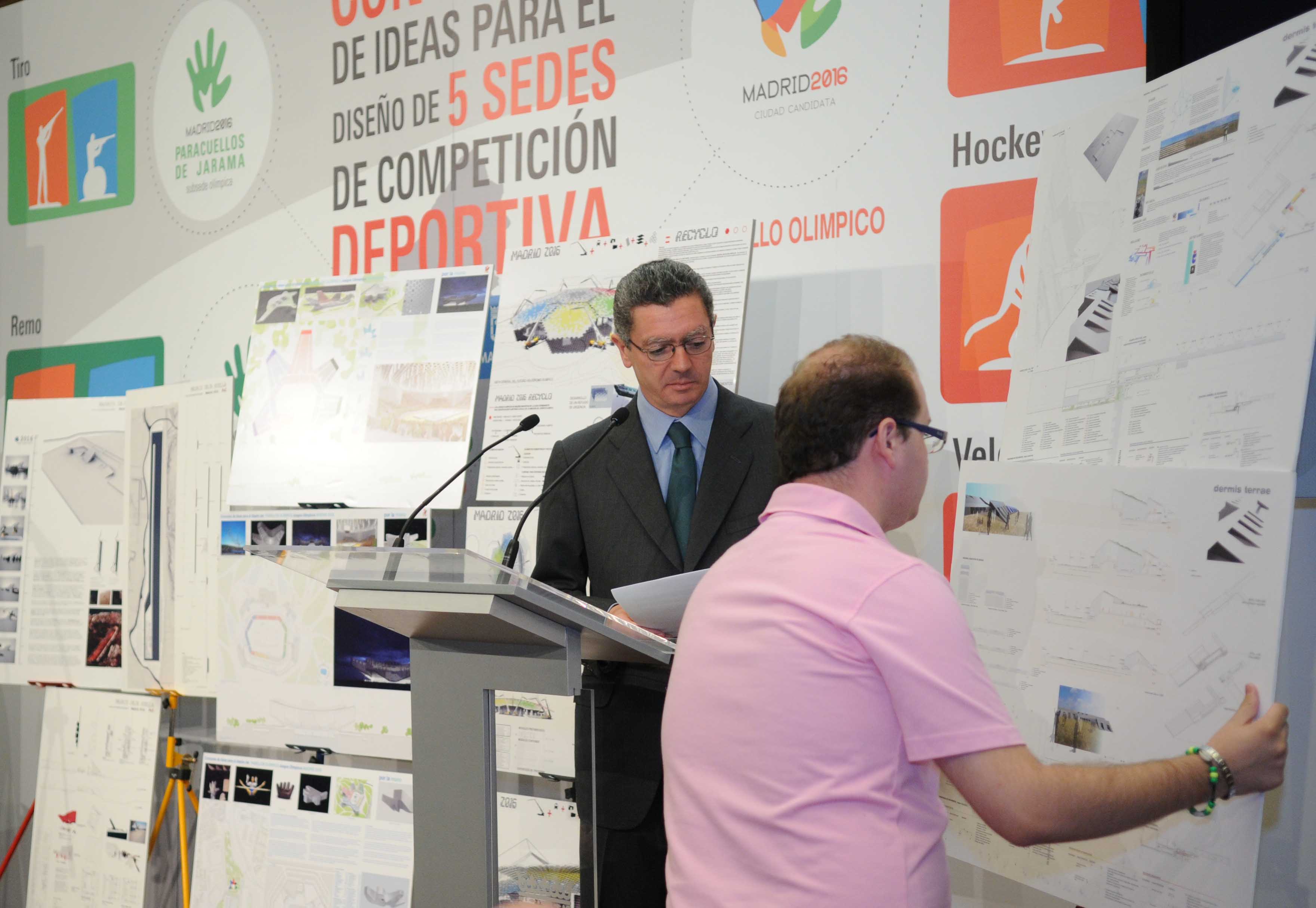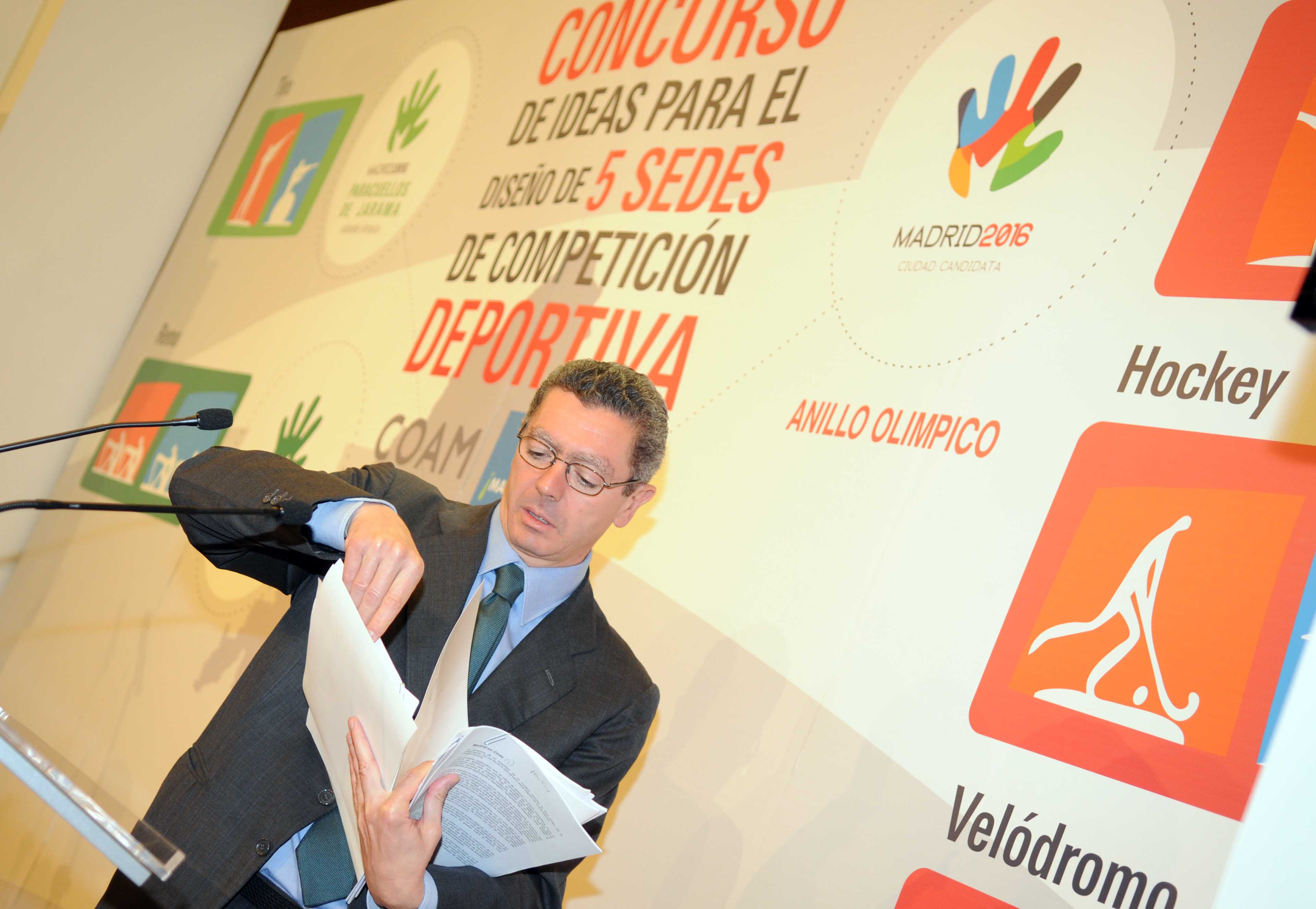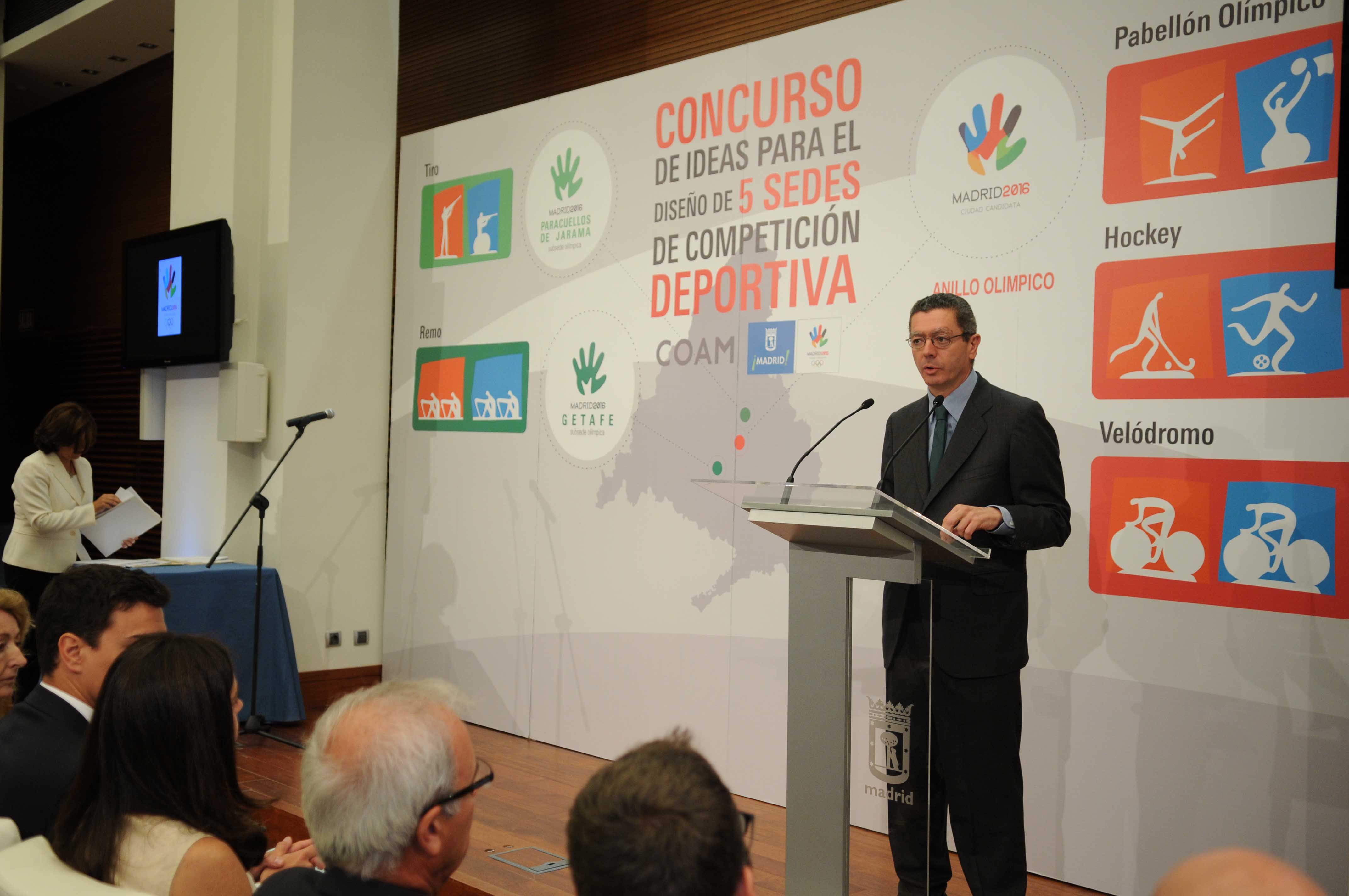 El alcalde de la Ciudad de Madrid, Alberto Ruiz-Gallardón, durante la presentación de los ganadores del concurso, convocado por Ayuntamiento y COAM para diseñar las sedes de Madrid 2016