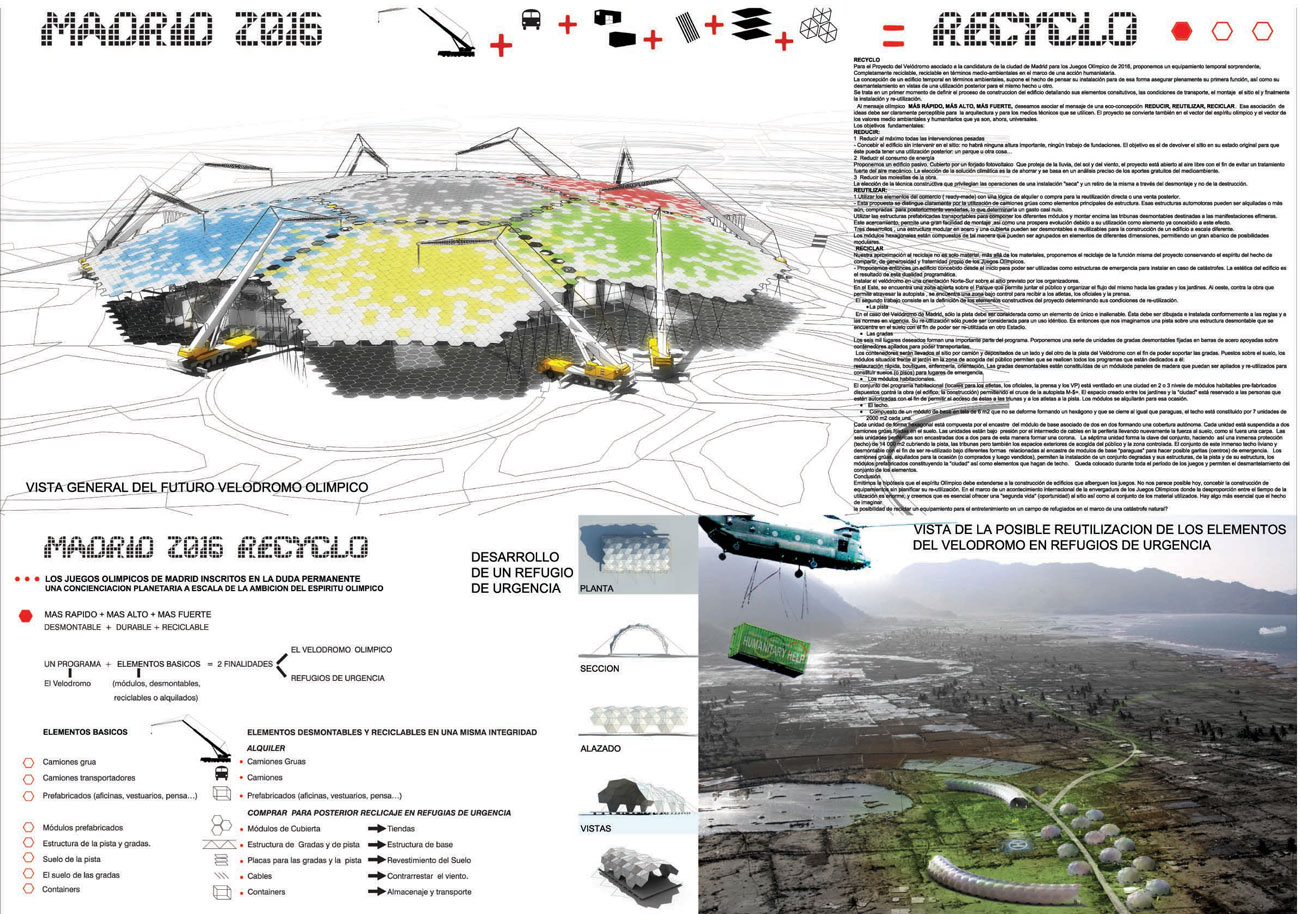 El concurso se convocó para diseñar cinco sedes: tres de ellas ubicadas en el llamado Corazón de los Juegos –Velódromo, Pabellón de Gimnasia y Centro de Hockey-; otra, la de Remo, en el Manzanares o Pulmón de los Juegos y la última, el Centro de Tiro, en Paracuellos del Jarama. Se han presentado al final 49 propuestas, concentrando el Hockey el mayor número,15, seguido por el Centro de Tiro y el Velódromo con 9 cada una y, finalmente, el Pabellón de Gimnasia y el Remo, con ocho propuestas cada una. Los proyectos ganadores han sido: Recyclo (Velódromo), Por la mano (Gimnasia), Madrid en Cinta (Hockey), Madrid deja Huella (Remo) y Demis Terrae (Tiro).