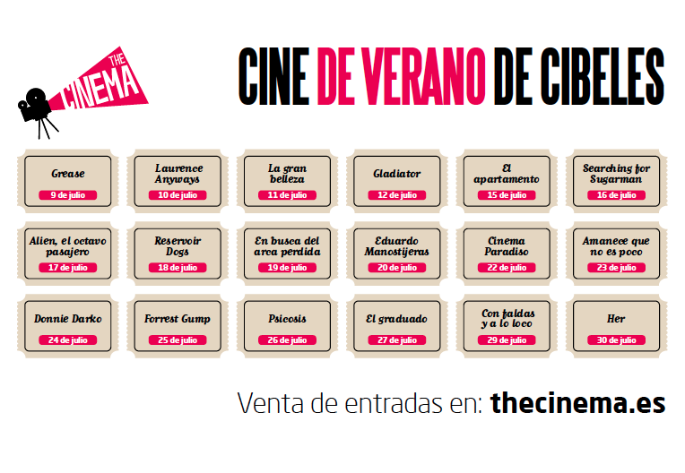 Durante los meses de julio y agosto, cada noche (de martes a domingo, de 20 a 2 horas) se podrán ver en la gran pantalla de Cibeles grandes clásicos (El Apartamento, Psicosis, Con Faldas y a lo Loco o El Padrino); éxitos europeos (La Gran Belleza, Cinema Paradiso o Amelie); cine de los 80 (Regreso al Futuro, Indiana Jones y la Última Cruzada o Alien); musicales (Grease, West Side Story, Moulin Rouge); películas de culto moderno (Forrest Gump, Donnie Darko, El Gran Lebowski , Gladiator); cine independiente actual (Dallas Buyers Club, Her, Moonrise Kingdom); y cine español (Blancanieves, Amanece que no es poco, Airbag), entre otros.