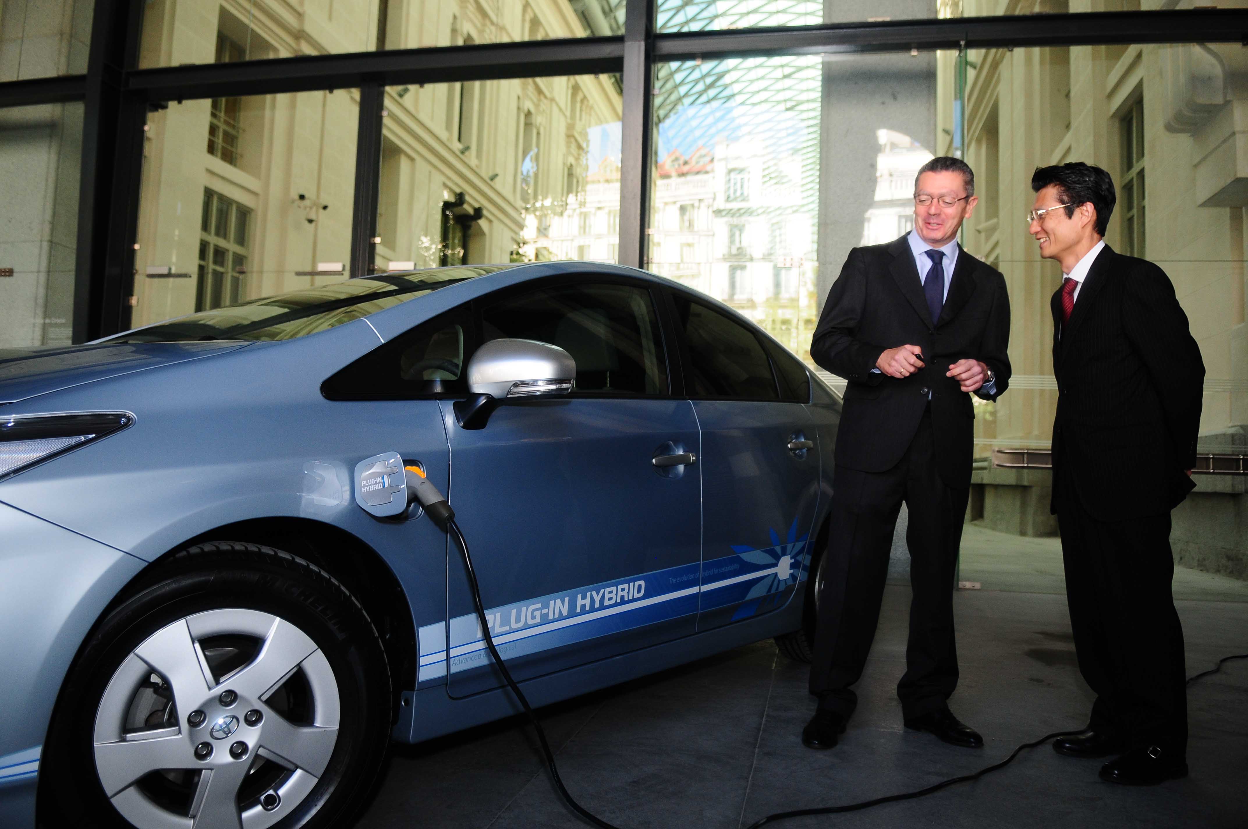 El alcalde y el presidente de Toyota han presentado el prototipo Toyota Prius Híbrido Enchufable, que desde hoy será el nuevo coche oficial del regidor. El vehículo ofrece la ventaja de que su batería se puede cargar en hora y media en una toma doméstica estándar de 220 V