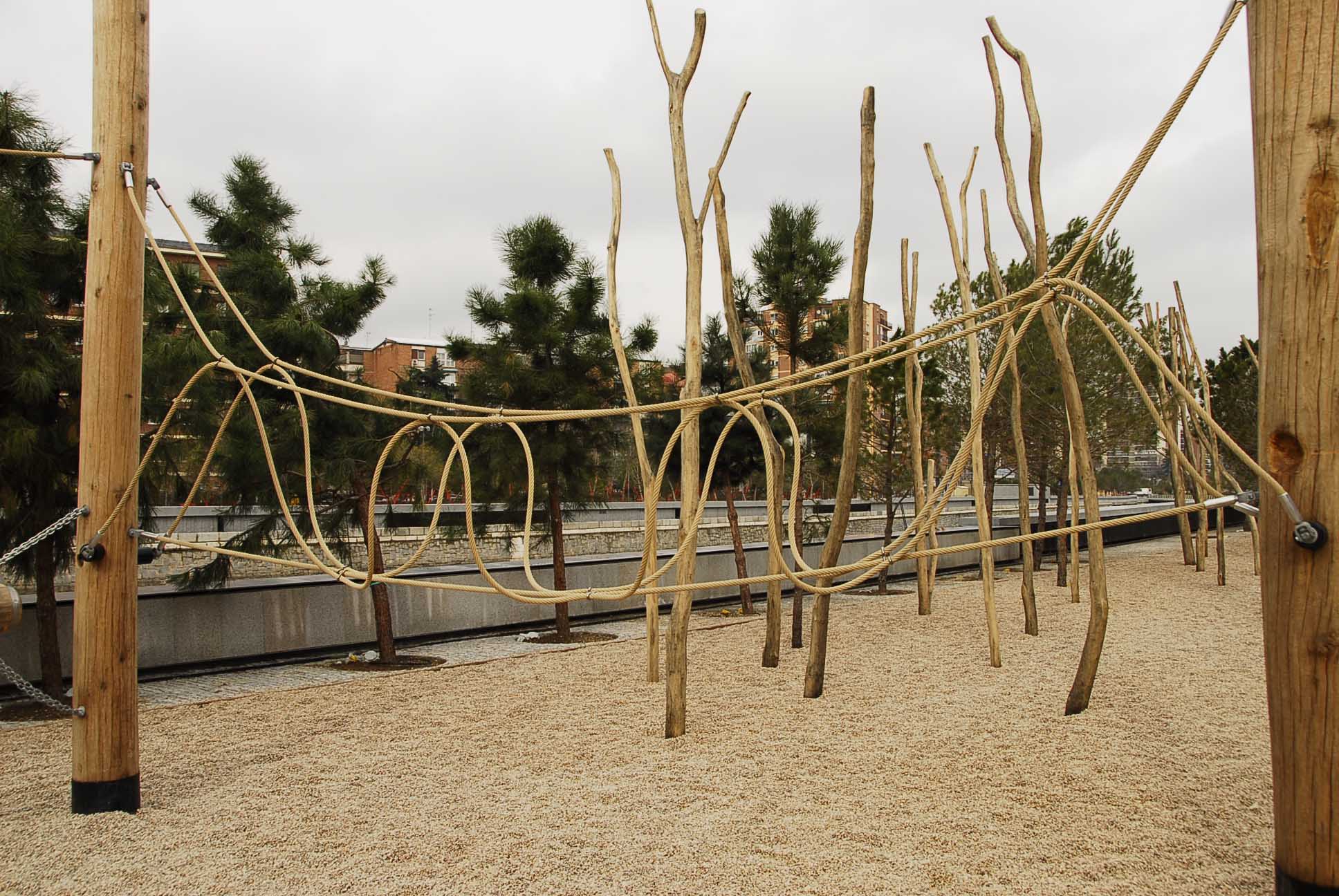 - Están construidos a base de madera y cuerdas de cáñamo, que forman telas de araña, hamacas, puentes colgantes o lianas para trepar
