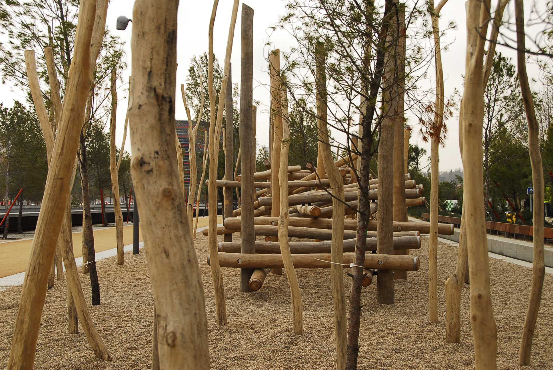 - Integradas visualmente en el corredor verde, las zonas de juegos se confunden entre los pinos al formar pequeños bosquetes configurados por grupos de troncos con diferentes siluetas