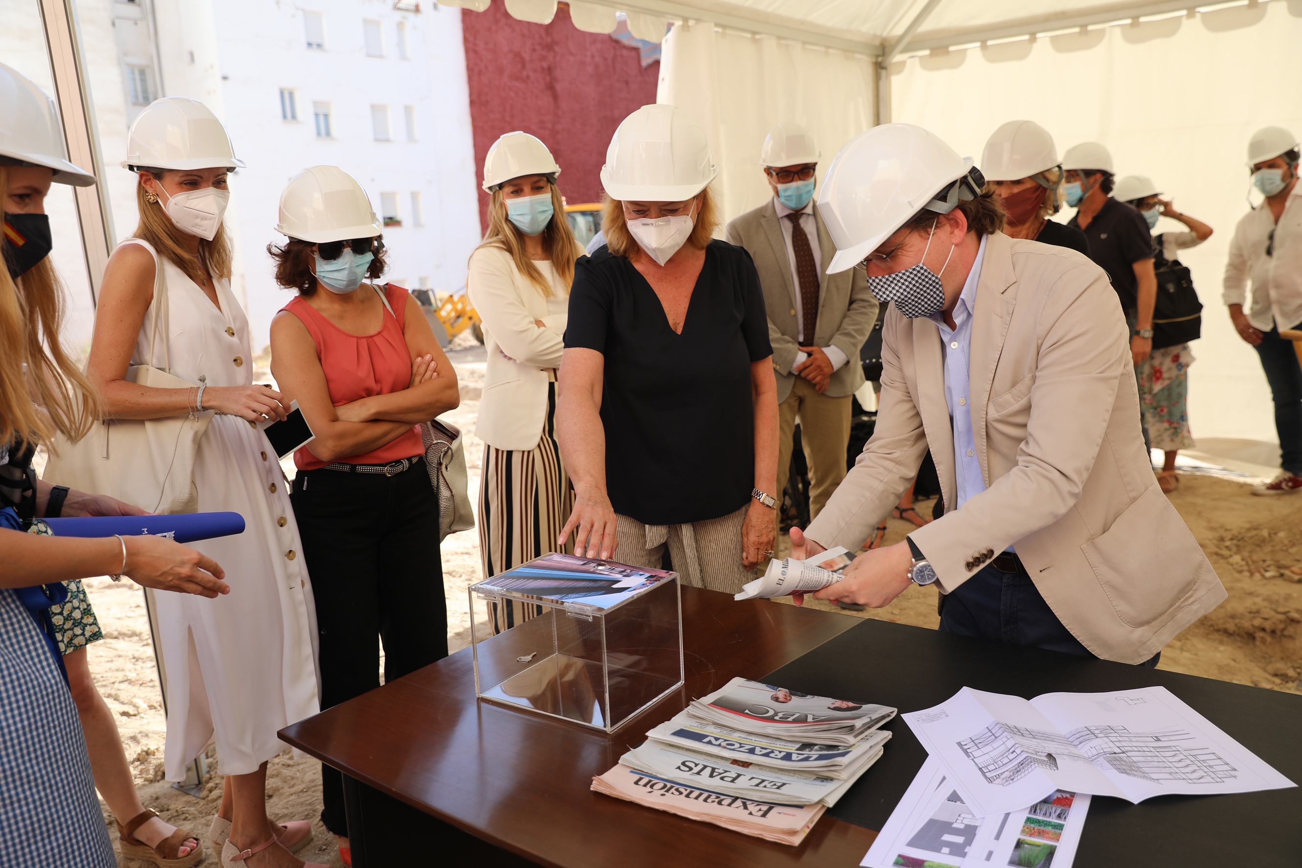 El alcalde de Madrid, José Luis Martínez-Almeida, acompañado de la delegada de Obras y Equipamientos, Paloma García Romero, y el concejal de Centro, José Fernández, ha puesto la primera piedra del nuevo Edificio Multifuncional de Fúcar. Este complejo, que contará con cinco usos distintos, verá la luz en el solar municipal de más de 3.000 m2 situado entre la calle Fúcar, 6 y Costanilla de los Desamparados, 15, en pleno barrio de Las Letras.