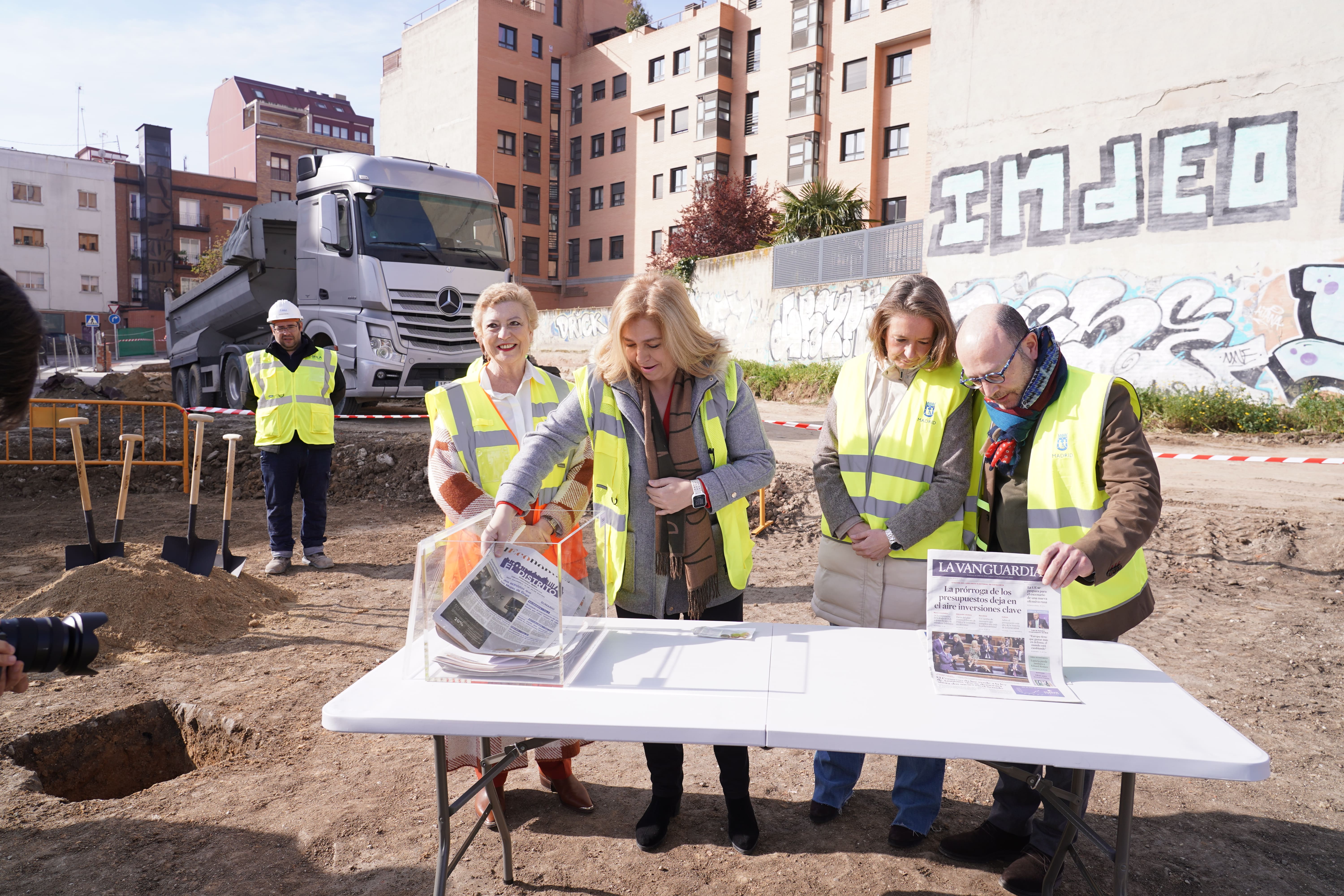 La vicealcaldesa, la delegada de Obras y Equipamientos, el de Políticas Sociales, Familia e Igualdad y la concejala de Salamanca, durante el acto de colocación de la primera piedra