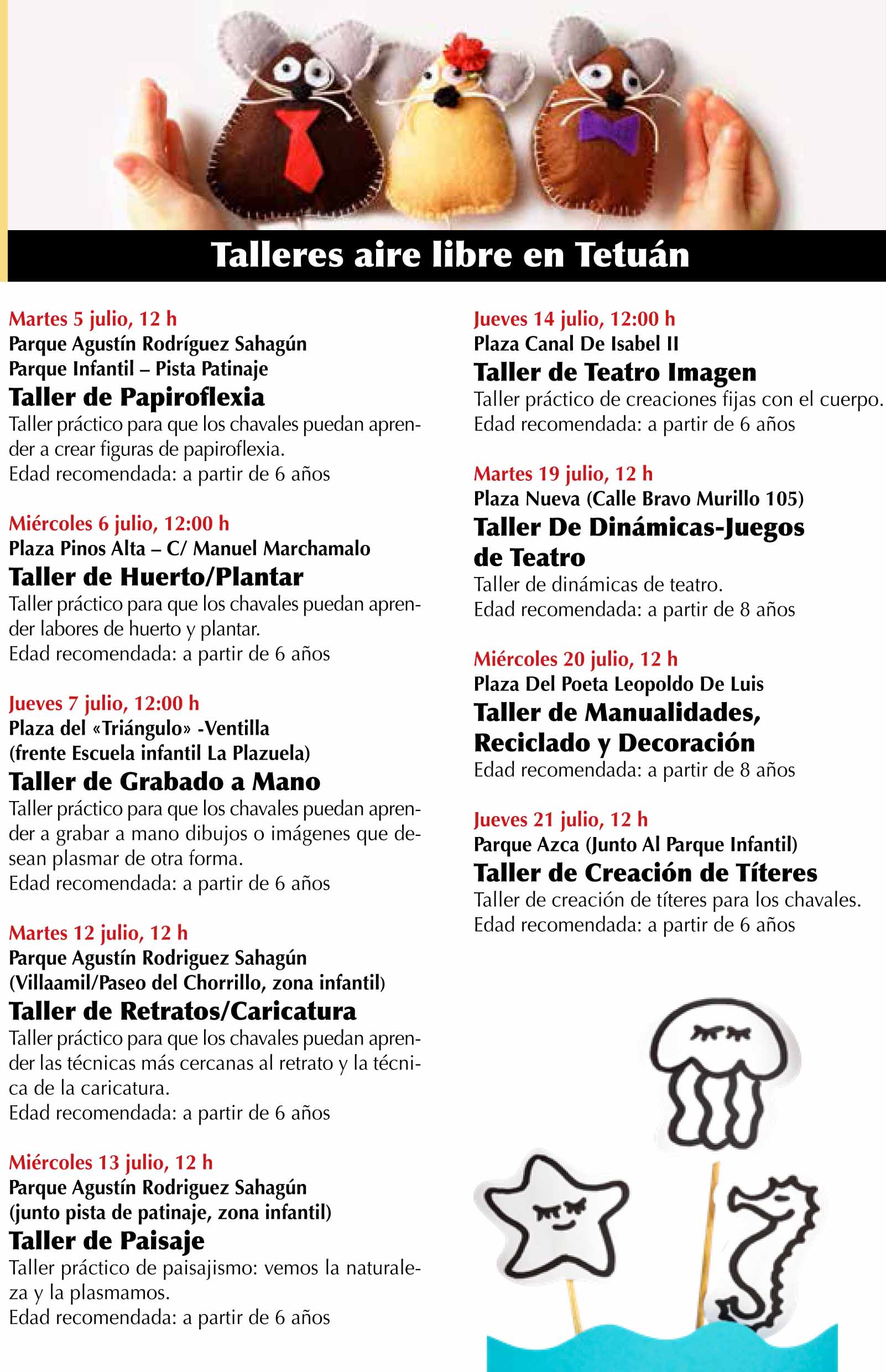 La Junta Municipal de Tetuán ha preparado un programa estival con música en las plazas y nueve talleres educativos y gratuitos al aire libre para los pequeños con el fin de ampliar la oferta cultural y dinamizar distintos enclaves del distrito. Los talleres serán a partir de las 12:00 h y arrancan mañana martes, 5 de julio, con papiroflexia en el parque de Agustín Rodríguez Sahagún, junto a la pista de patinaje. Le seguirá el día 12, en la misma ubicación, pero en la zona de la calle de Villaamil, un taller de caricaturas. Al día siguiente, habrá otro taller junto a la pista de patinaje, en este caso de paisaje.