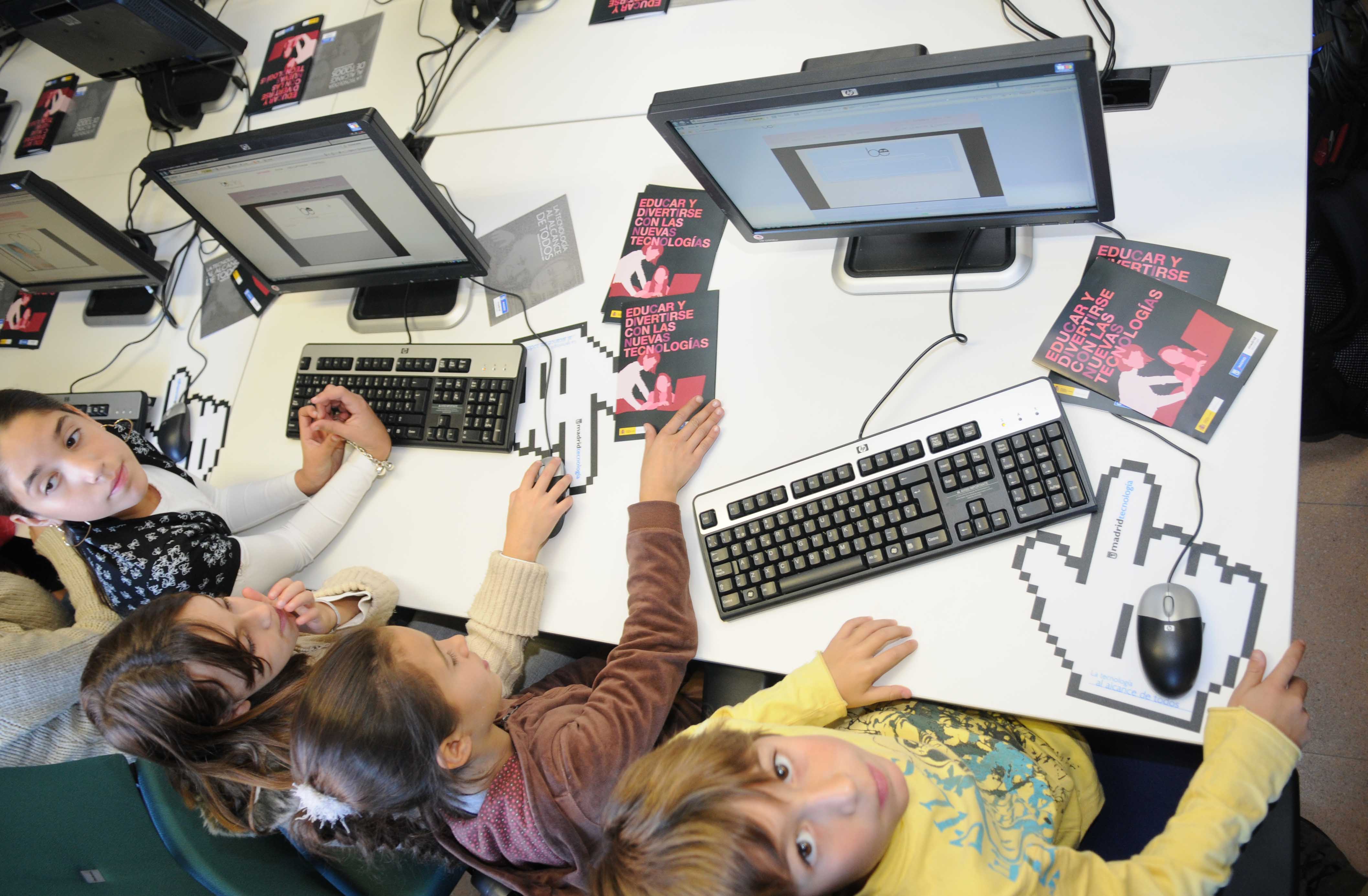 Varios niños, que participan en los programas “Chiquimadrid.es” y “Tic-Tac, tiempo para educar en las nuevas tecnologías”, en el nuevo aula Madrid Tecnología del Pozo del Tío Raimundo