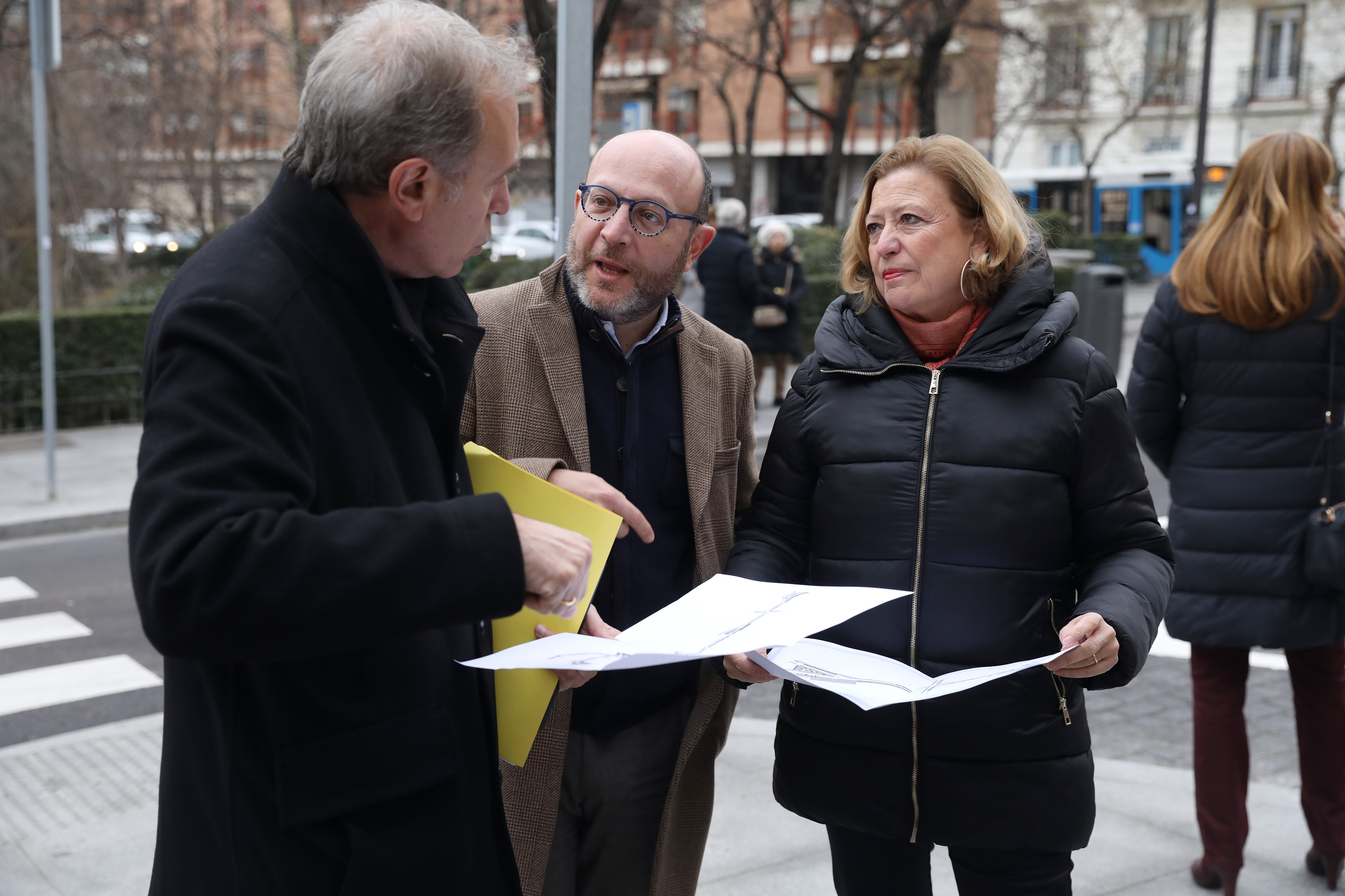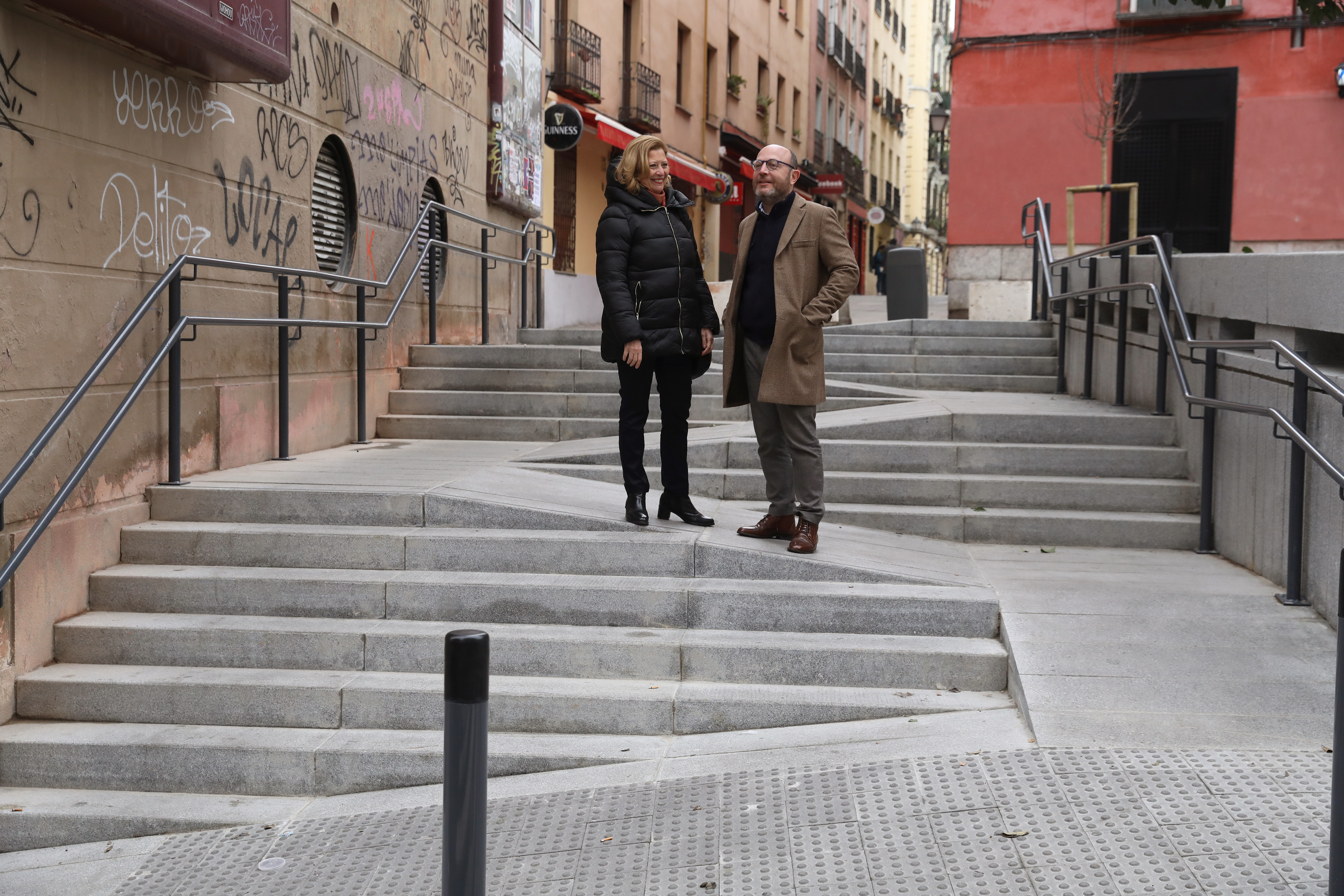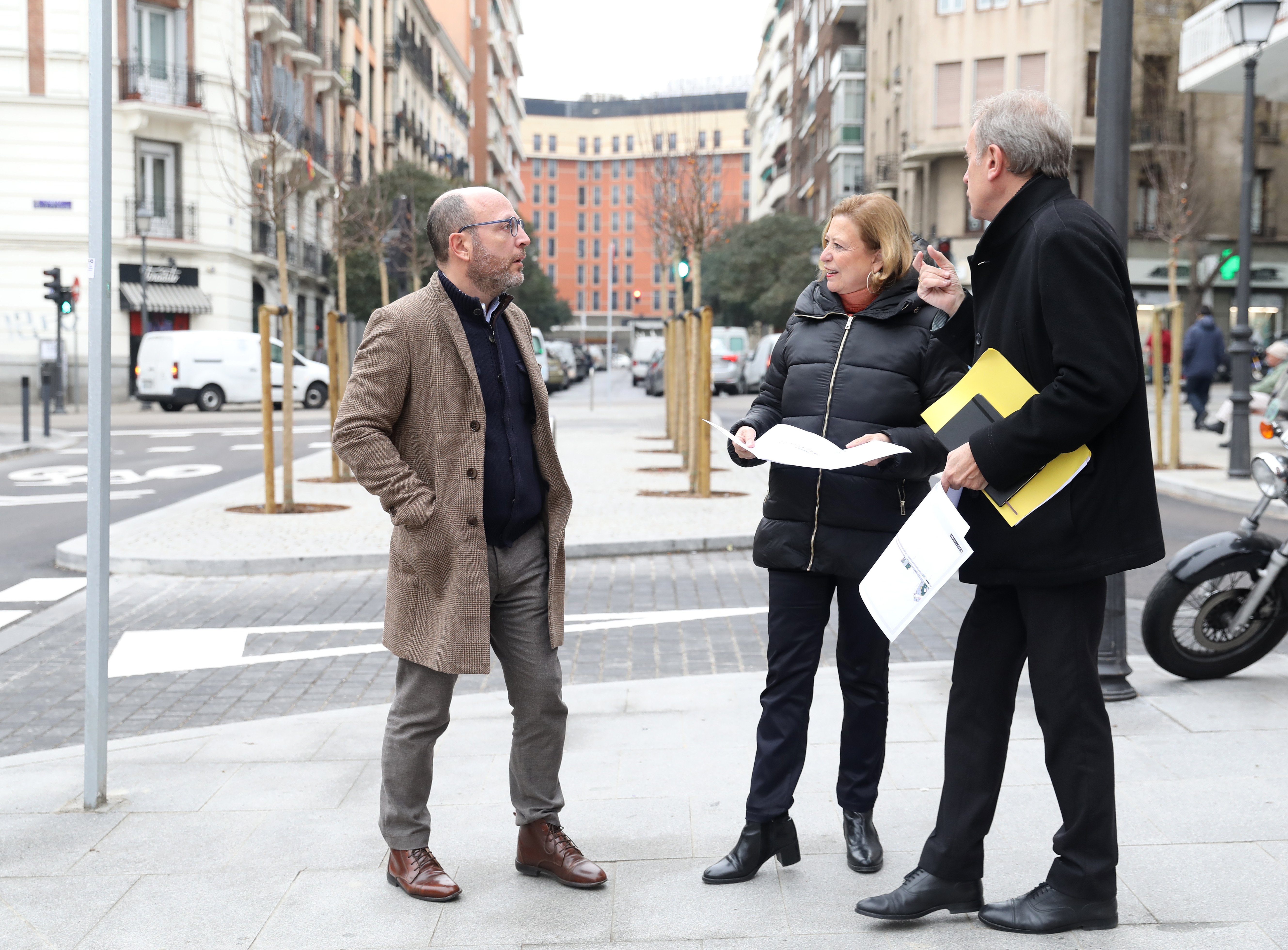 La delegada de Obras y Equipamientos, Paloma García Romero, acompañada del concejal presidente de Centro, José Fernández, ha visitado esta mañana el entorno recién remodelado de las calles Álamo, Amaniel y de los Reyes, entre la plaza de los Mostenses y la calle del Conde Duque.