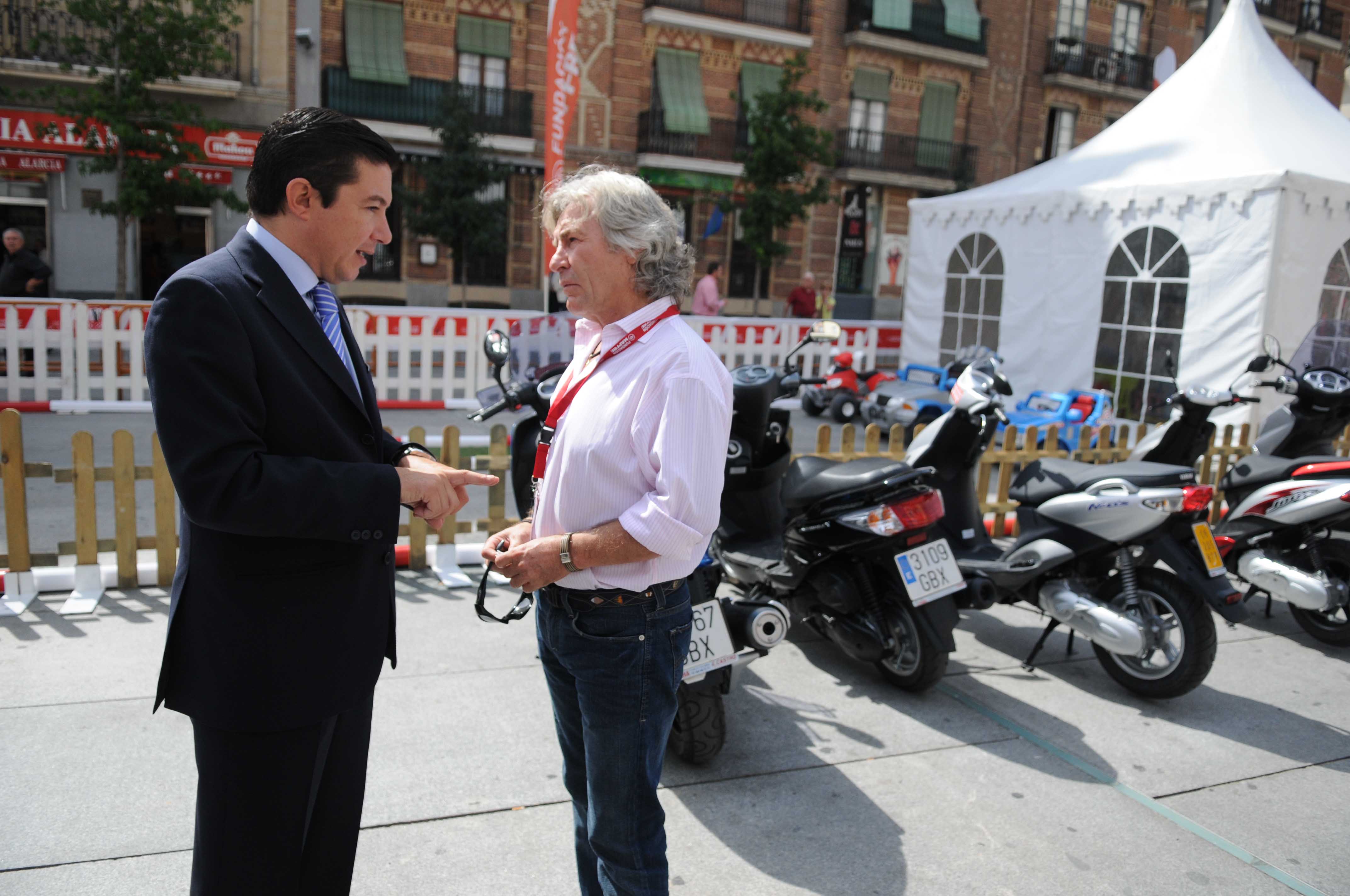El delegado de Seguridad, Pedro Calvo, durante la presentación del curso "Conducción segura de motos" que trata de concienciar a los usuarios sobre el manejo seguro de estos vehículos. Al acto ha asistido también el piloto Ángel Nieto con quien se ve departir a Calvo en una de las imágenes.