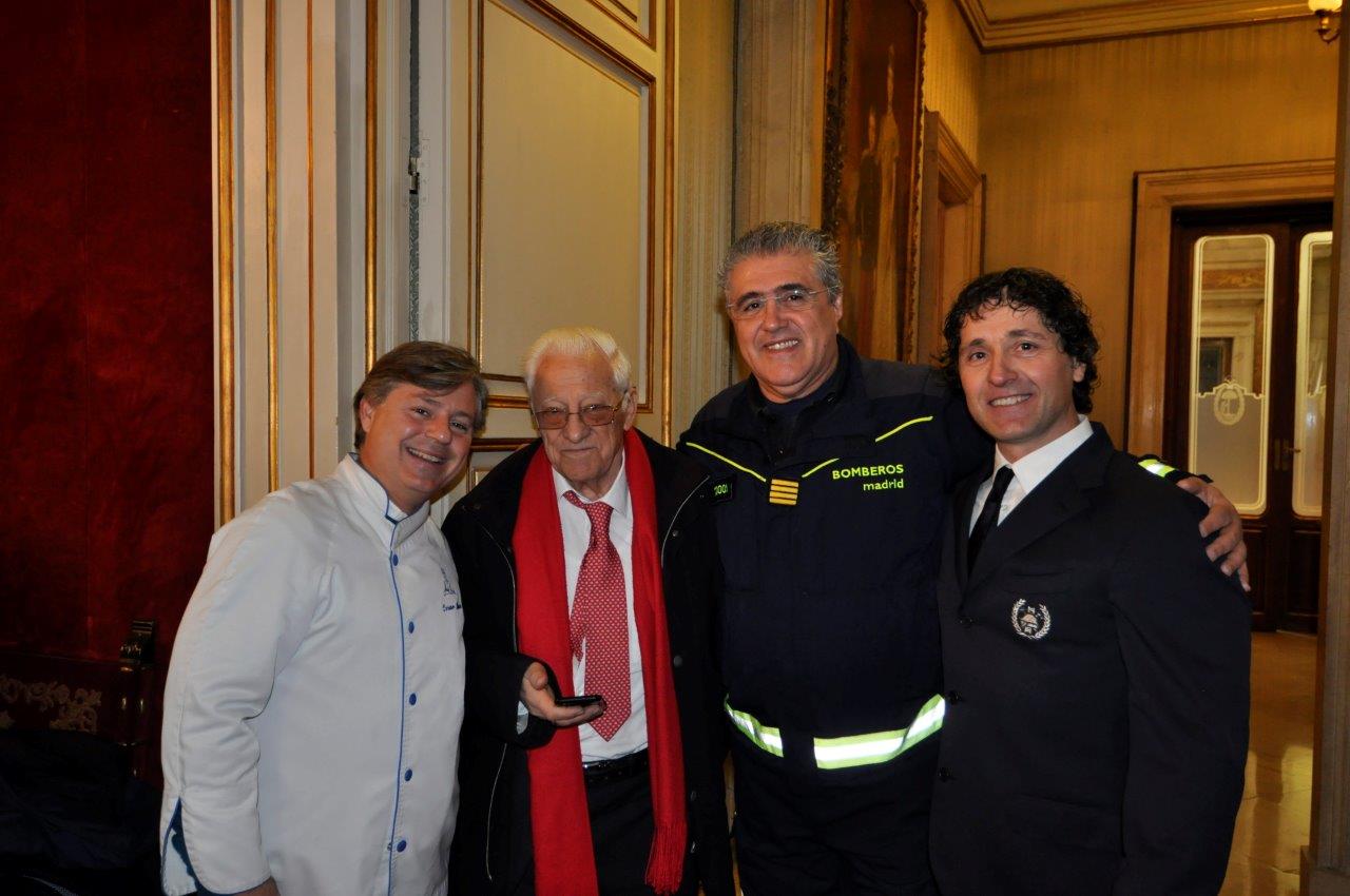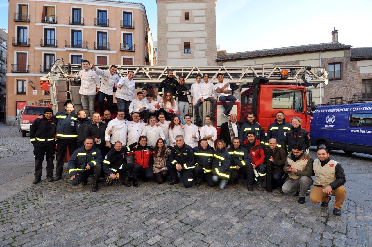 Durante la presentación de la iniciativa, la Asociación de Cocineros y Reposteros de Madrid (ACYRE) ha ofrecido un desayuno altruista a los miembros del convoy. Parte de los alimentos han sido donados a la ONG Mensajeros por la Paz del Padre Ángel, que serán trasladados a la Iglesia de San Antón por miembros del equipo de Bomberos del Ayuntamiento de Madrid. /