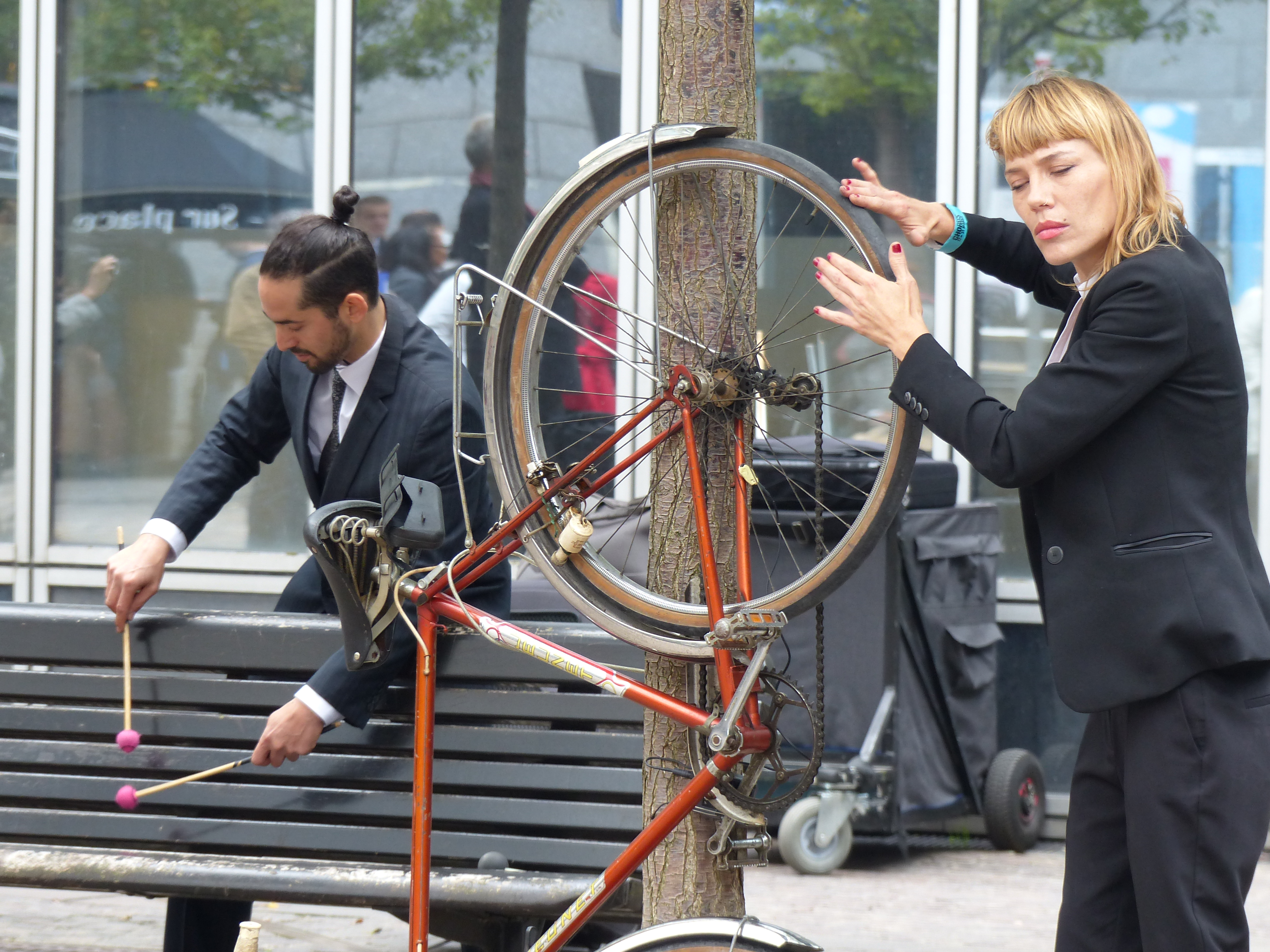 Cinco músicos se introducen en el paisaje sonoro de la ciudad, auscultan el ambiente sonoro y componen in situ y en vivo a partir de lo que oyen y de los objetos y elementos que encuentran. Nos hacen escuchar aquello que ya estaba ahí pero en lo que nadie había reparado, o por el contrario, escuchar de otra manera lo que resultaba perturbador. La arquitectura y el mobiliario urbano se convierten en instrumentos musicales improvisados. La ciudad como paisaje sonoro, el arte como llamada a otro tipo de escucha. La compañía francesa Décor Sonore explora así la dimensión poética de lo real, de lo cotidiano y más próximo a nosotros.