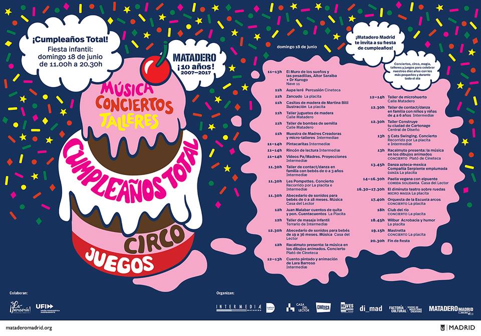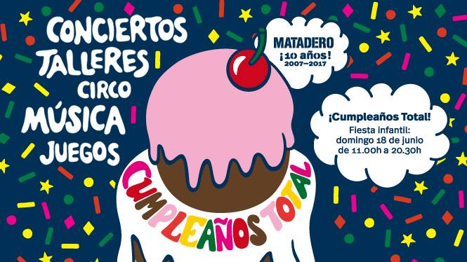 Cumpleaños Total es una fiesta, diurna y gratuita, dirigida al público infantil, con la que Matadero Madrid inicia este domingo 18 de junio las celebraciones del décimo aniversario de su apertura. Conciertos de Racalmuto, Cats Swinging, Les Pompettes, Club del Río y Mastretta; un diminuto teatro sobre ruedas donde asistir a los alucinantes trucos del premio nacional de magia infantil Iván Santa Cruz; cuentos de quita y pon de Juan Malabar; las acrobacias de Wilbur; talleres, juegos y un fin de fiesta sorpresa, Matadero convoca a todos los niños y niñas de 0 a 14 años, y a sus padres, para celebrar su décimo cumpleaños.