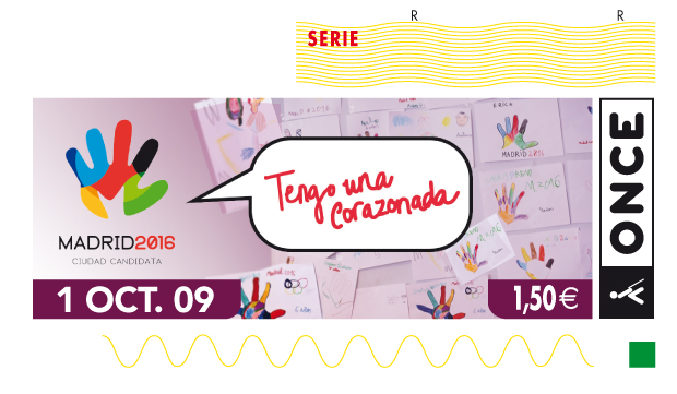 "Cinco millones de corazonadas se unirán al sueño de Madrid y de toda España". El alcalde Alberto Ruiz-Gallardón ha resumido así el espíritu de la iniciativa que ha tenido la Organización Nacional de Ciegos (ONCE) con la edición de cinco millones de cupones conmemorativos de la candidatura de Madrid 2016. Se pondrán en venta el 28 de septiembre para el sorteo que se celebrará el jueves 1 de octubre, justo un día ante de la cita en Copenhague en la que se decidirá qué ciudad será sede de los Juegos de 2016.