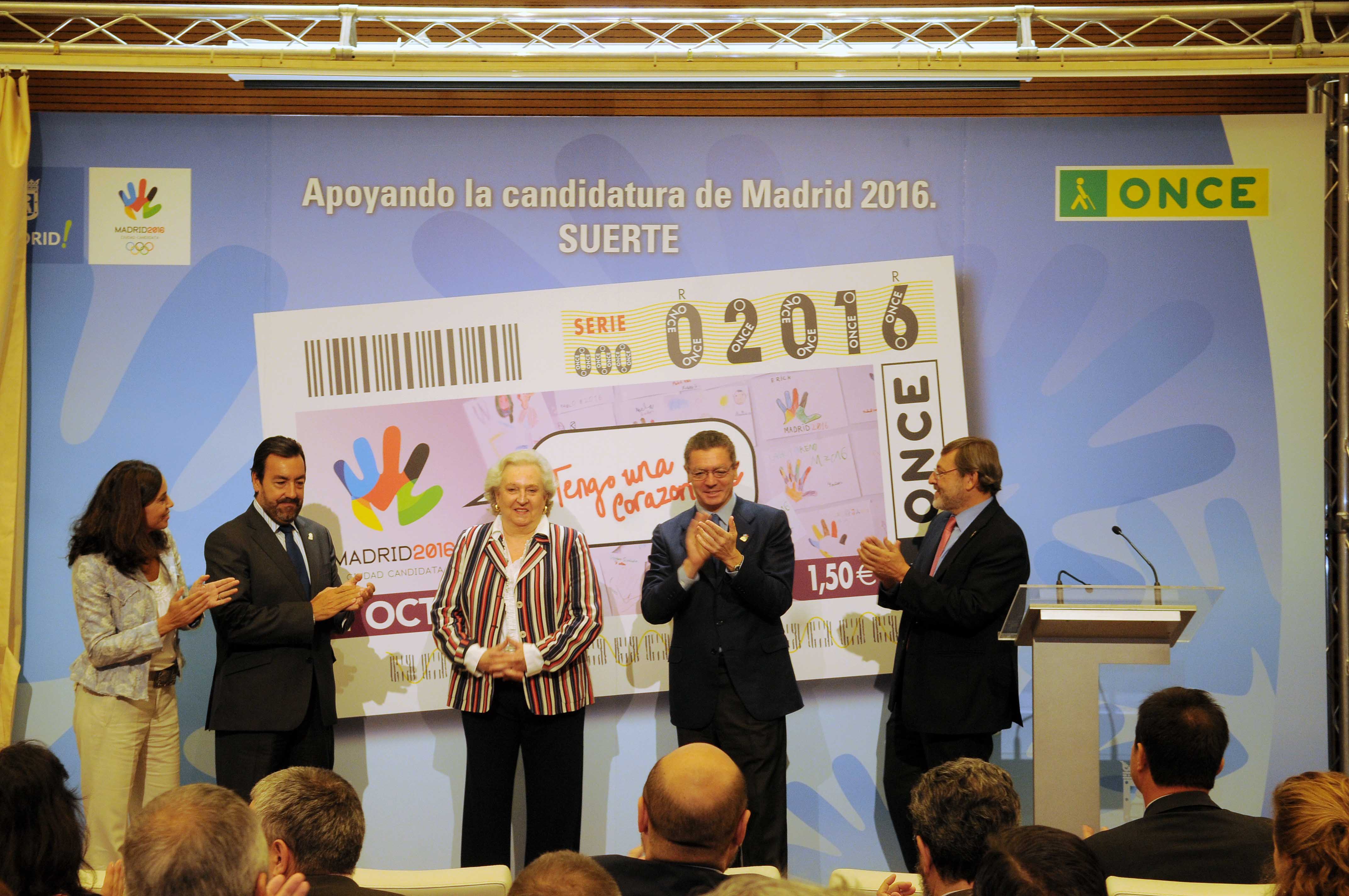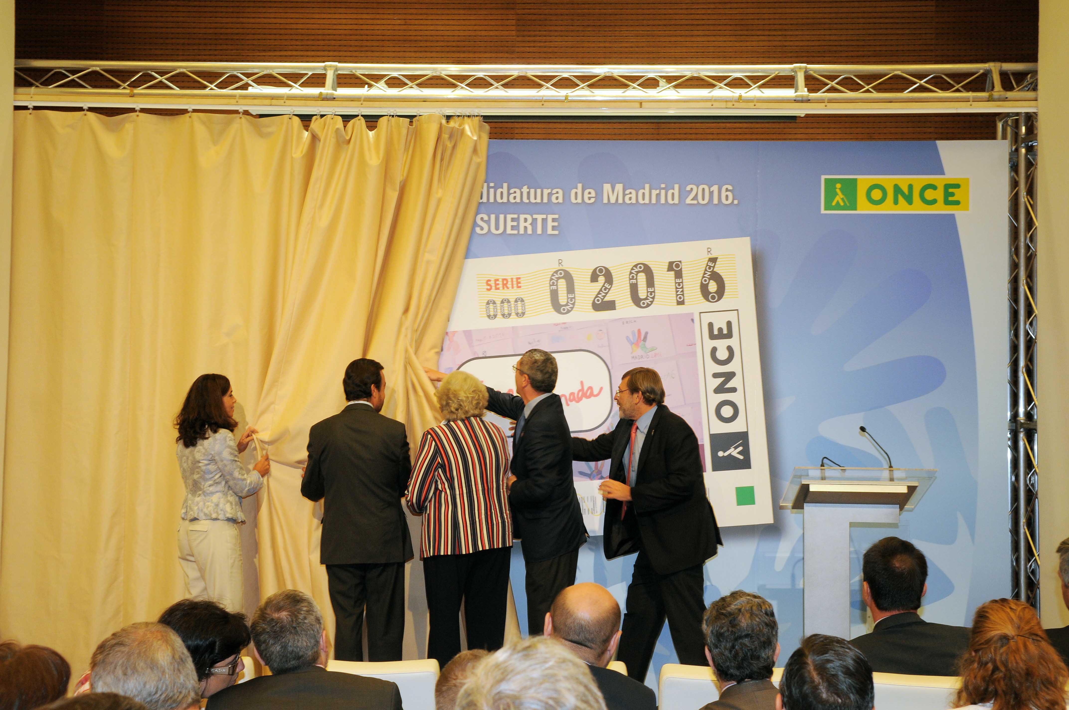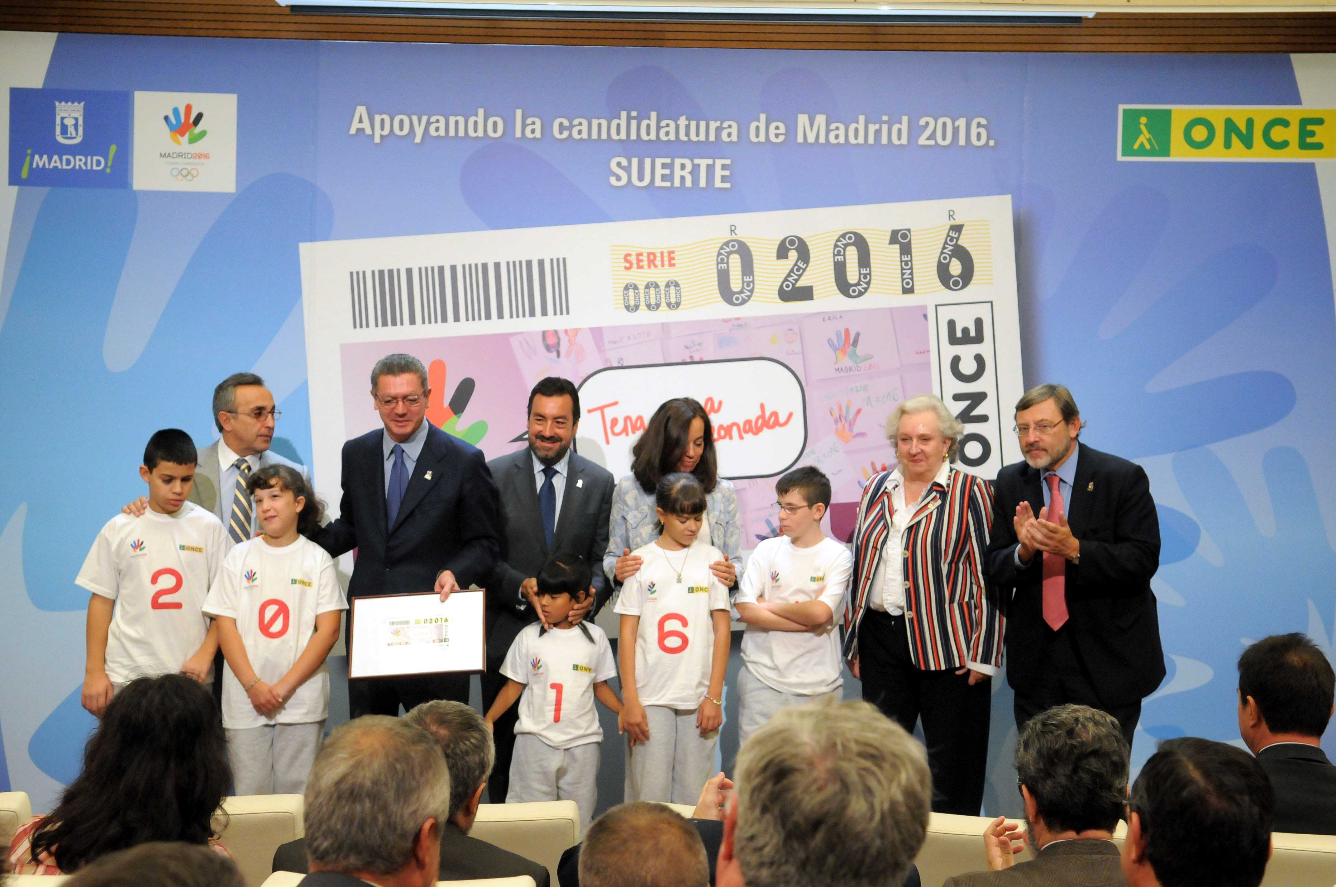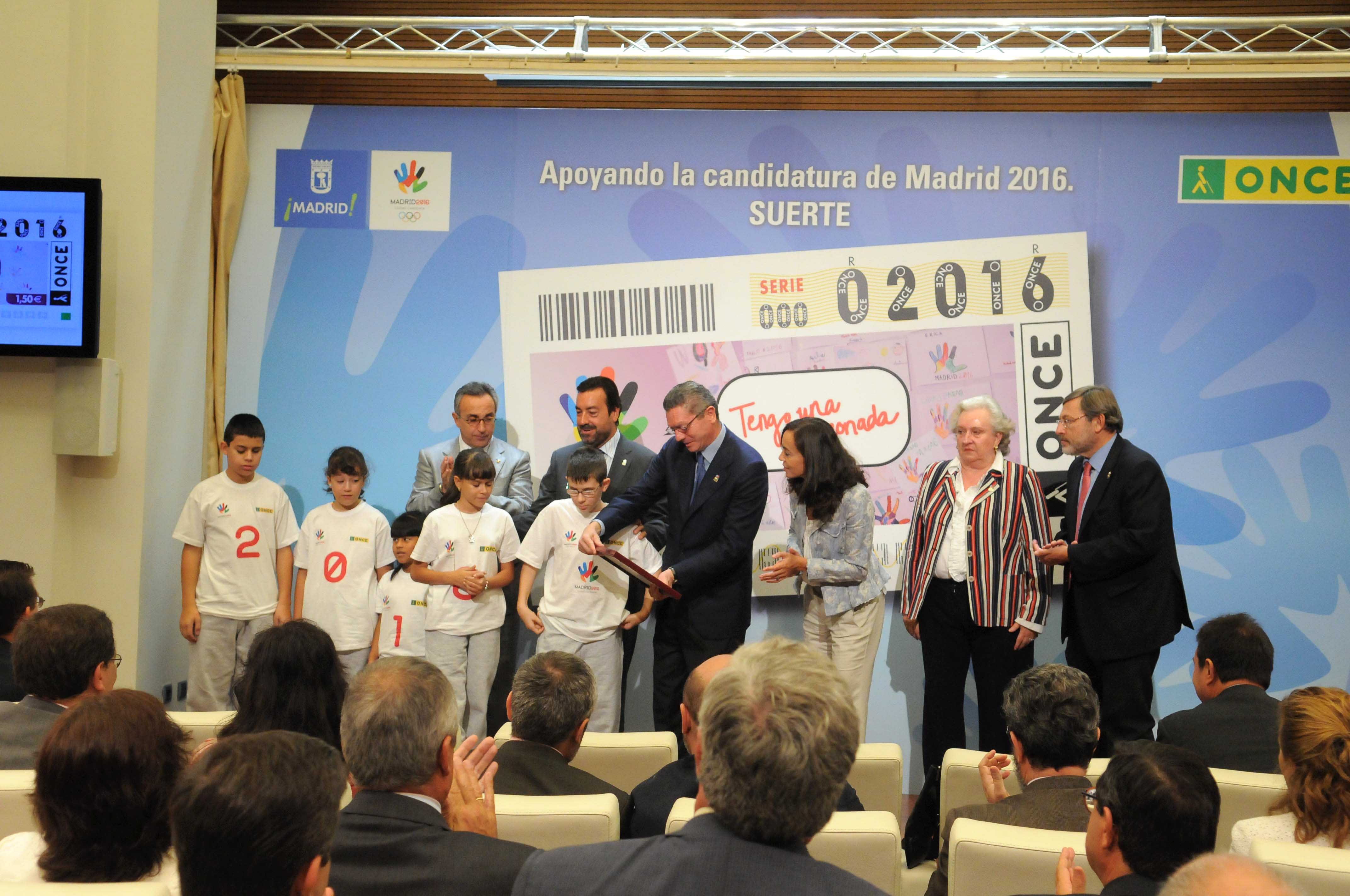Cinco alumnos ciegos del Centro de Recursos Educativos de la ONCE en Madrid entregaron al alcalde una reproducción del cupón, en un acto al que han asistido también la Infanta Doña Pilar de Borbón; el secretario de Estado para el Deporte, Jaime Lissavetzky; la consejera delegada de Madrid 2016, Mercedes Coghen, y el presidente de la ONCE y su Fundación y presidente del Comité Paralímpico Español, Miguel Carballeda.