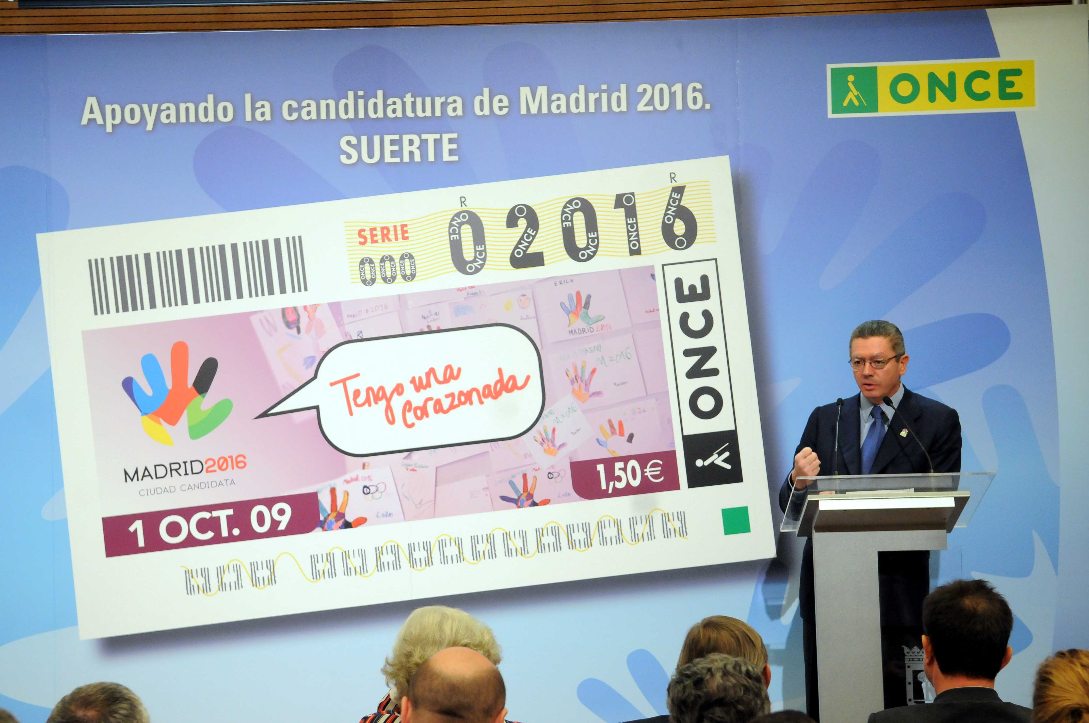 Cinco alumnos ciegos del Centro de Recursos Educativos de la ONCE en Madrid entregaron al alcalde una reproducción de este cupón, en un acto al que han asistido también el secretario de Estado para el Deporte, Jaime Lissavetzky; la consejera delegada de Madrid 2016, Mercedes Coghen, y el presidente de la ONCE y su Fundación y presidente del Comité Paralímpico Español, Miguel Carballeda.
