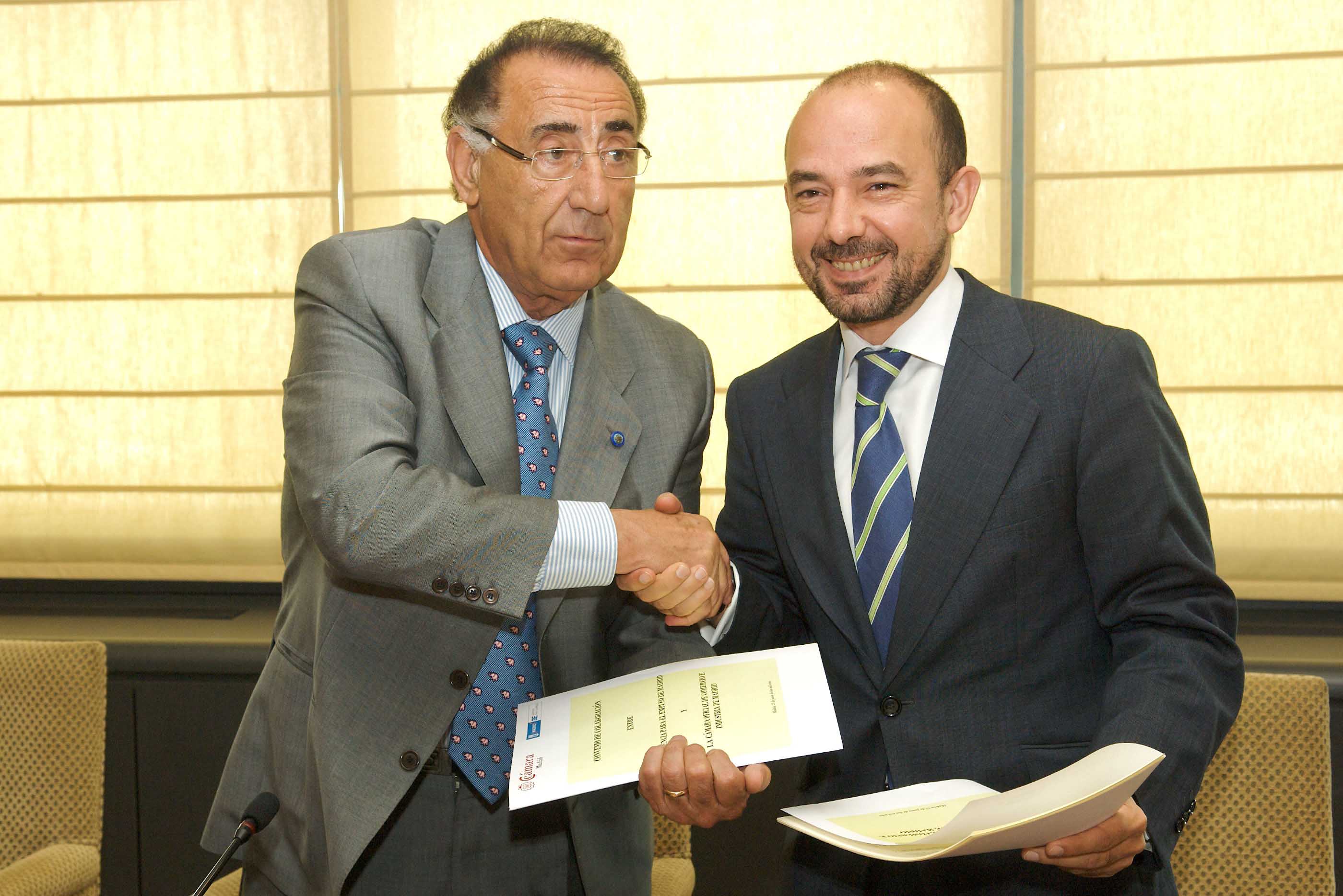 El delegado de Economía, Miguel Ángel Villanueva, a la derecha de la fotografía, durante la firma del convenio entre Ayuntamiento de Madrid y Cámara de Comercio para la formación de desempleados
