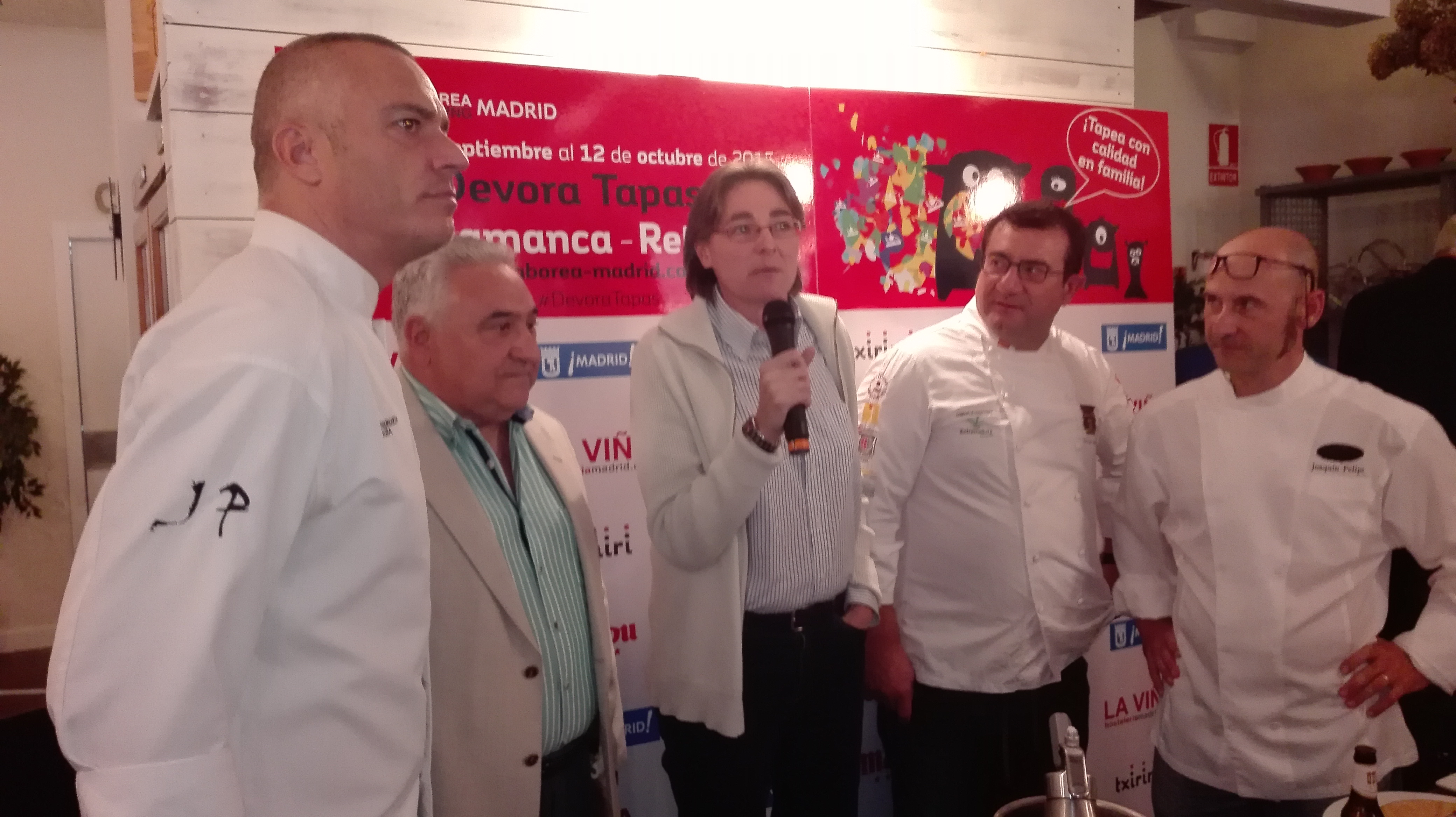 Marta Higueras, delegada de Equidad, Derechos Sociales y Empleo en la inauguración de la III edición DevoraTapas Salamanca-Retiro 2015, organizado por la Asociación de Hostelería La Viña de la Comunidad de Madrid, en colaboración con el Ayuntamiento. El cocinero madrileño Sergio Fernández es el padrino de esta nueva edición. Acompañado por sus antecesores de las dos ediciones anteriores, Juan Pozuelo y Joaquín Felipe. Los tres prestigiosos restauradores han realizado un showcooking para presentar nuevas tapas que sorprendan a los madrileños que se acerquen a esta nueva convocatoria.