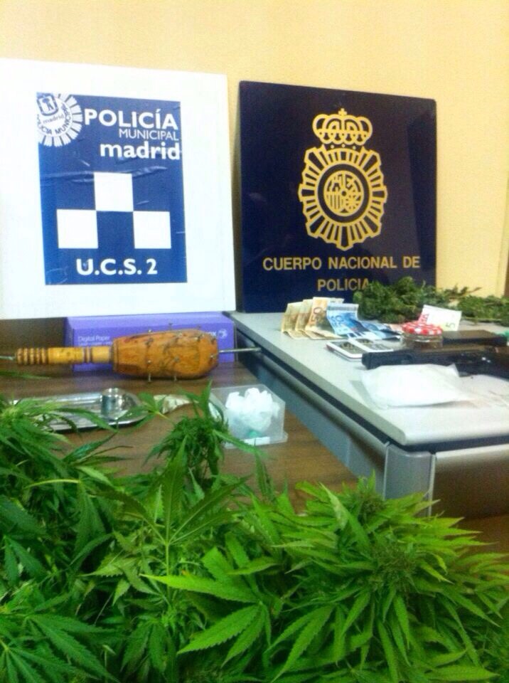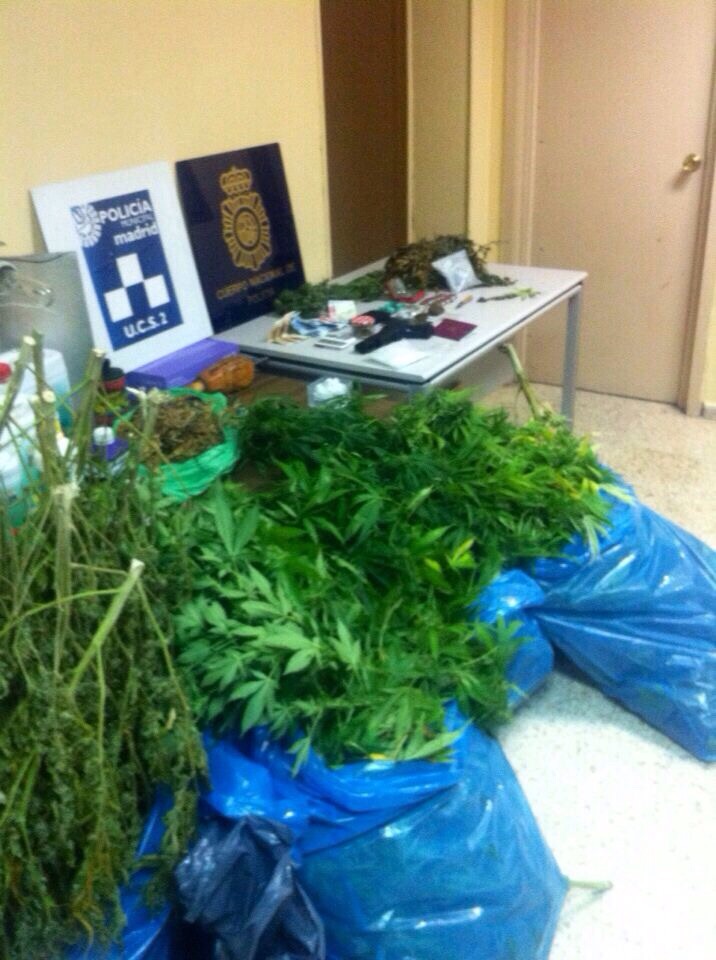 Agentes de la Policía Nacional y Policía Municipal de Madrid han detenido a dos individuos David G.P. y Alexis G.C. de 35 y 31 años, como presuntos autores de un delito contra la salud pública. Los arrestados eran los encargados del cultivo, distribución y venta de sustancias estupefacientes, principalmente de marihuana que cultivaban en su domicilio, un ático ubicado en el distrito madrileño de Puente de Vallecas. En el registro se han incautado 26 plantas de "Cannabis Sativa", 21 kg de marihuana lista para su distribución, 245 gramos de hachís, y 12,5 gramos de cocaína preparada para su venta. Asimismo se requisó una balanza de precisión, dinero en efectivo y una pistola de aire comprimido.