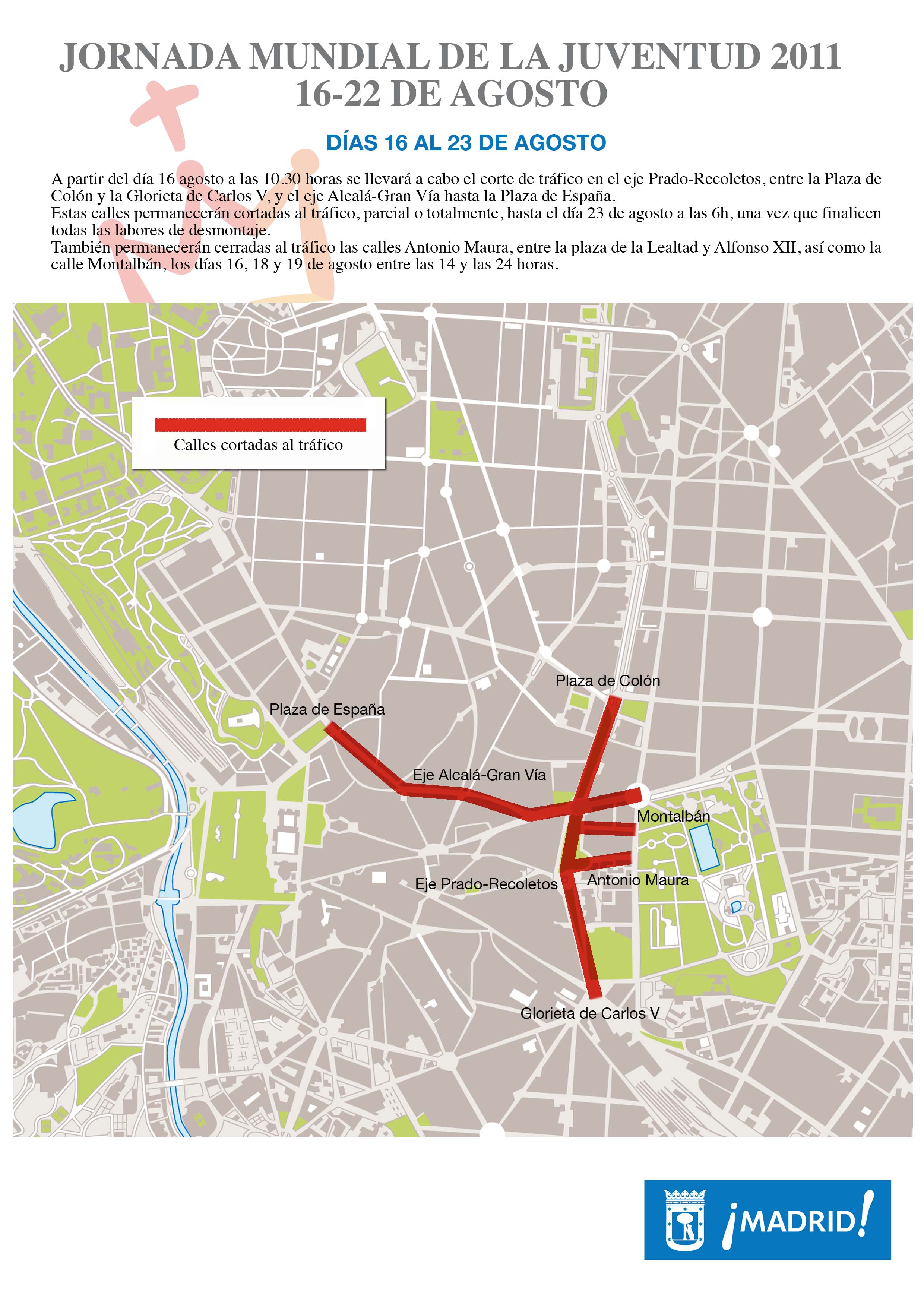 A partir de mañana, 16 agosto, a las 10.30 horas, y con motivo del inicio de los actos se cortará al tráfico el eje Prado-Recoletos, entre Colón y la Glorieta de Carlos V, y el eje Gran Vía- Alcalá, desde la plaza de España en sentido Cibeles. No obstante, se facilitará, en la medida de lo posible, el acceso de los residentes a sus domicilios y las instituciones tanto públicas como privadas para el normal desarrollo de su actividad diaria. Estas calles permanecerán cortadas al tráfico, parcial o totalmente, hasta el día 23 de agosto a las 6.00 horas, cuando finalicen todas las labores de desmontaje.