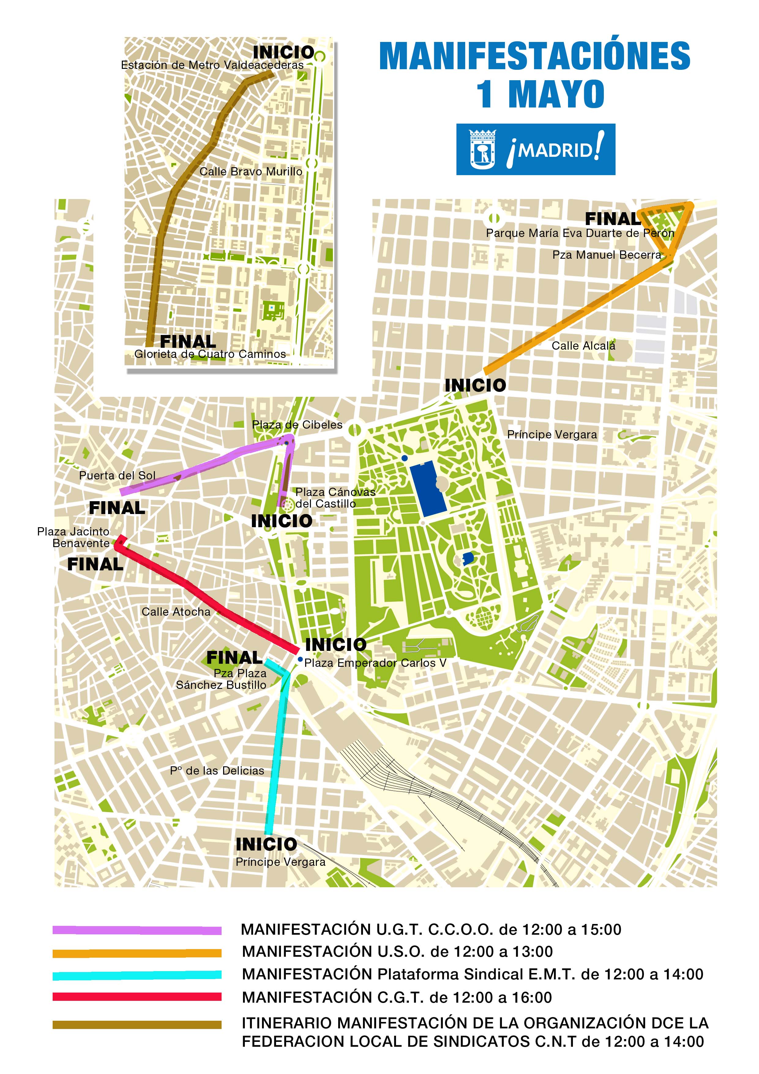 Con motivo de la celebración, preparación y desarrollo de las manifestaciones convocadas para el martes, día 1 de mayo, se producirán diferentes cortes y desvíos de tráfico en la ciudad de Madrid durante esa jornada. El Ayuntamiento ha diseñado un dispositivo de circulación y recomienda a los ciudadanos el uso del transporte público, sobre todo, del Metro.