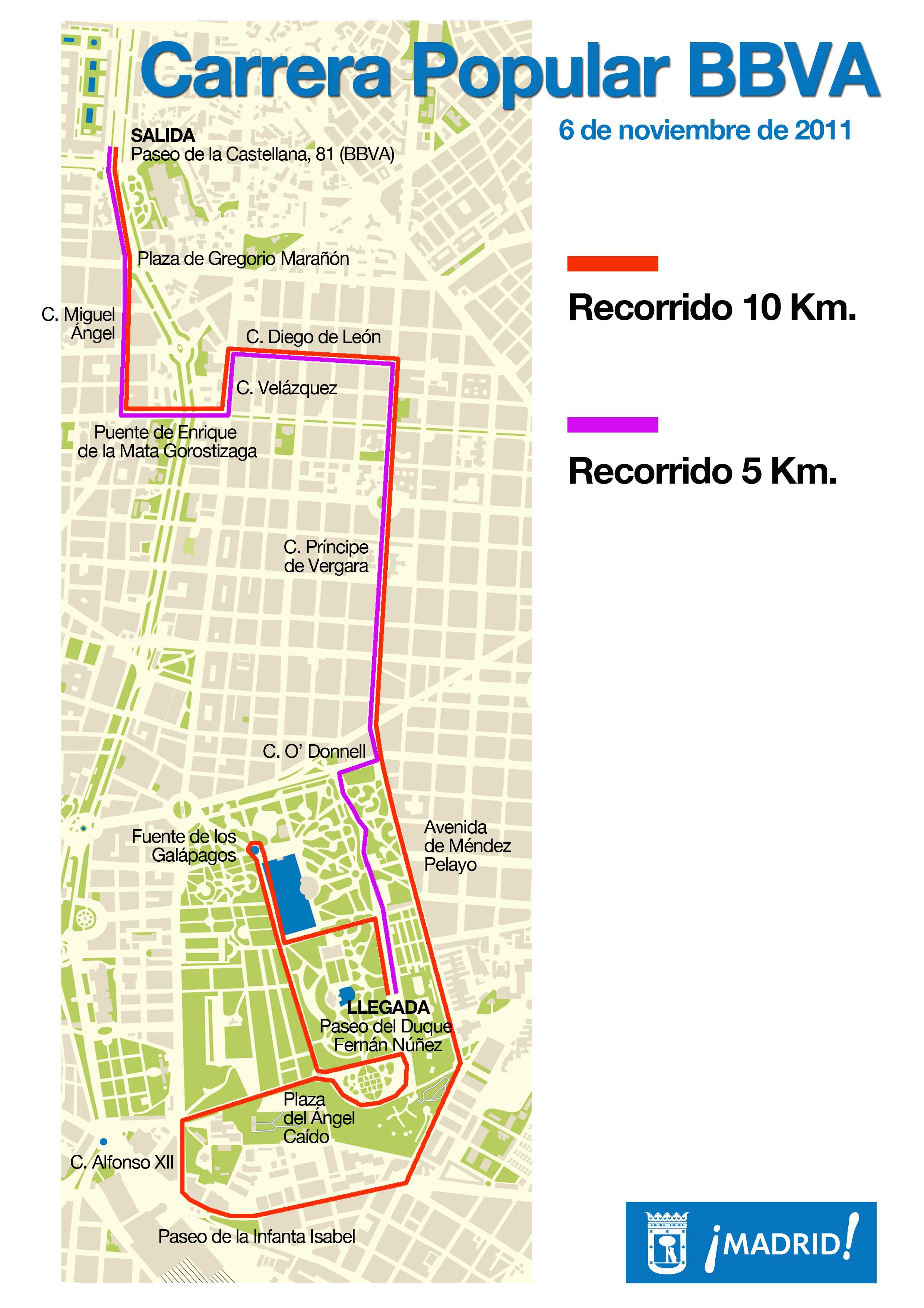 Salida desde el lateral del paseo de la Castellana, 81 - paseo de la Castellana, plaza de Gregorio Marañón, calle Miguel Ángel, glorieta de Rubén Darío, paseo de Eduardo Dato, puente de Enrique de la Mata Gorostizaga, calle Juan Bravo, calle Velázquez, calle de Diego de León, calle de Príncipe de Vergara, calle O' Donnell, avenida de Méndez Pelayo, glorieta de Mariano de Cavia, paseo de Reina Cristina, paseo de la Infanta Isabel, calle Alfonso XII, entrada al Retiro por la Puerta del Ángel Caído, curva de la Rosaleda, vuelta hasta la plaza del Ángel Caído, paseo de la