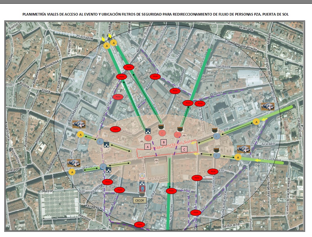 En el momento en el que se considere lleno el aforo de la Puerta del Sol, se procederá al corte total o parcial de los accesos. Cuatro patrullas de la unidad de Atención al Turismo indicarán a través de paneles LED ese mensaje de "Accesos a Puerta del Sol Cerrados" en Calle Mayor, Calle Sevilla, Plaza del Callao y Plaza de Jacinto Benavente.