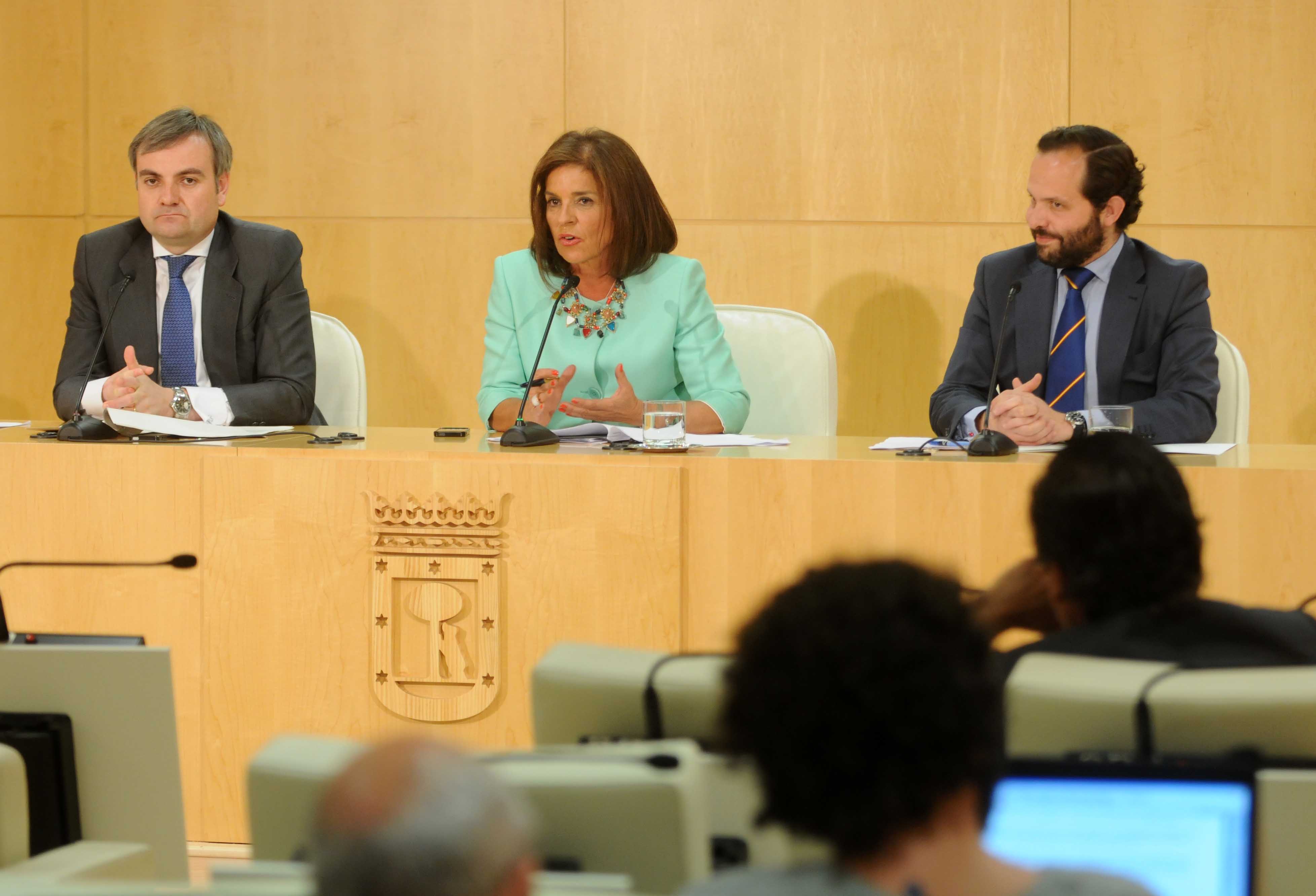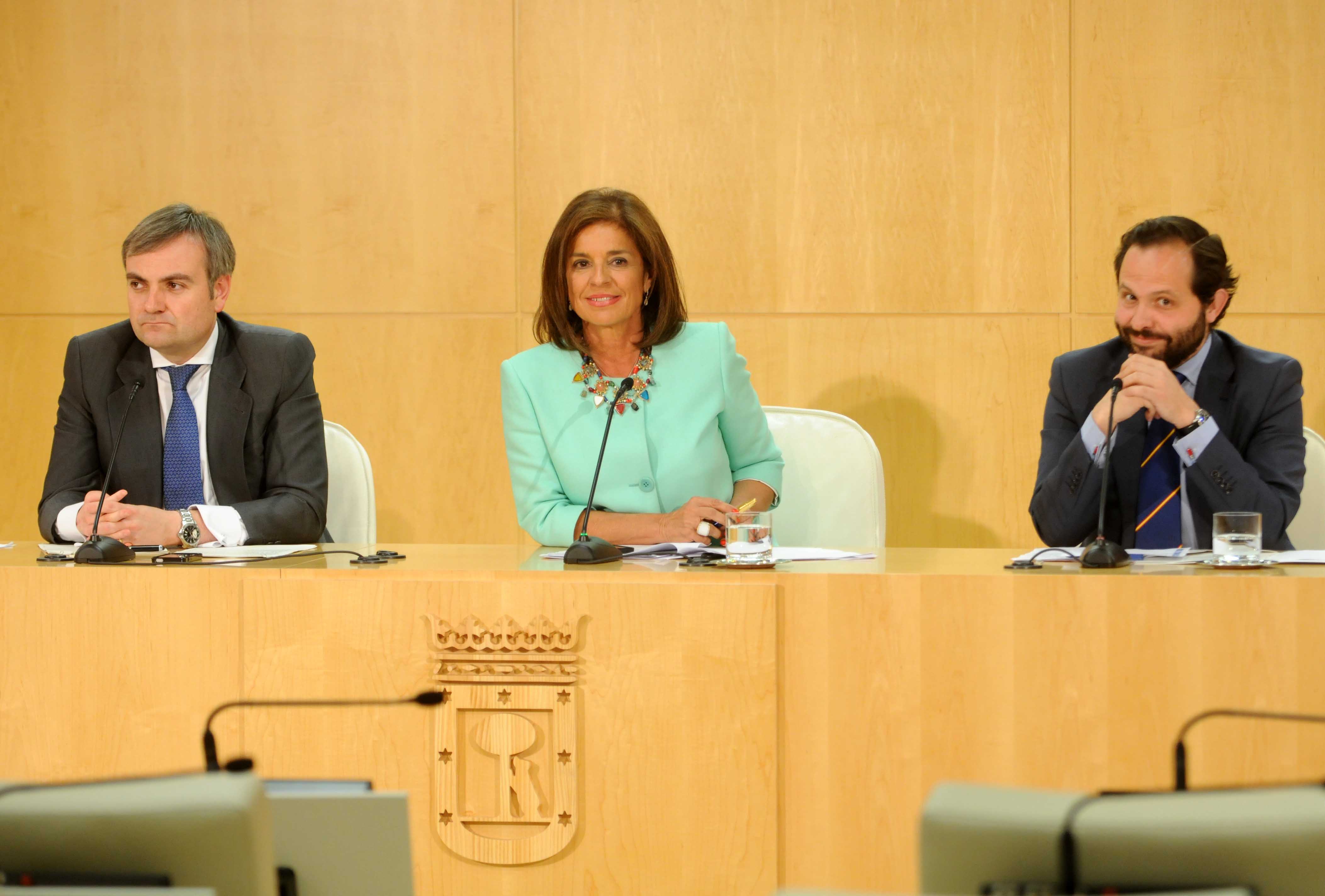 La alcaldesa de Madrid, Ana Botella, en la rueda de prensa posterior a la Junta de Gobierno de la Ciudad de Madrid. Acompañada por el portavoz del Gobierno municipal, Enrique Núñez, y el delegado de Medio Ambiente y Movilidad, Diego Sanjuanbenito, la alcaldesa ha dado cuenta de los asuntos aprobados en la Junta.