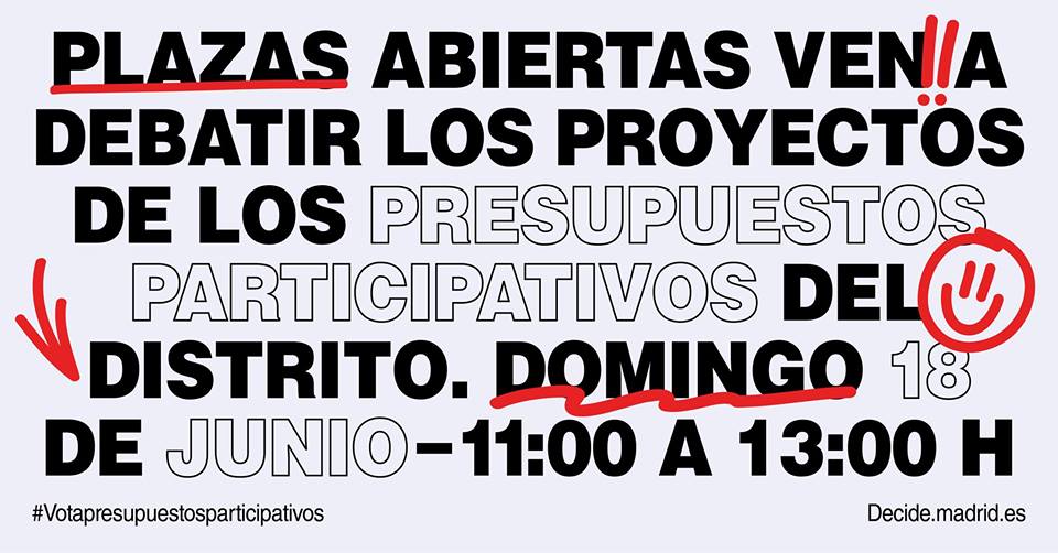 - Los proyectos ciudadanos presentados en los presupuestos participativos de este año inauguran la primera sesión de ‘Plazas Abiertas‘, un acto en el que la ciudadanía participa de las decisiones de la ciudad en un debate abierto. Toda la información: https://decide.madrid.es/plazas-abiertas