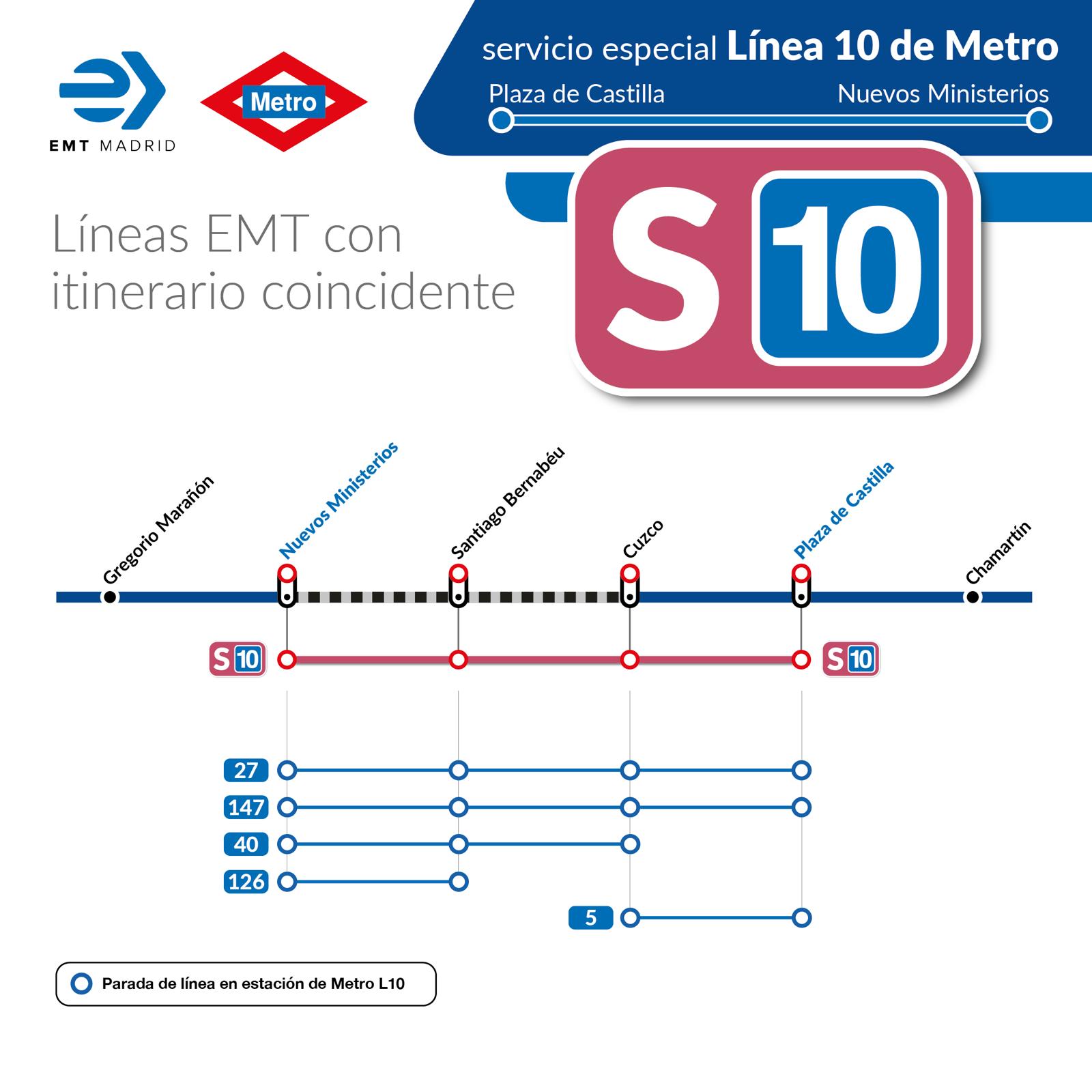 El Ayuntamiento de Madrid pondrá en funcionamiento a través de la Empresa Municipal de Transportes (EMT Madrid) un servicio especial gratuito de autobuses bajo la denominación S10 para enlazar las estaciones de Metro de Plaza de Castilla y Nuevos Ministerios durante las obras que se van a realizar en la L10 del suburbano desde el 28 de marzo y hasta finales de este año. Para garantizar la movilidad en la zona afectada por estos trabajos, EMT Madrid ha programado el despliegue de un máximo de 15 autobuses para sustituir el servicio de la segunda línea más utilizada de la red del suburbano madrileño.