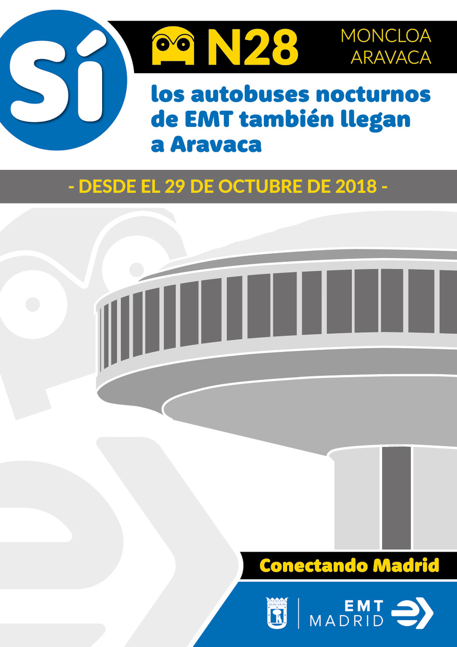 La Empresa Municipal de Transportes de Madrid va a poner en funcionamiento el próximo 29 de octubre la nueva línea nocturna N28 para conectar el intercambiador de Moncloa con Aravaca, un trayecto rápido para un barrio que está cubierto por tres líneas diurnas de EMT: 160 (Moncloa-Aravaca), 161 (Moncloa-Estación de Aravaca) y la 162 (Moncloa-El Barrial).
