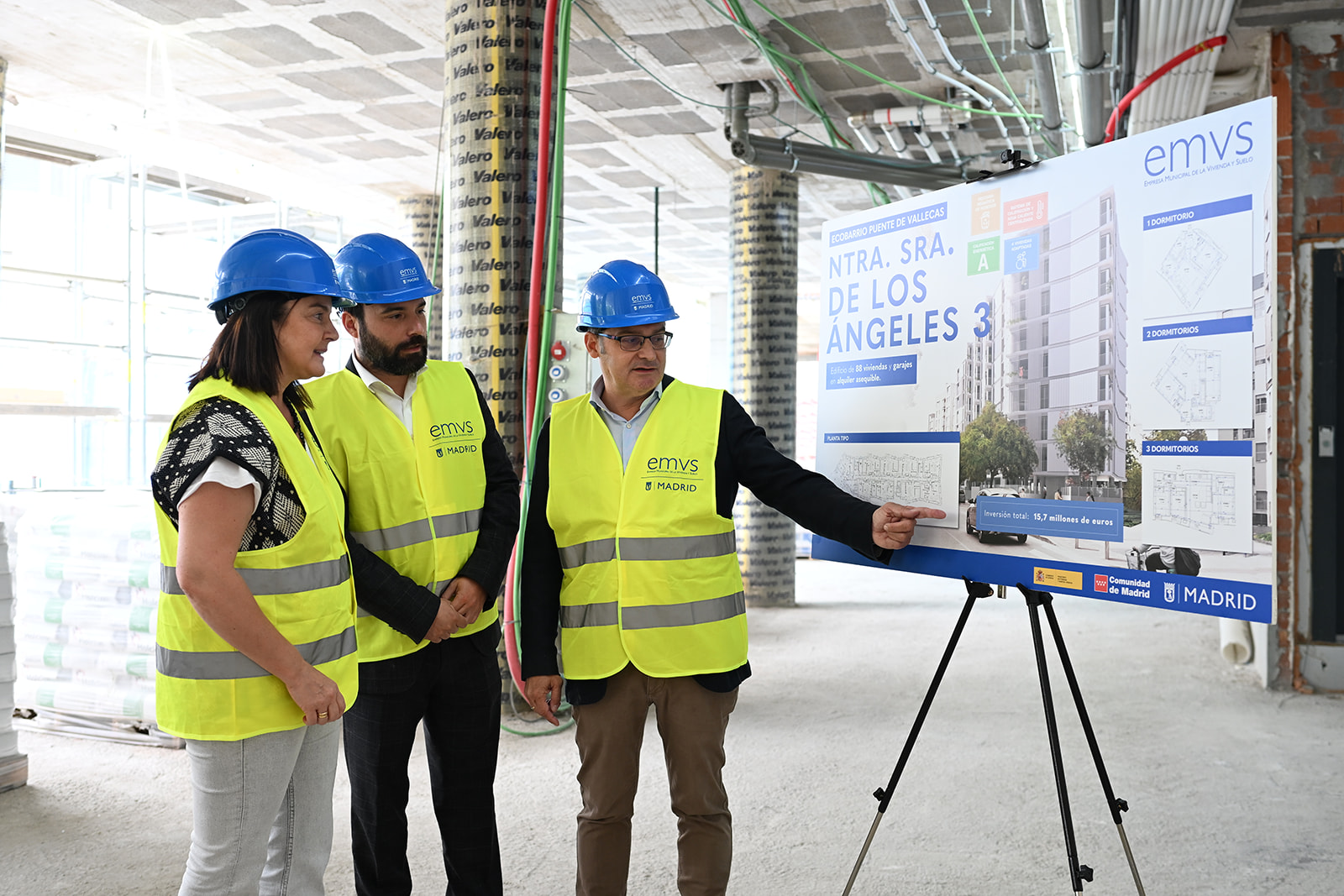 El Ayuntamiento de Madrid, a través de la Empresa Municipal de la Vivienda y Suelo de Madrid (EMVS Madrid), afronta la fase final de la promoción de viviendas Nuestra Señora de los Ángeles 3, ubicada en el ecobarrio de Puente de Vallecas. El delegado de Políticas de Vivienda y presidente de EMVS Madrid, Álvaro González, junto al concejal de Puente de Vallecas, Ángel Niño, ha visitado esta promoción, que contará con 88 viviendas públicas de alquiler asequible que se pondrán a disposición de los madrileños en el próximo año.