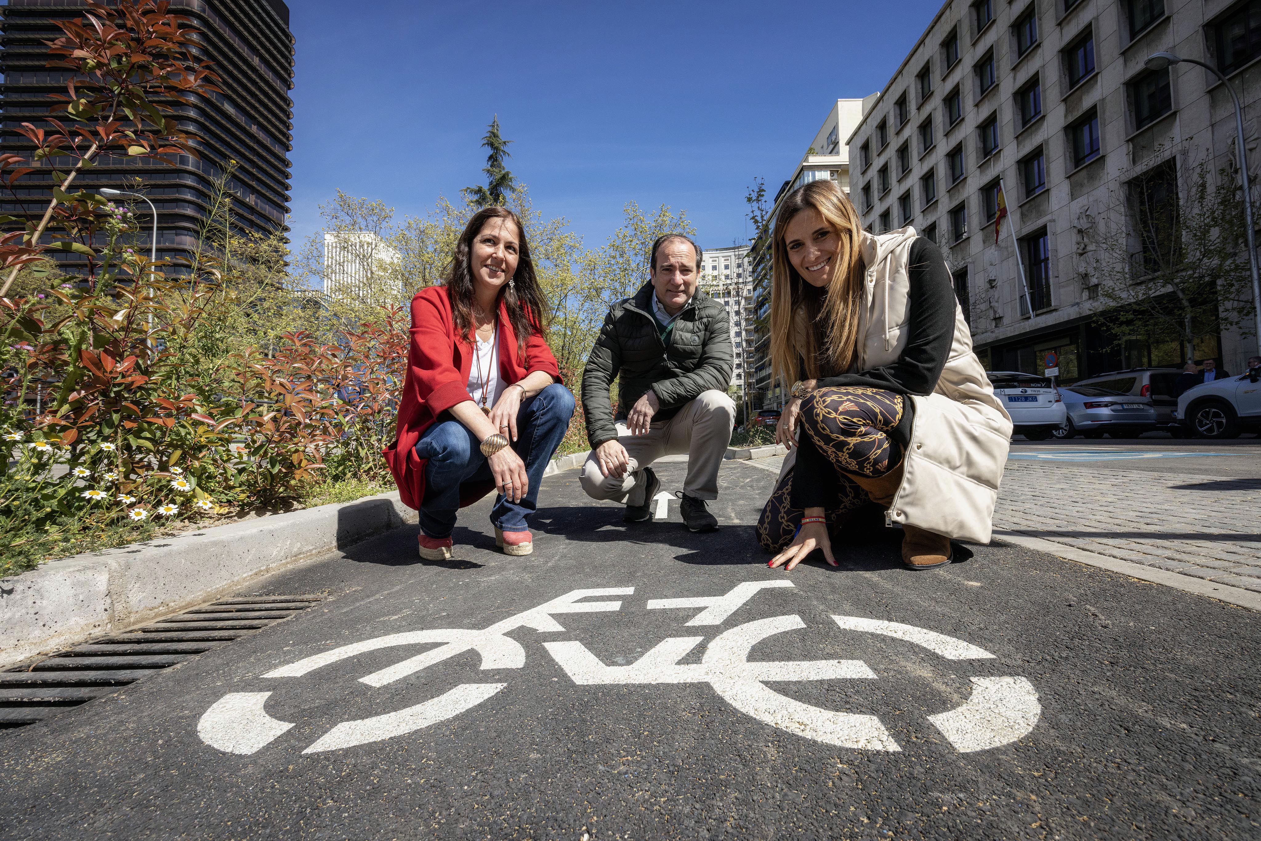 Borja Carabante, Blanca Pinedo y Sonia Cea en el nuevo carril bici de Castellana