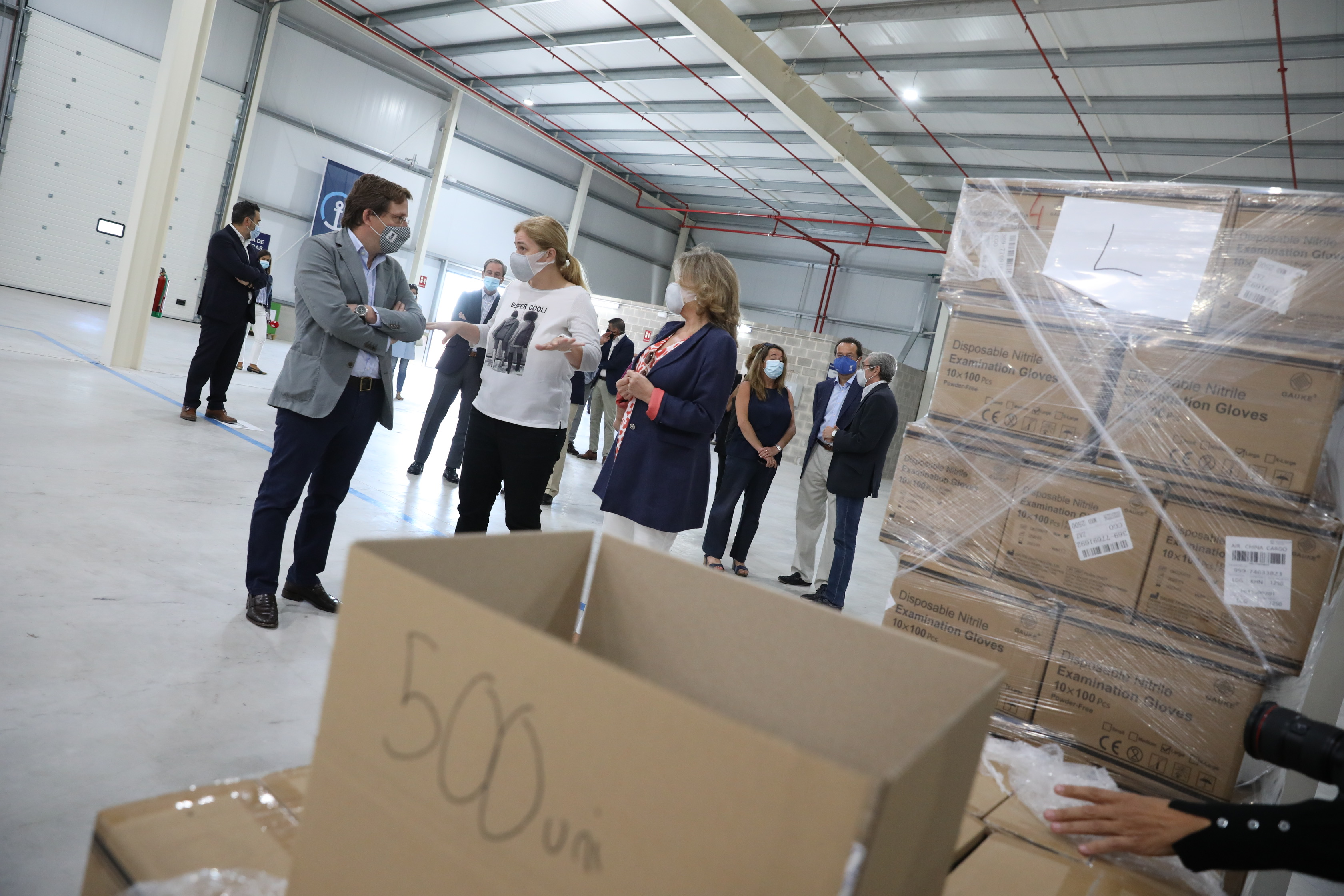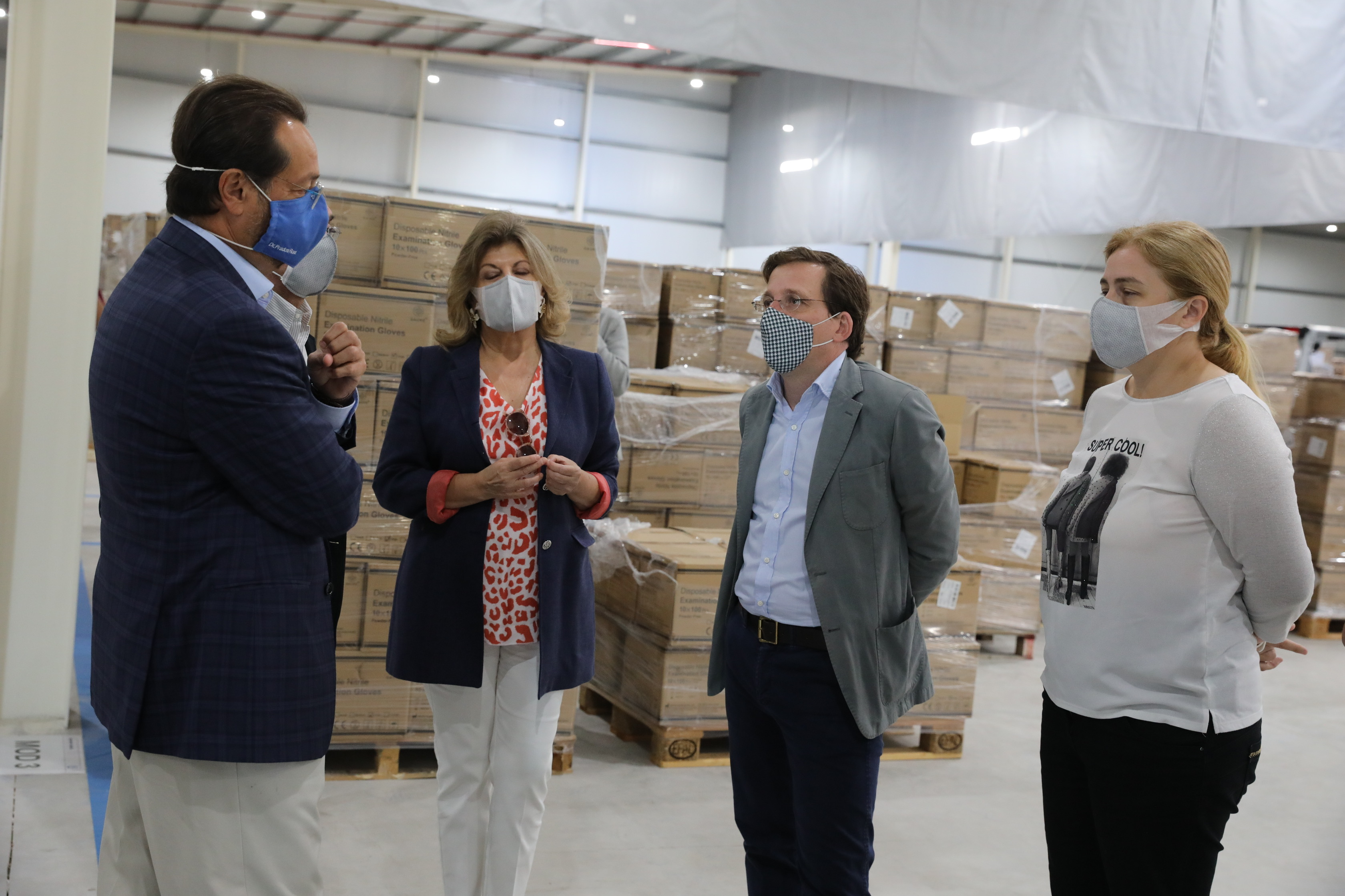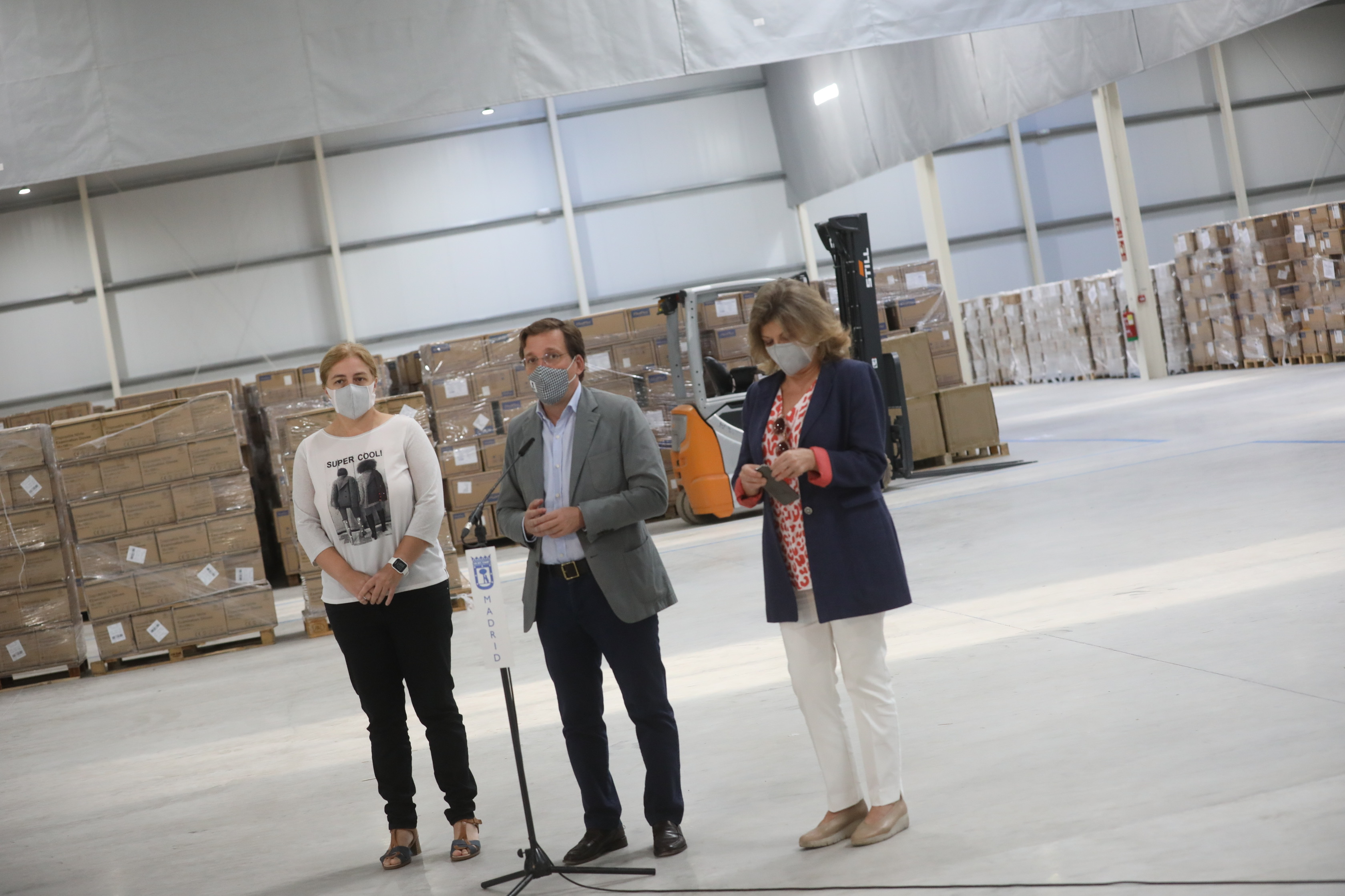 El alcalde de Madrid, José Luis Martínez-Almeida, acompañado de la delegada del Área de Seguridad y Emergencias y portavoz municipal, Inmaculada Sanz, y la delegada de Hacienda, Engracia Hidalgo, ha visitado esta mañana el almacén permanente de Vicálvaro donde el Ayuntamiento guarda todo el material de protección contra la COVID-19 para repartirlo entre los distintos servicios municipales que lo requieran.