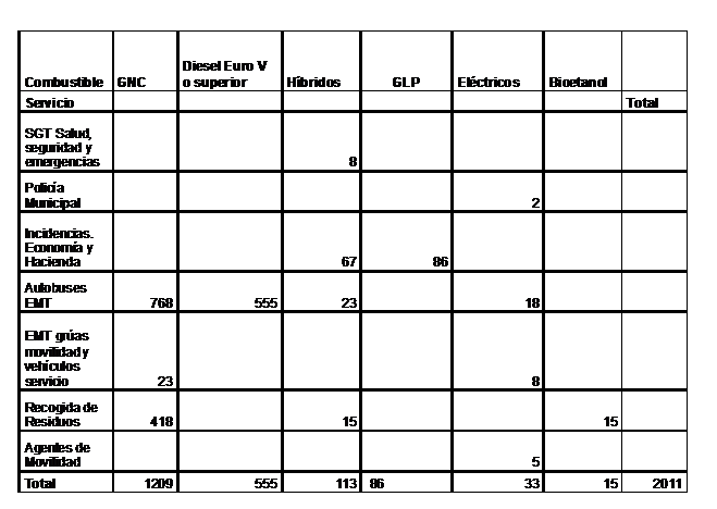 Del total de vehículos del Ayuntamiento, 2011 son ‘flota verde’: 1209 vehículos de gas natural comprimido (GNC), 555 diésel Euro V o superior, que cumplen la especificación de 'menos contaminante', 113 híbridos, 86 de gas licuado del petróleo (GLP), 33 eléctricos y 15 de bioetanol.