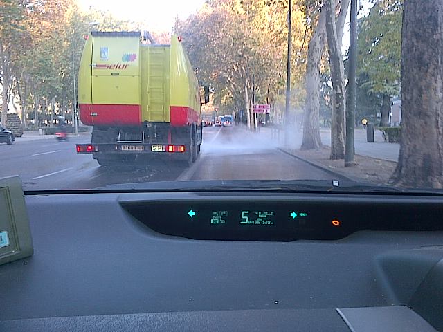 El episodio de contaminación que afecta a Madrid está producido por altos niveles de dióxido de nitrógeno, pero también han subido los índices de partículas en suspensión. Estas actuaciones de regado intensivo de calles limpian las partículas depositadas en el suelo y evitan que vuelvan al aire al paso de los vehículos./