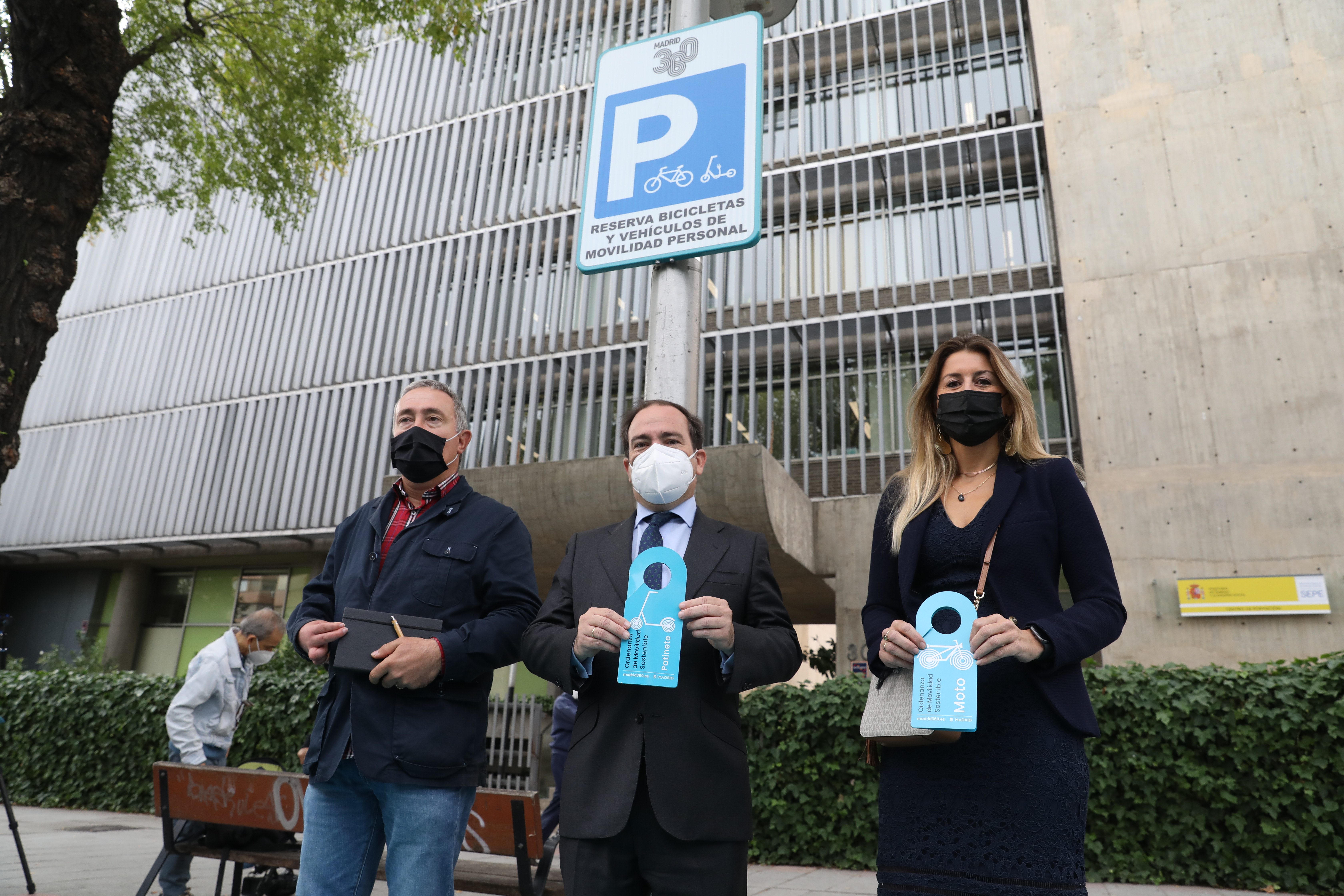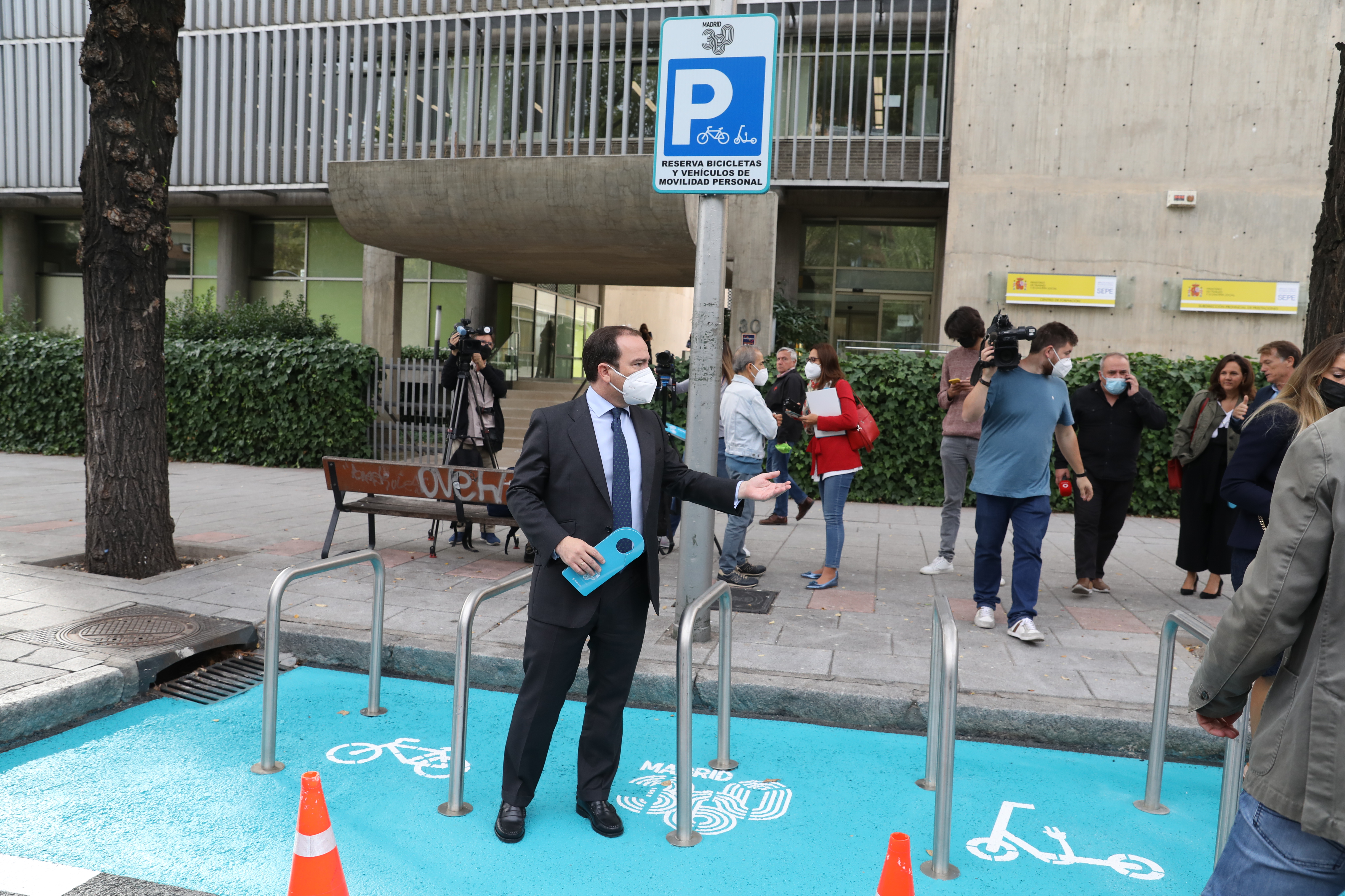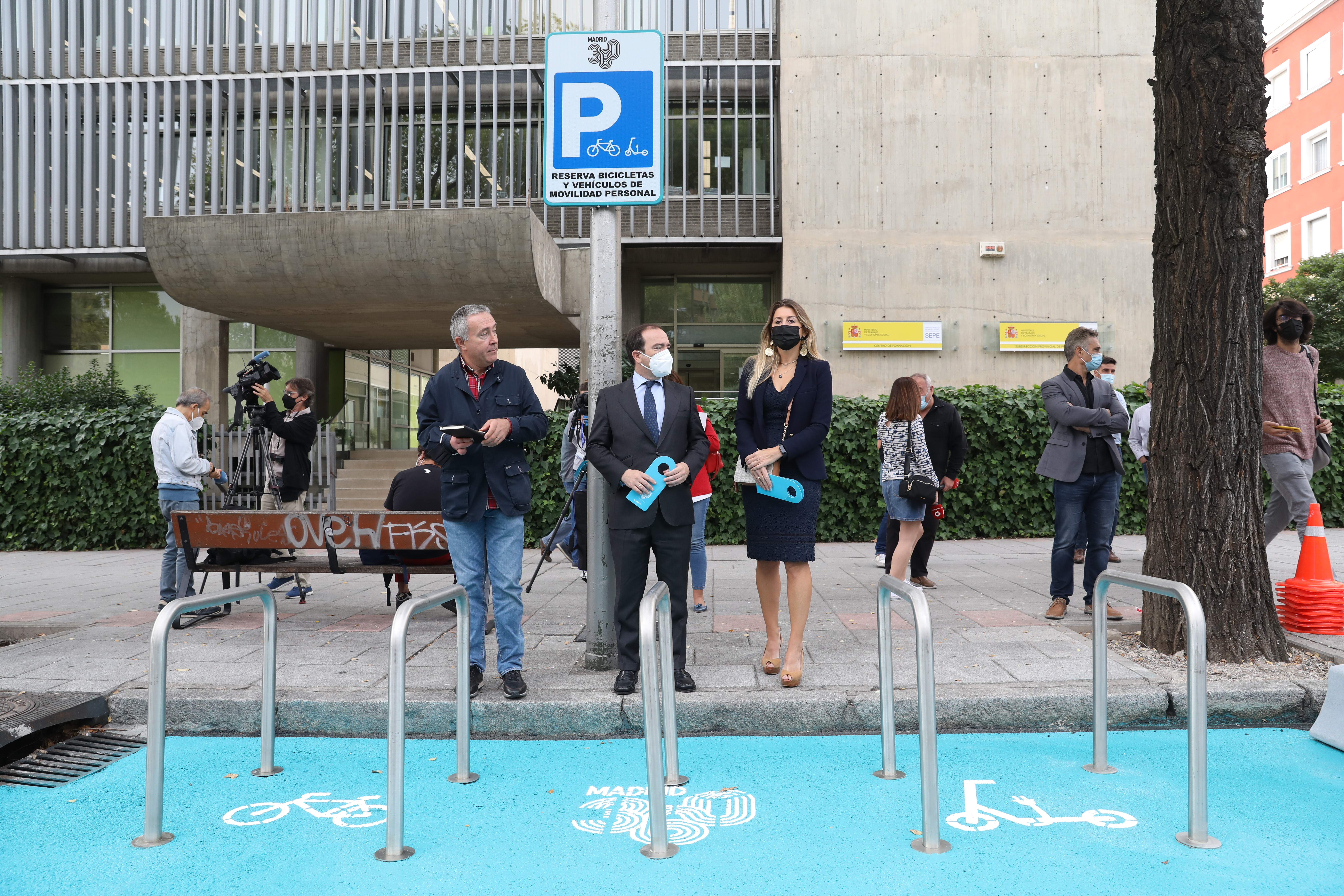 Con el objetivo de liberar las aceras y garantizar la accesibilidad global en todas las zonas peatonales, el delegado del Área de Medio Ambiente y Movilidad, Borja Carabante, ha inaugurado esta mañana una nueva reserva para el estacionamiento de bicicletas y patinetes en calzada. Los usuarios de estos vehículos cuentan desde hoy con una nueva parada de aparcamiento en el número 30 de la calle Costa Rica, en Chamartín, compuesta por cinco horquillas con capacidad para diez vehículos. Son diez de las 610 nuevas plazas para bicis y Vehículos de Movilidad Personal (VMP) que quedarán habilitadas en octubre en 17 distritos: Arganzuela, Barajas, Carabanchel, Centro, Chamartín, Chamberí, Ciudad Lineal, Fuencarral-El Pardo, Hortaleza, Latina, Moncloa-Aravaca, Retiro, Salamanca, San Blas-Canillejas, Usera y Villaverde.