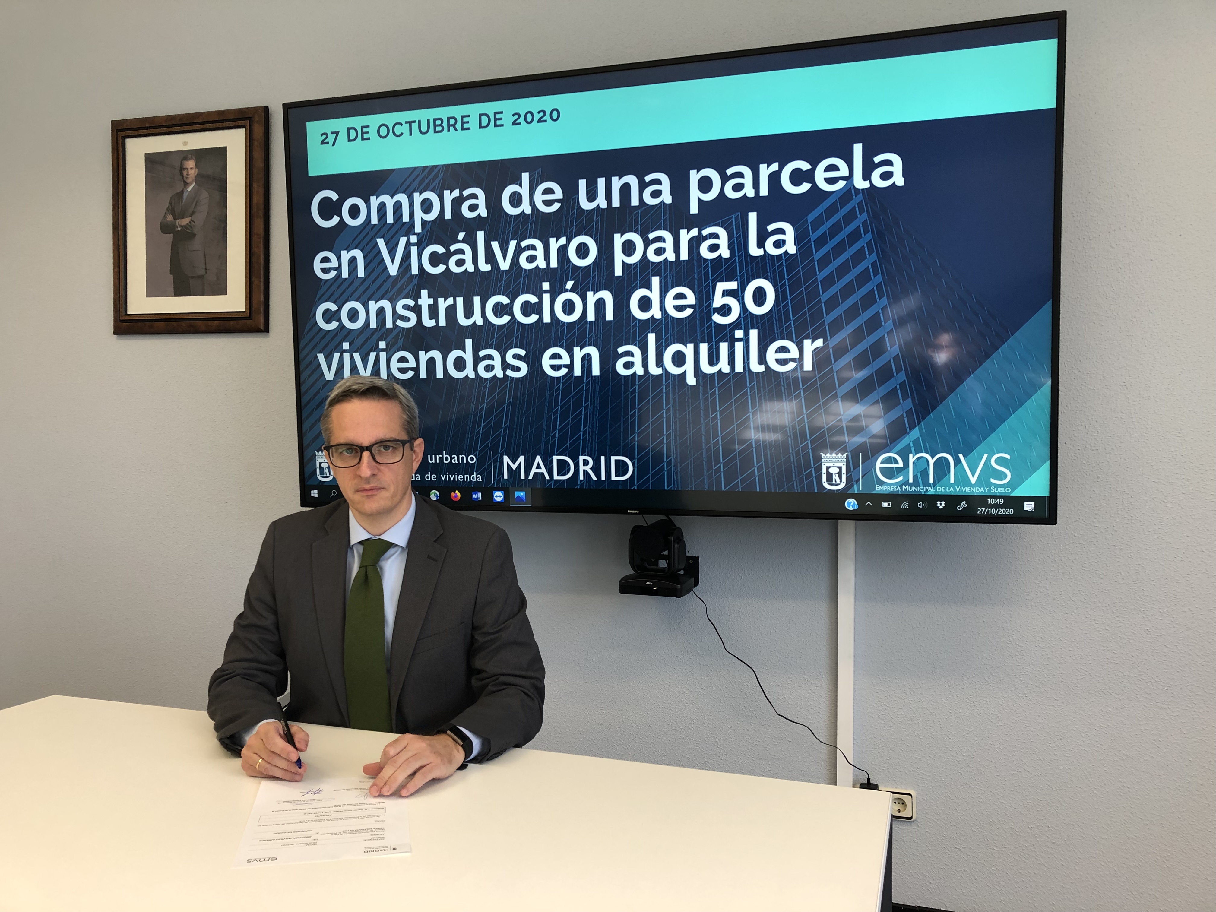 El Ayuntamiento de Madrid, a través de la Empresa Municipal de la Vivienda y Suelo (EMVS), sigue sumando proyectos para incrementar el parque de vivienda protegida de la capital. La empresa pública ha firmado este martes la compra de una parcela para poder construir en ella 50 nuevos pisos públicos en alquiler. Estos terrenos, ubicados junto al Parque Forestal del distrito de Vicálvaro, son colindantes a otra parcela que también acaba de adquirir la EMVS para levantar otras 20 viviendas.