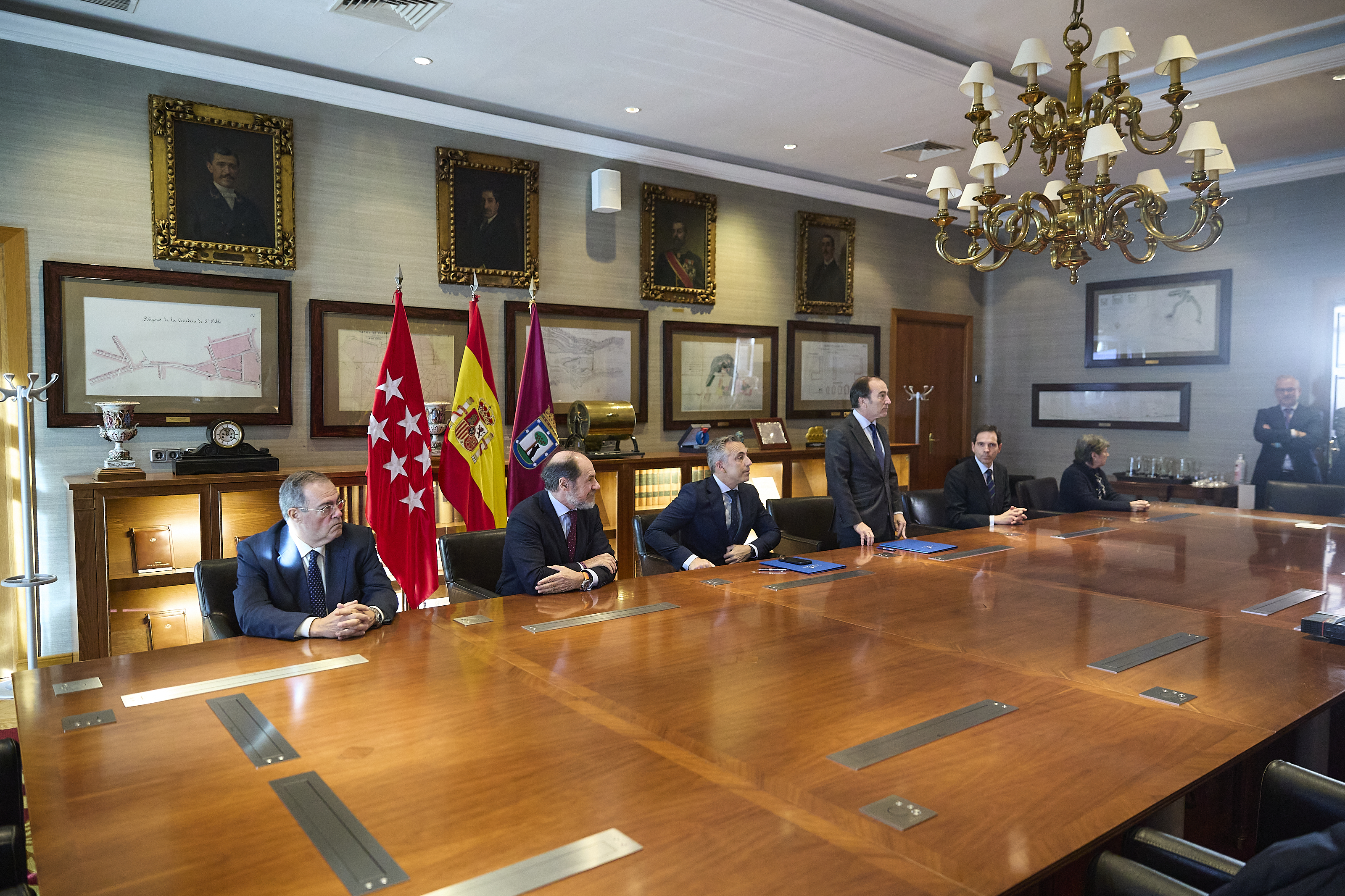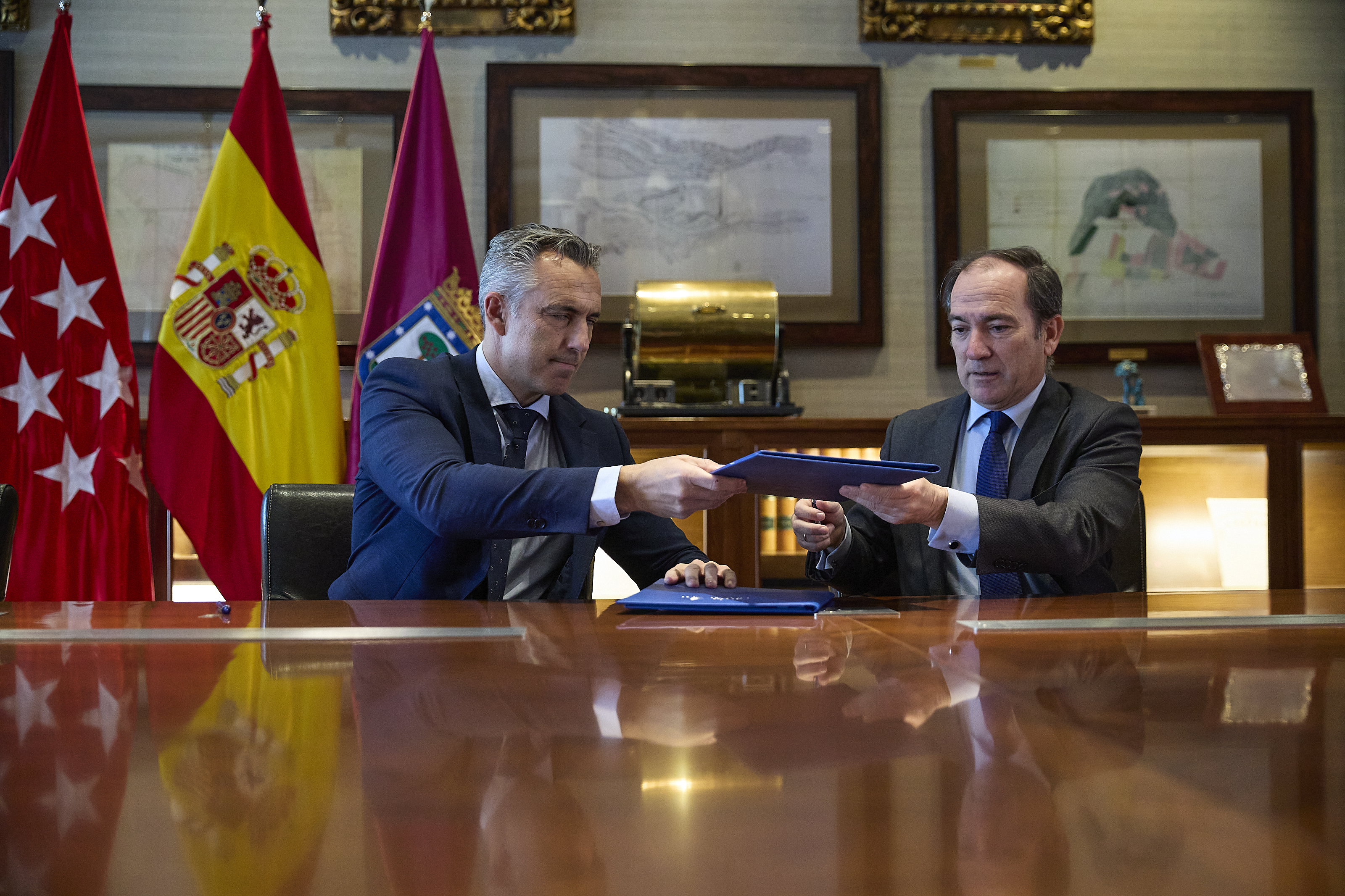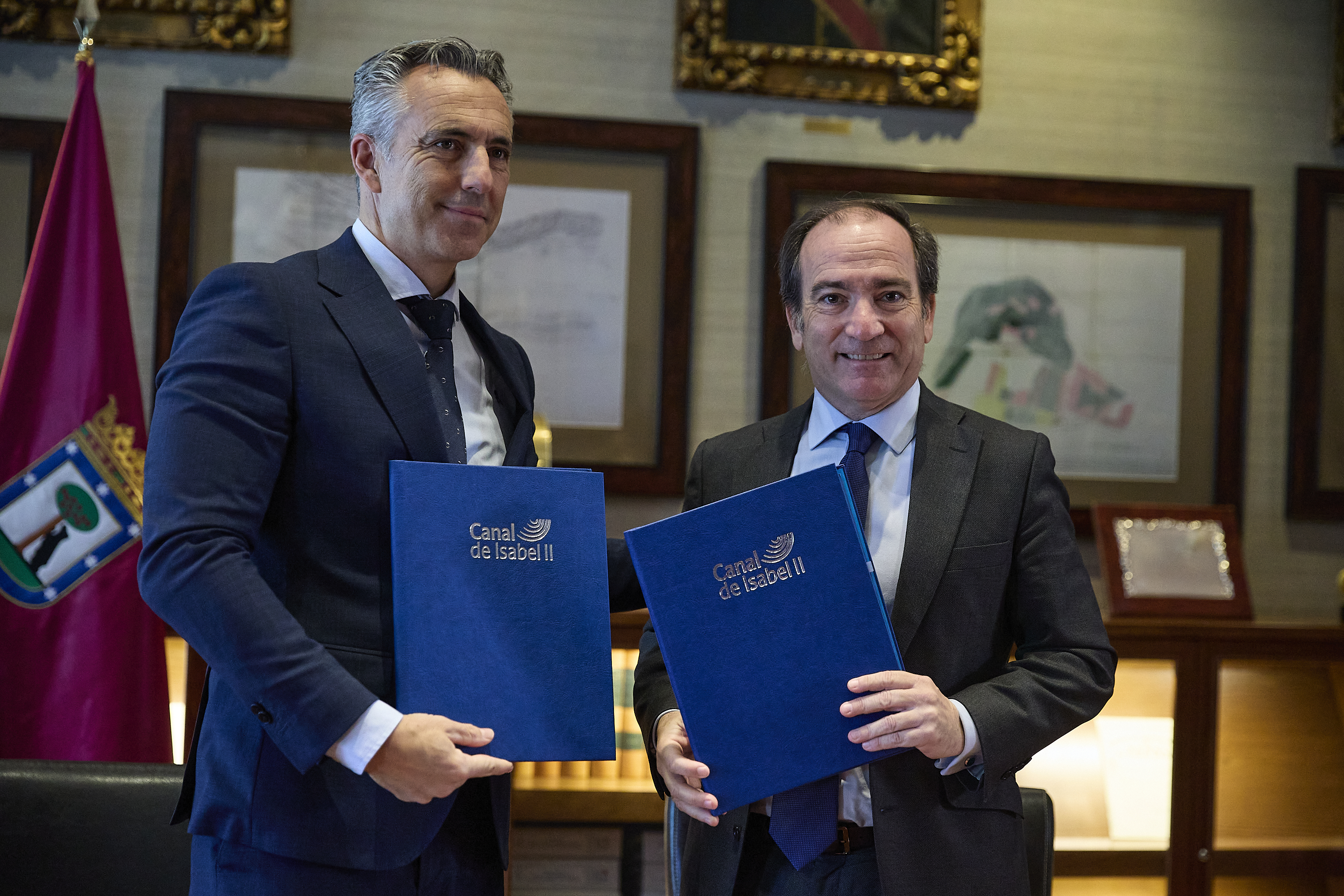 El delegado de Urbanismo, Medio Ambiente y Movilidad, Borja Carabante, y el consejero de Medio Ambiente, Agricultura e Interior de la Comunidad de Madrid, Carlos Novillo, han firmado este lunes el protocolo de actuación entre ambas administraciones para la ejecución y financiación de las obras hidráulicas necesarias en las depuradoras de La China, Butarque y Sur. El Consistorio de la capital y el Gobierno regional acuerdan de esta forma, junto con el Canal de Isabel II, colaborar en esta dirección y en el avance de todas aquellas actuaciones que sean necesarias para asegurar una prestación adecuada de los servicios de saneamiento, que comprenden alcantarillado y depuración.