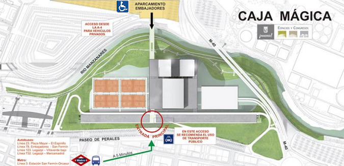 - Se recomienda la utilización del metro, Cercanías-Renfe y autobuses de la EMTpara acceder a la Caja Mágica